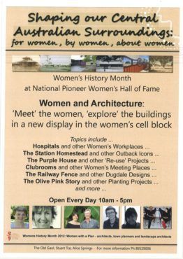 Launched as part of Women's History Month 2012, the exhibition Shaping our Central Australian Surroundings: for women, by women, about women explored some of the many different ways in which women have influenced the development of the built environment of Alice Springs, and Central Australia generally.
