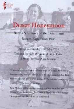 This evocative exhibition tells the story of Bertha Strehlow's honeymoon journey. The story of Bertha is captured in Leni Shilton's poetry and shown alongside the original panels which were the poems' inspiration. On display until Tuesday 20 September 2016.