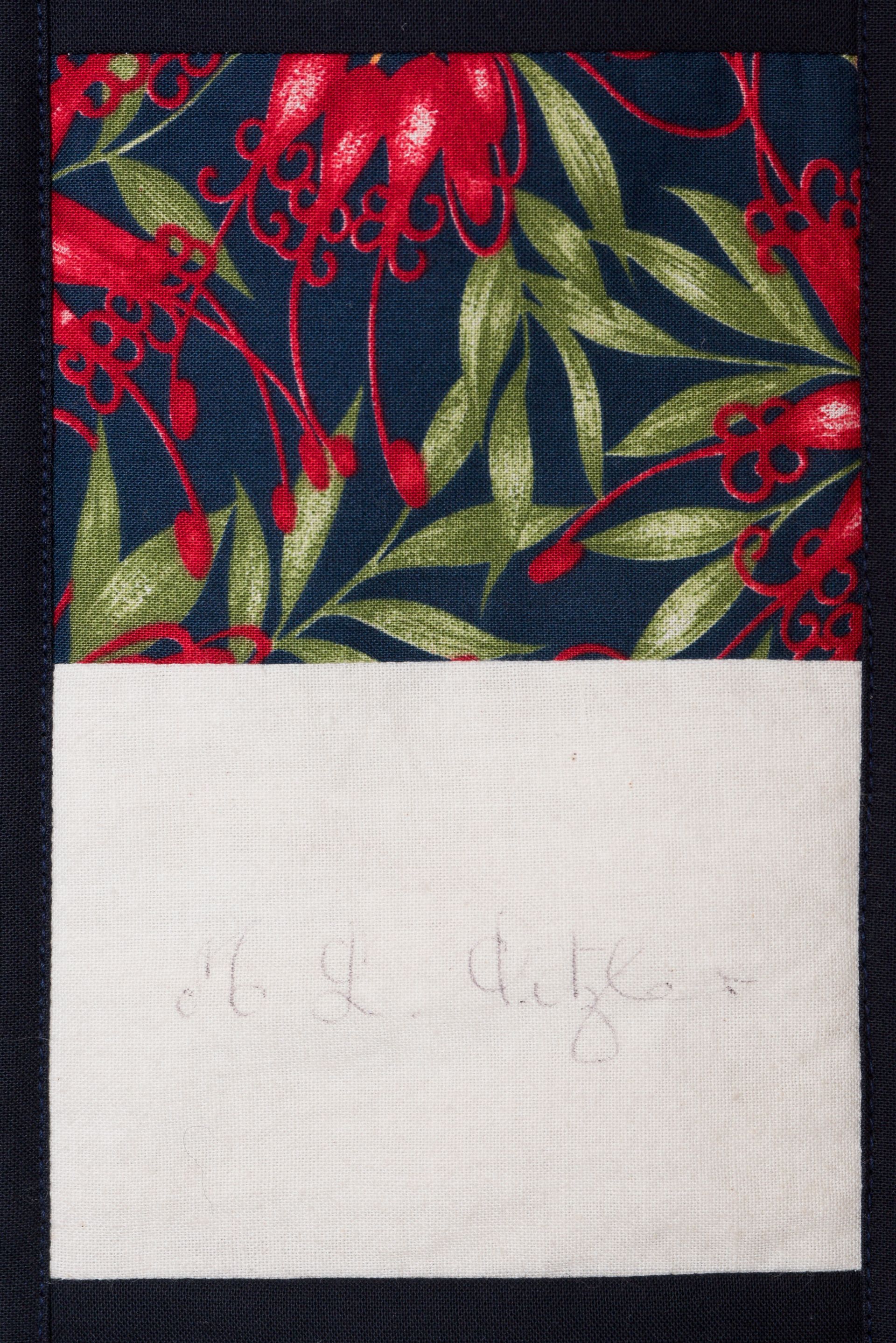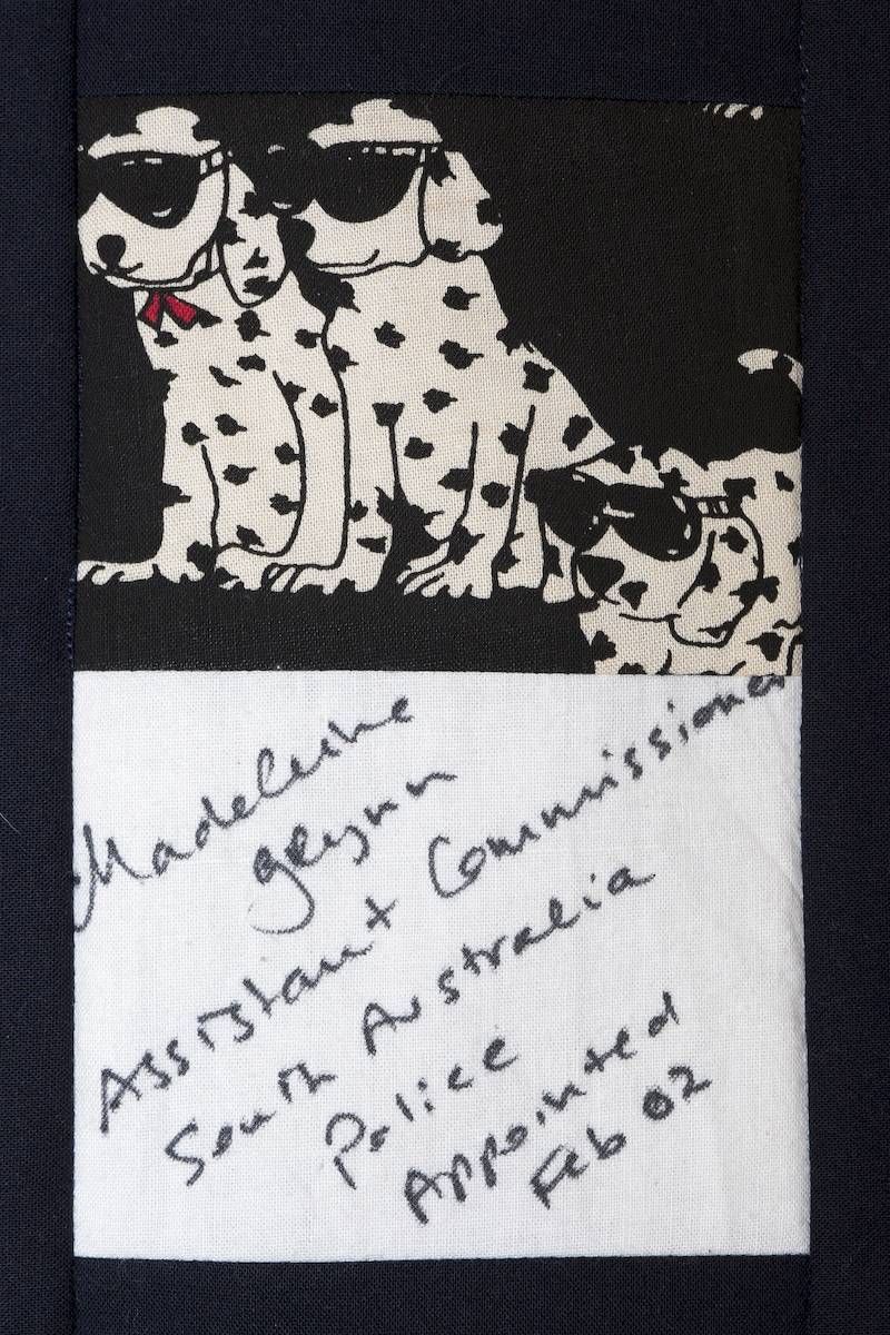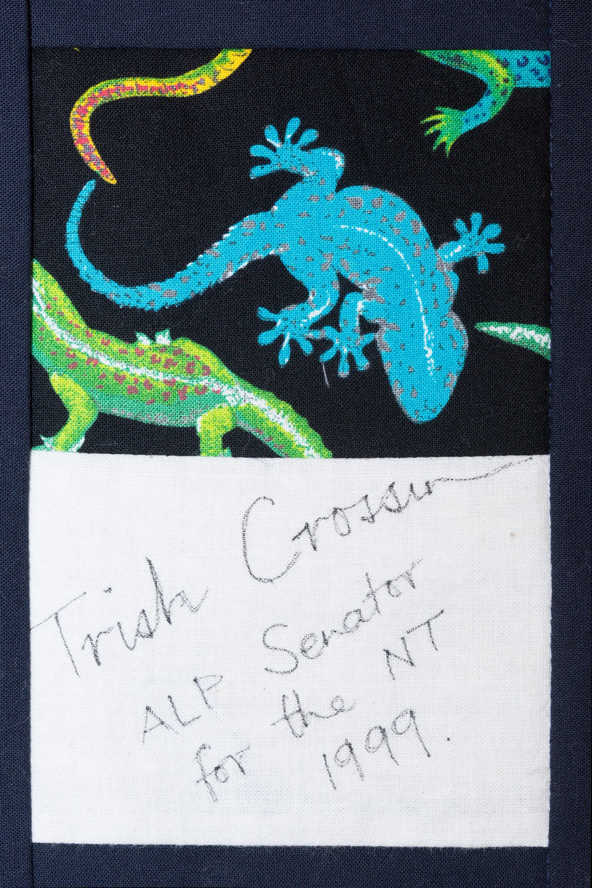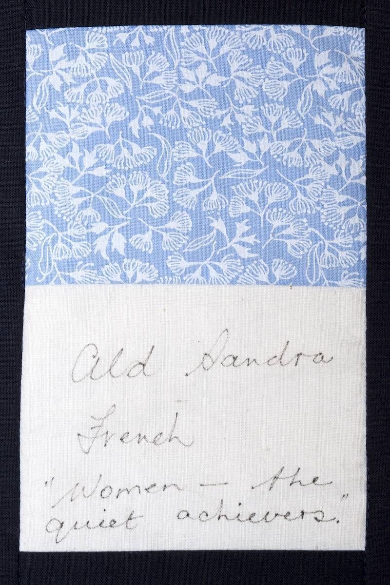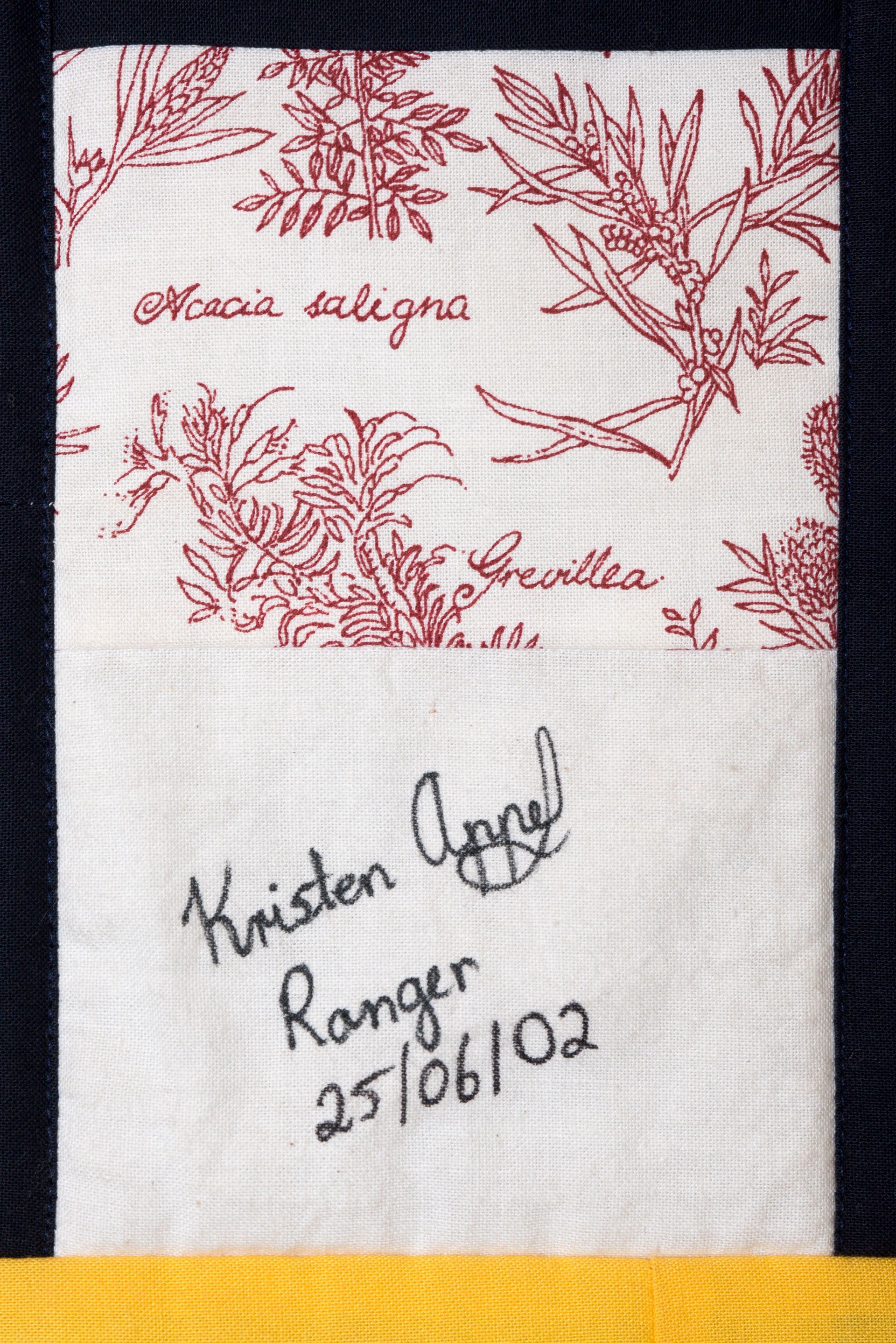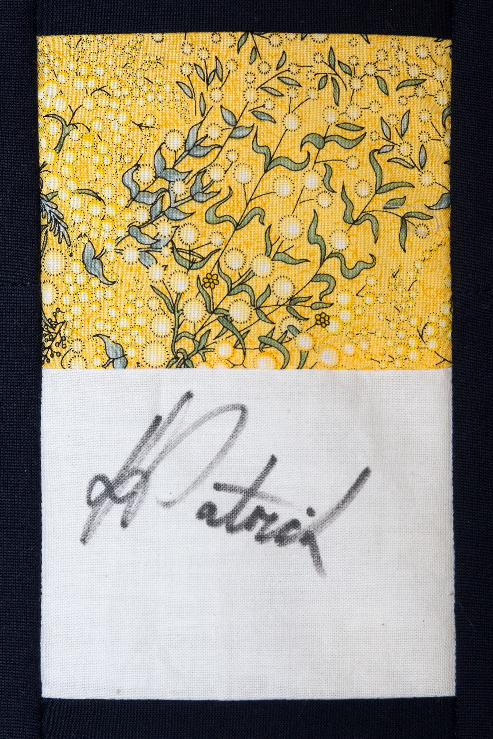The calico rectangles are signed by Australian women who have recorded firsts or significant achievements in their fields of endeavour. The alternate patches of patterned fabric were selected to illustrate the signatories profession or achievement.