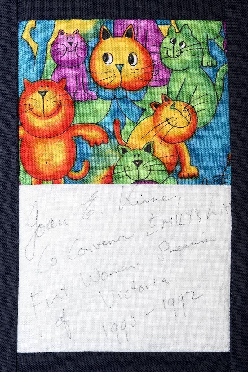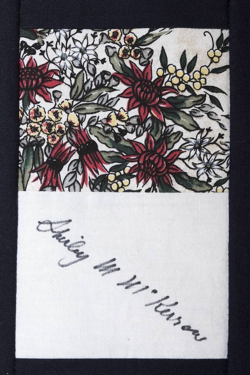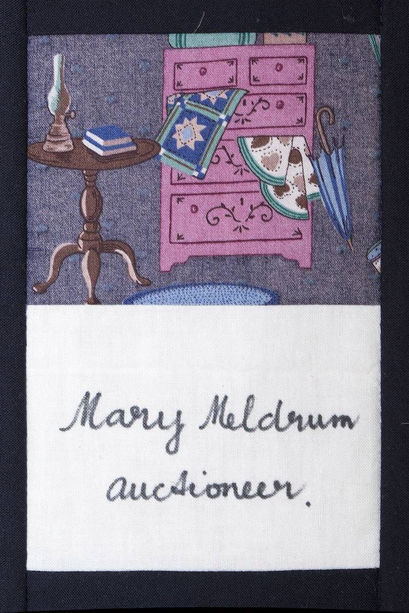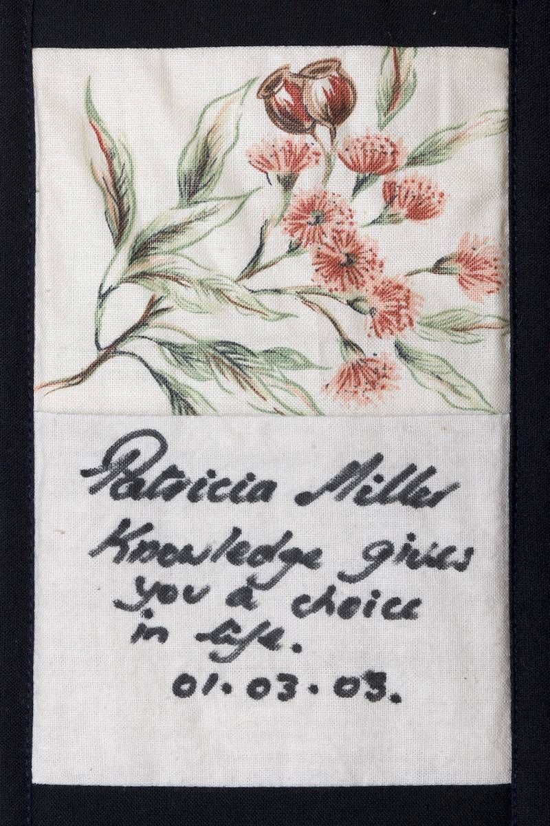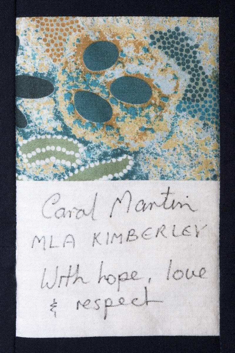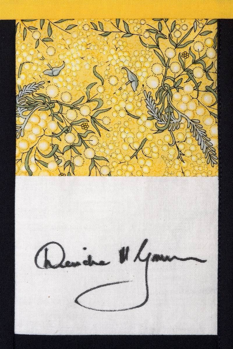 The calico rectangles are signed by Australian women who have recorded firsts or significant achievements in their fields of endeavour. The alternate patches of patterned fabric were selected to illustrate the signatories profession or achievement.