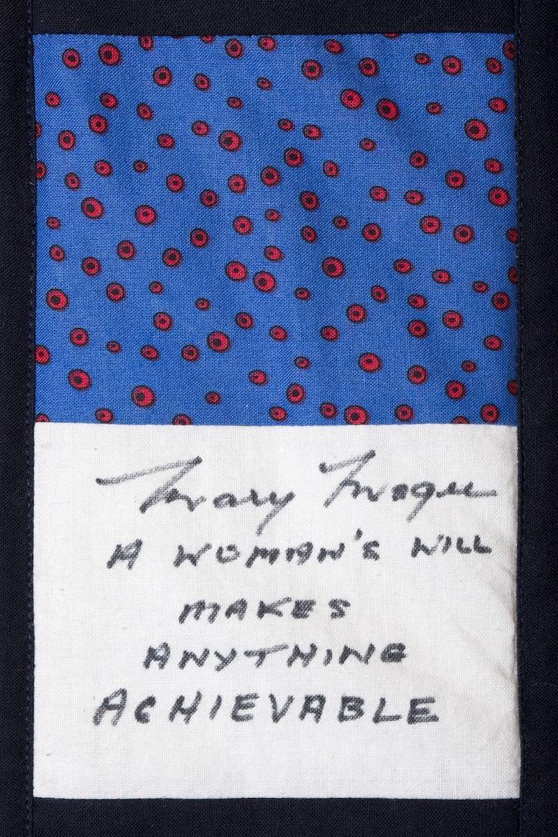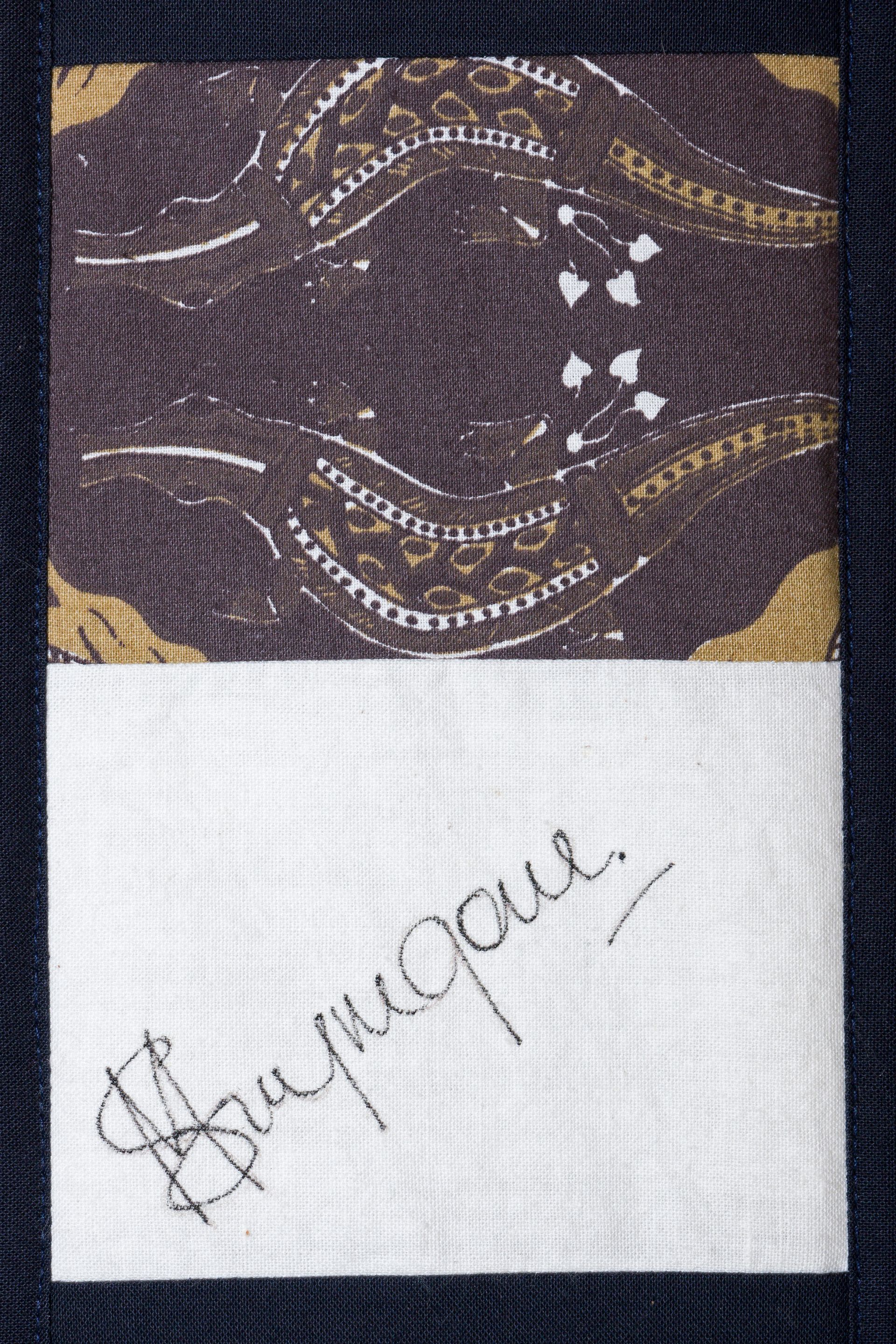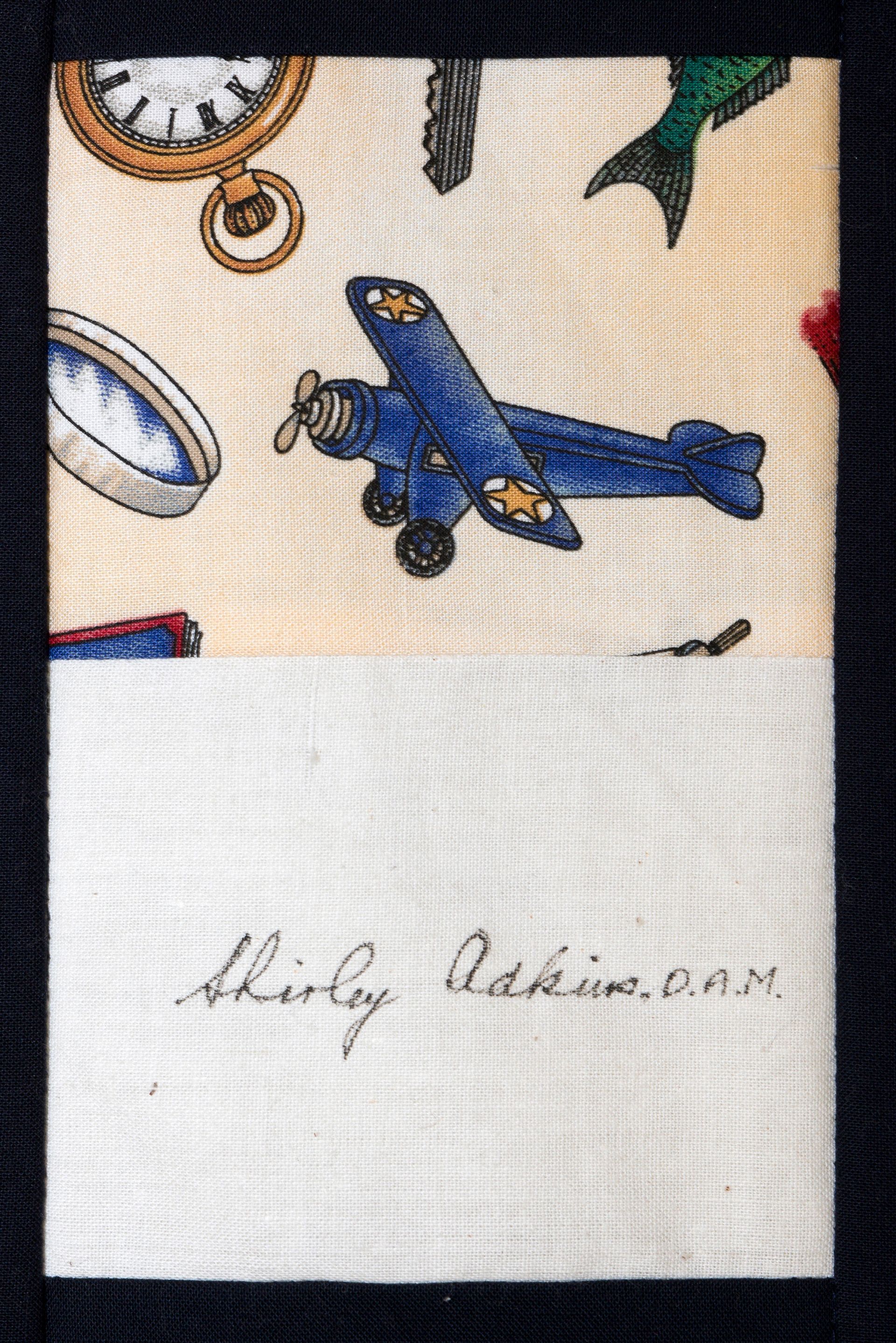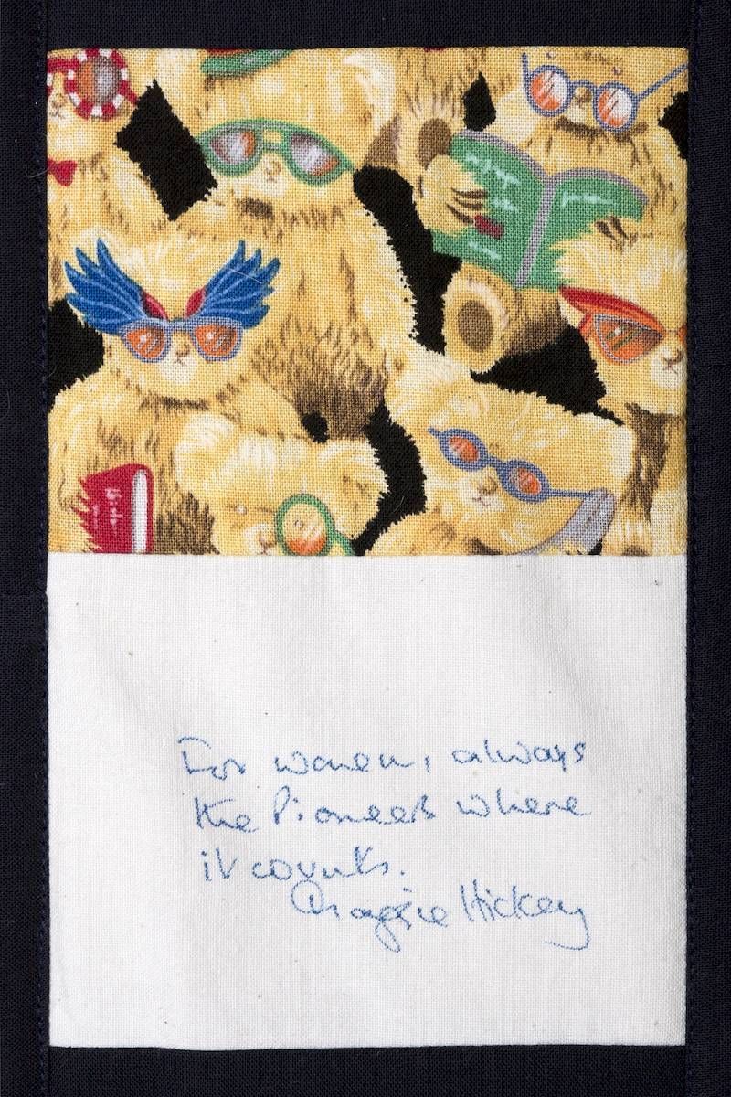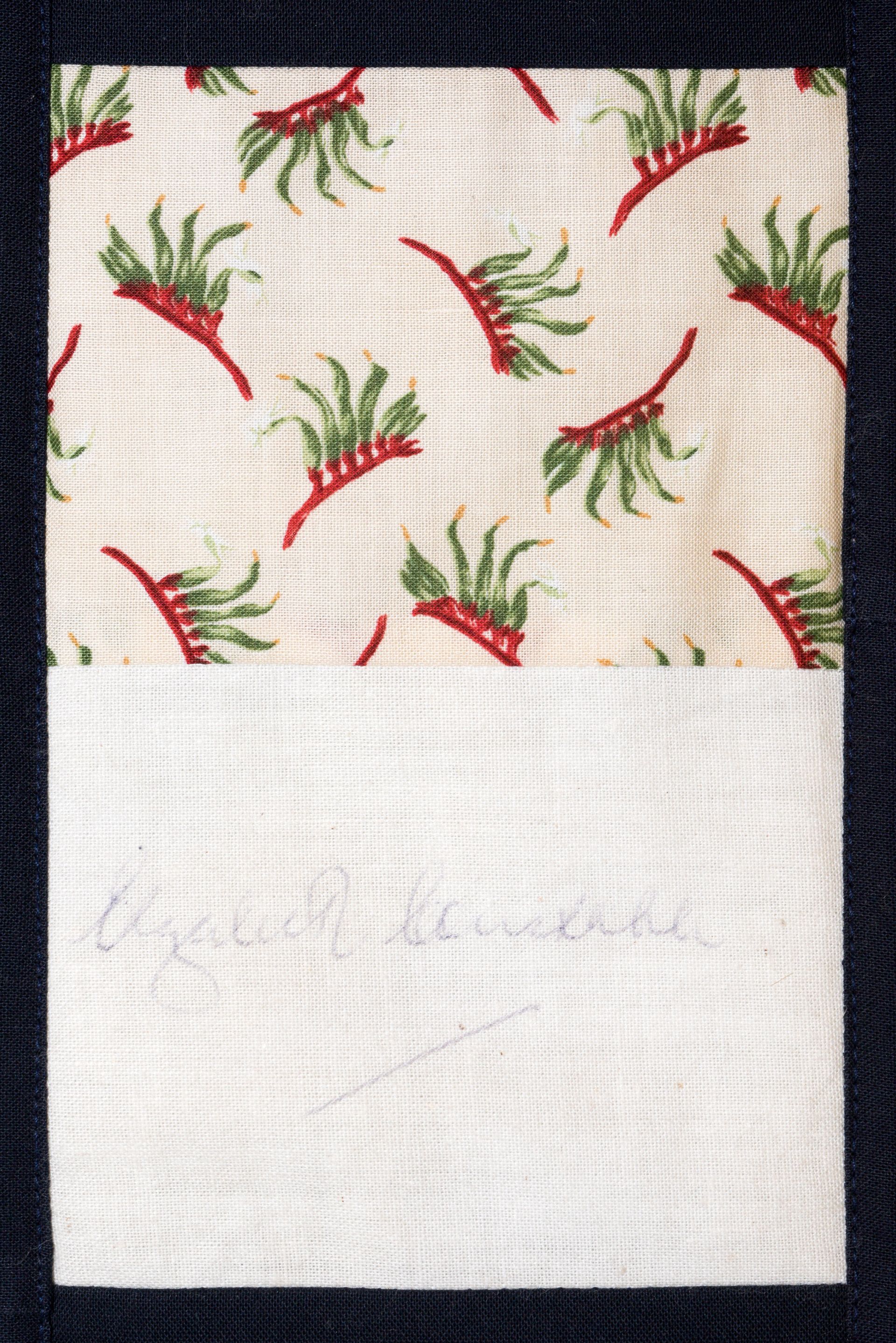 The calico rectangles are signed by Australian women who have recorded firsts or significant achievements in their fields of endeavour. The alternate patches of patterned fabric were selected to illustrate the signatories profession or achievement.