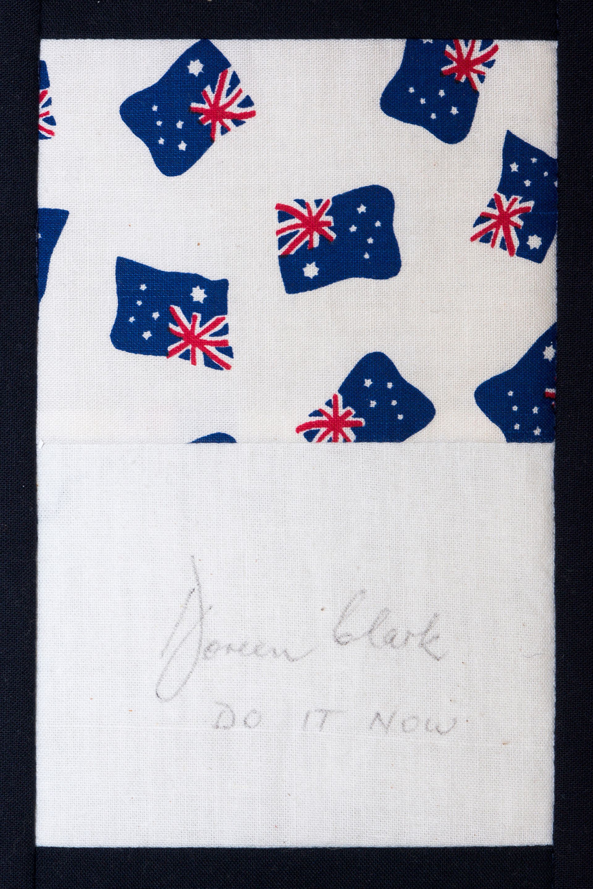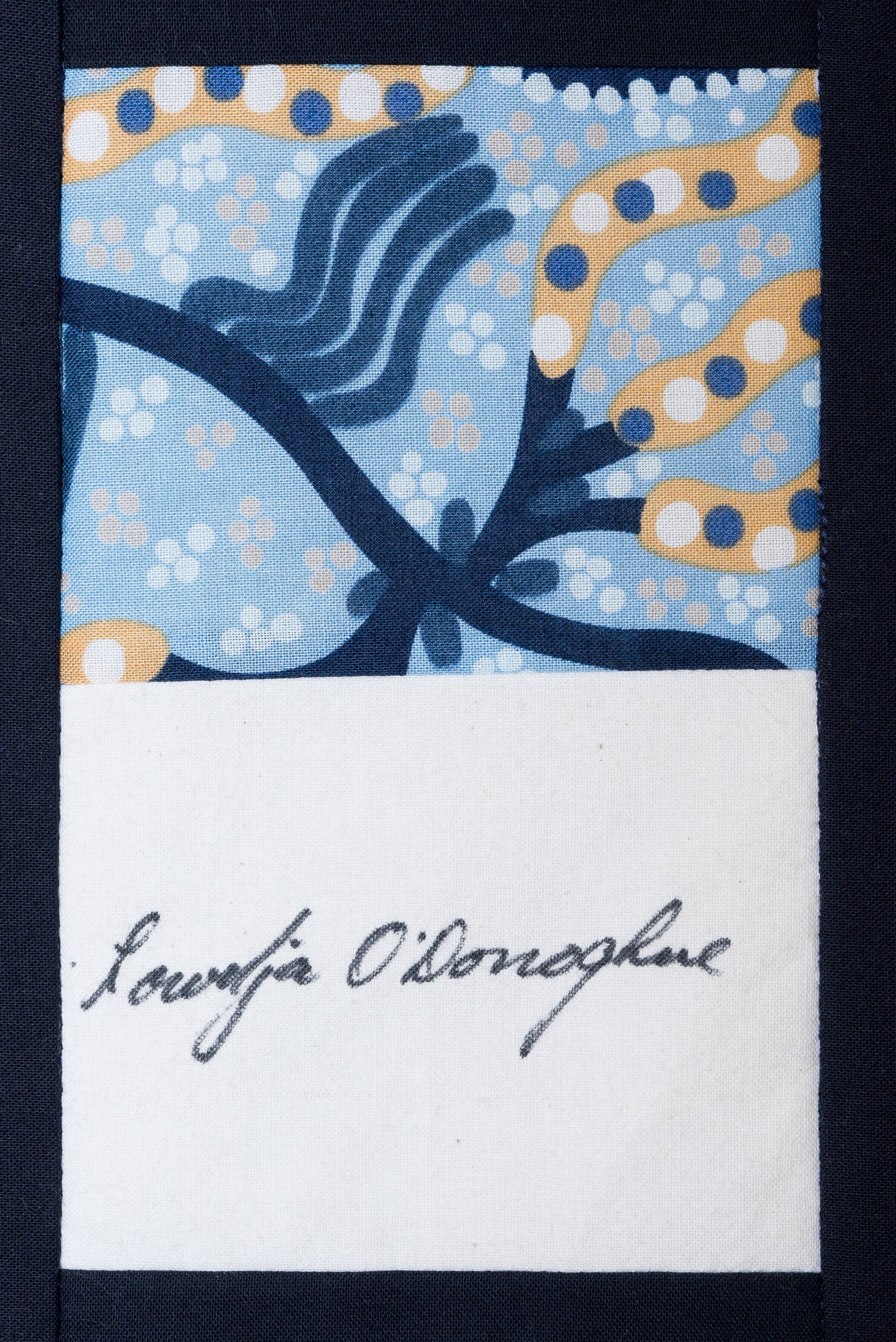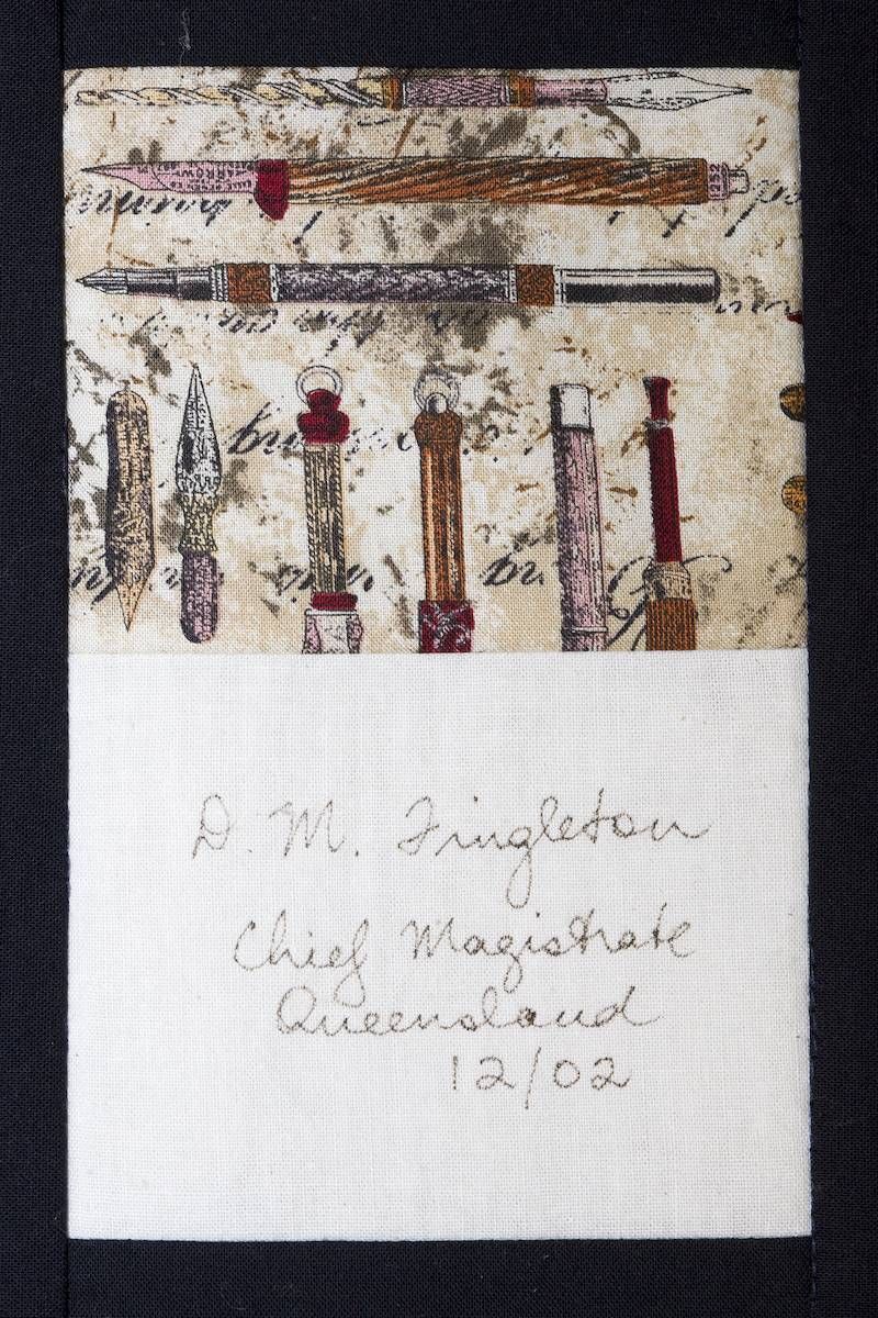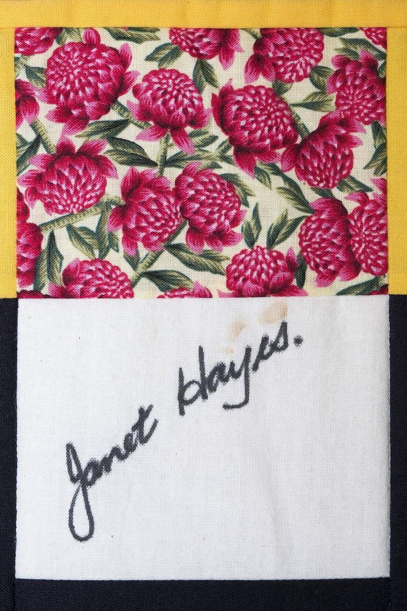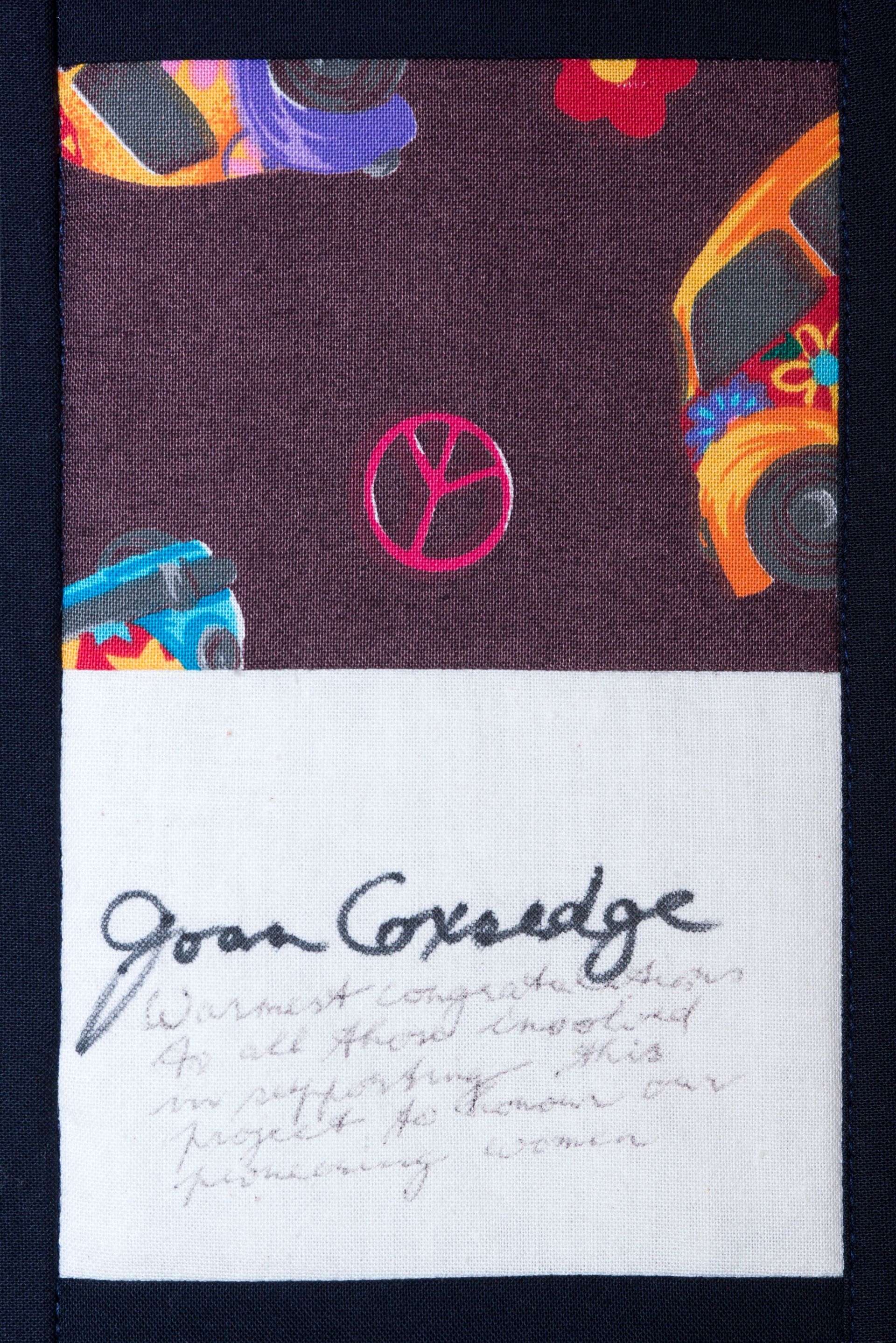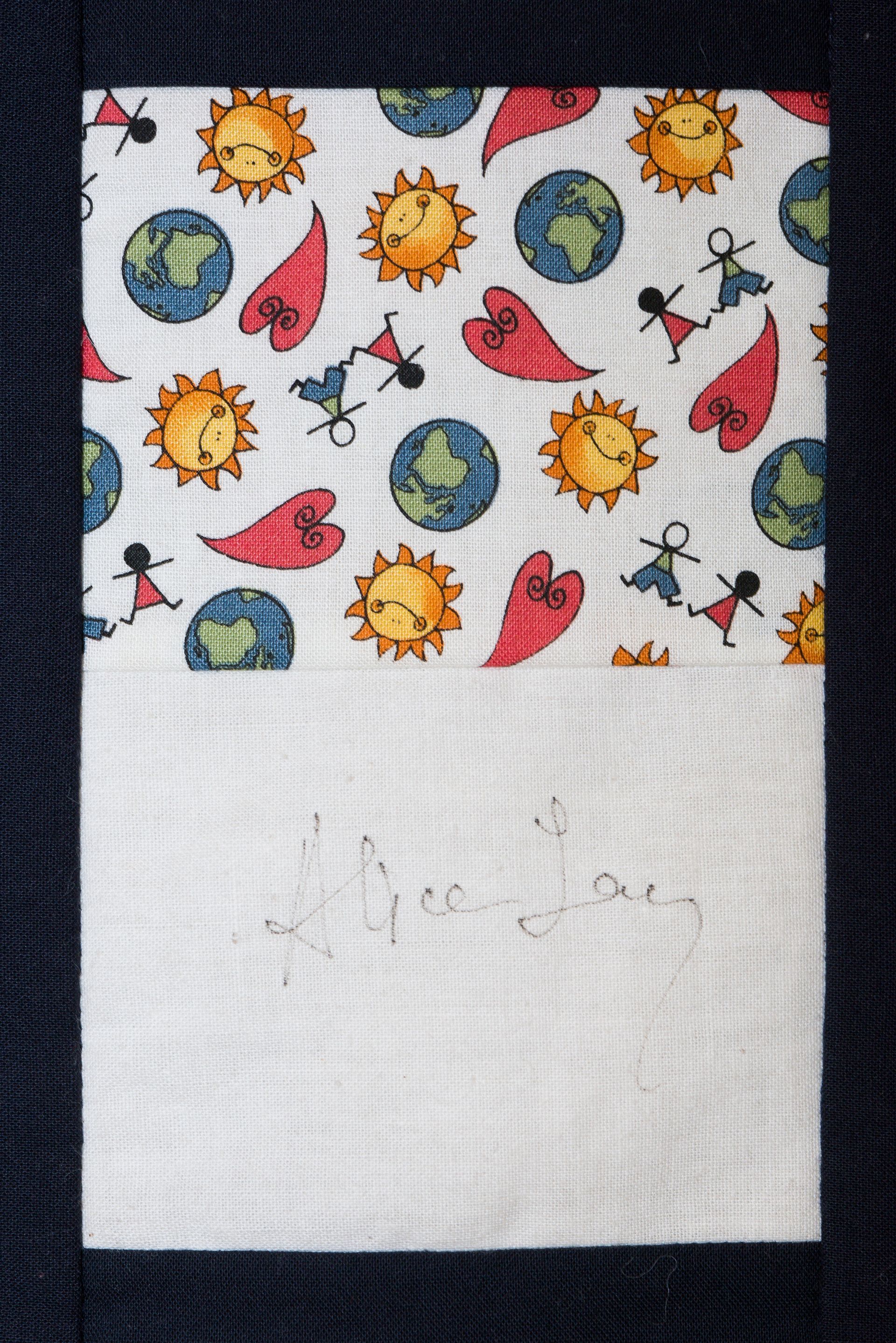 The calico rectangles are signed by Australian women who have recorded firsts or significant achievements in their fields of endeavour. The alternate patches of patterned fabric were selected to illustrate the signatories profession or achievement.