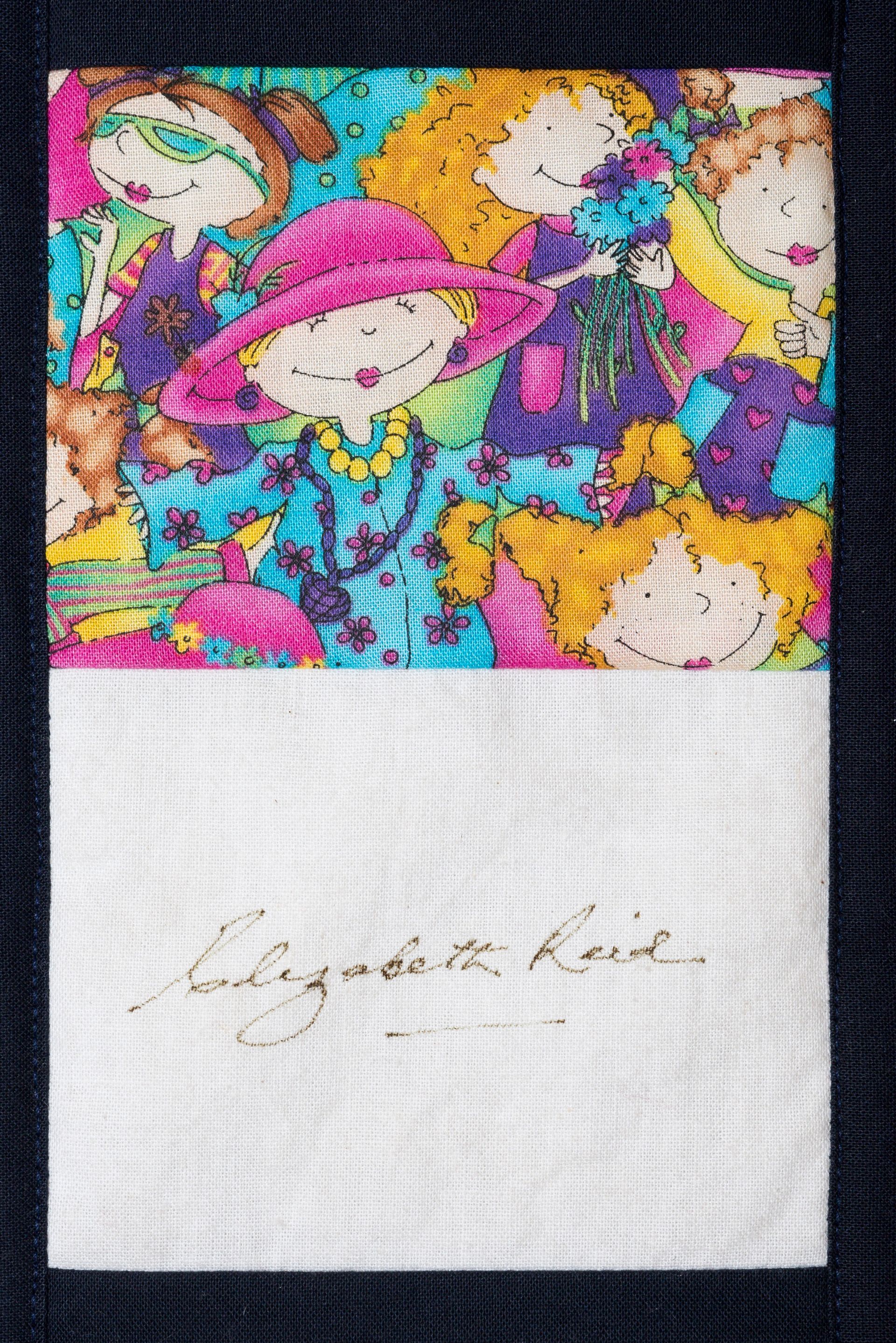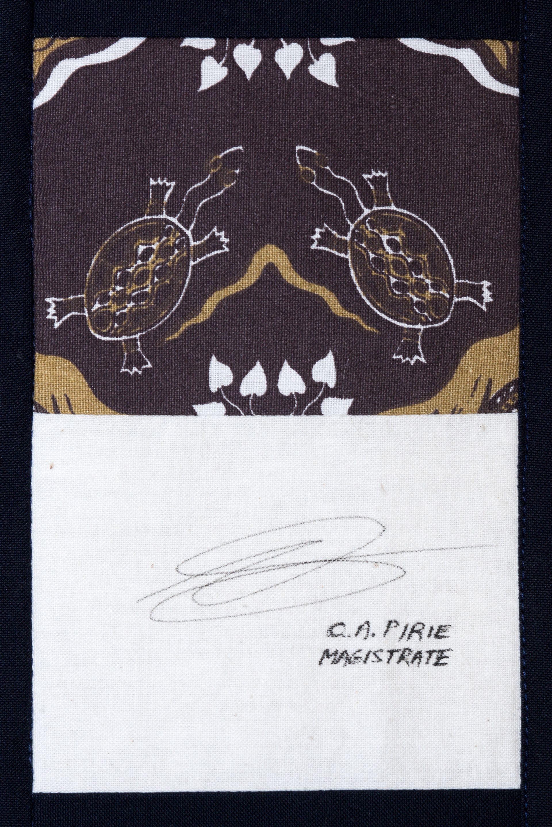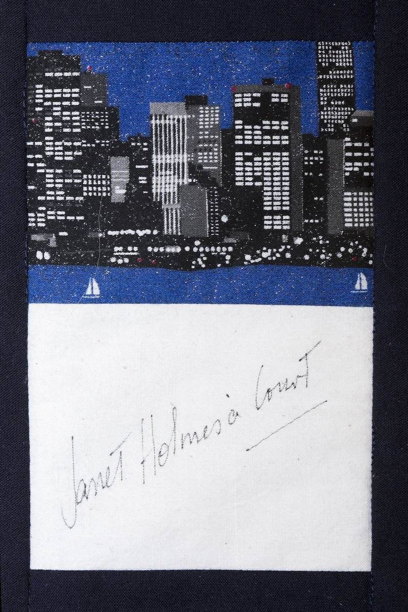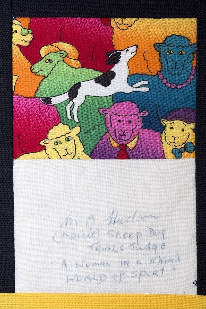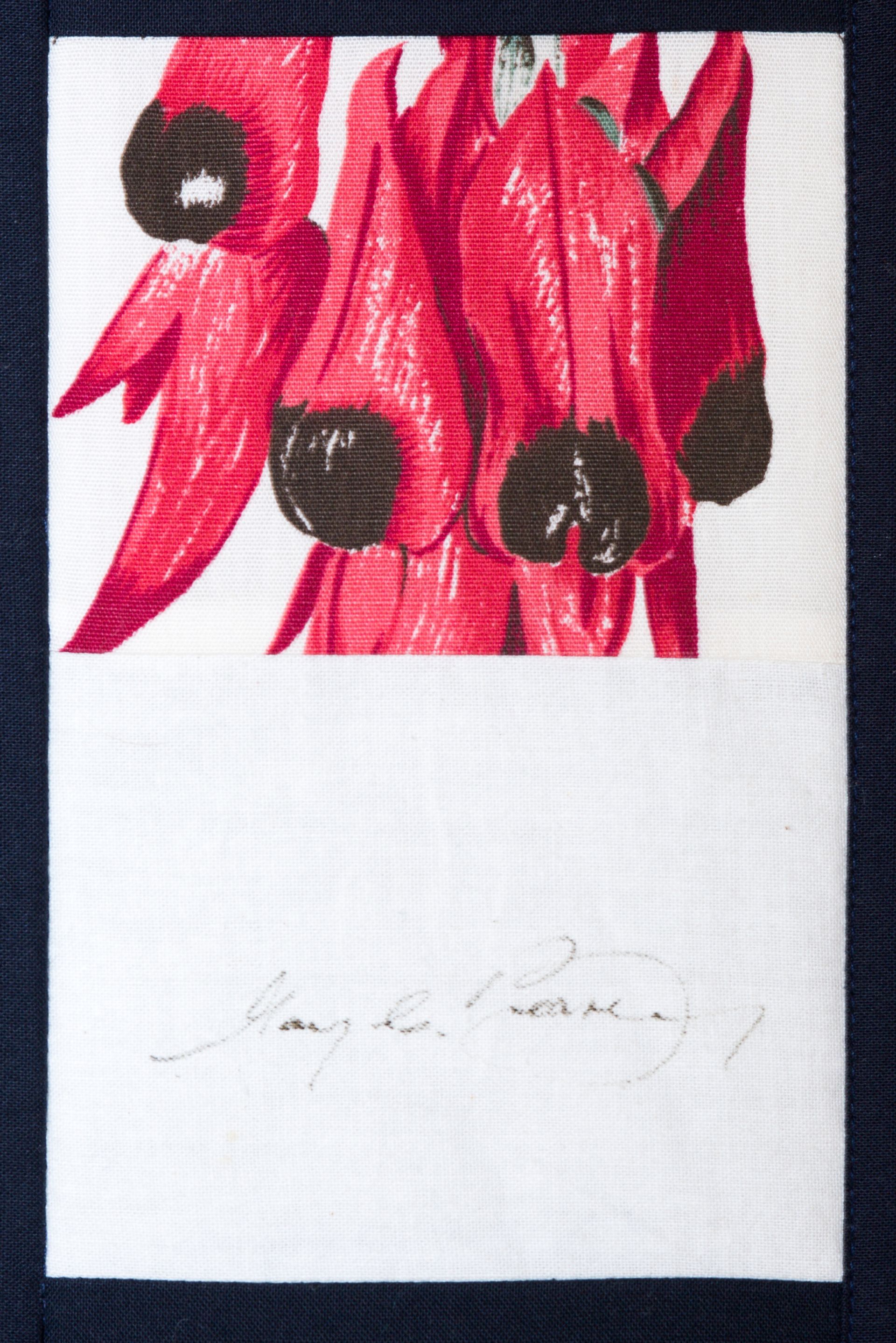 The calico rectangles are signed by Australian women who have recorded firsts or significant achievements in their fields of endeavour. The alternate patches of patterned fabric were selected to illustrate the signatories profession or achievement.