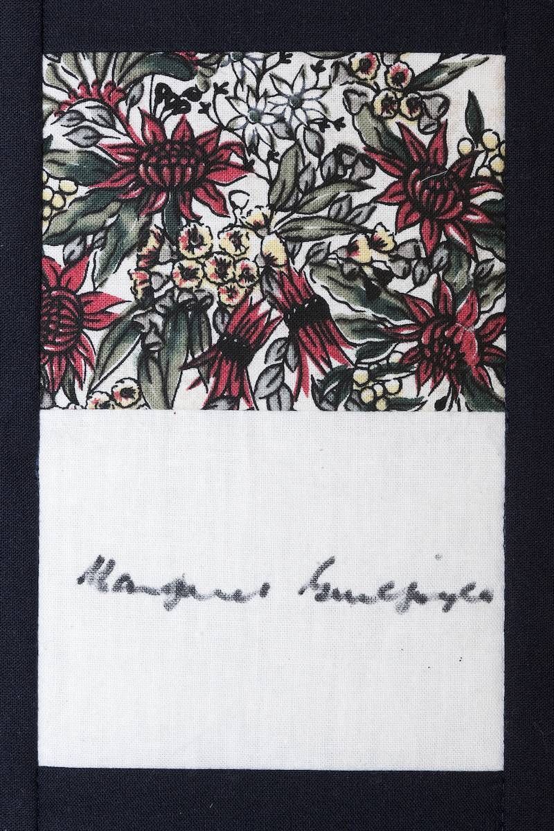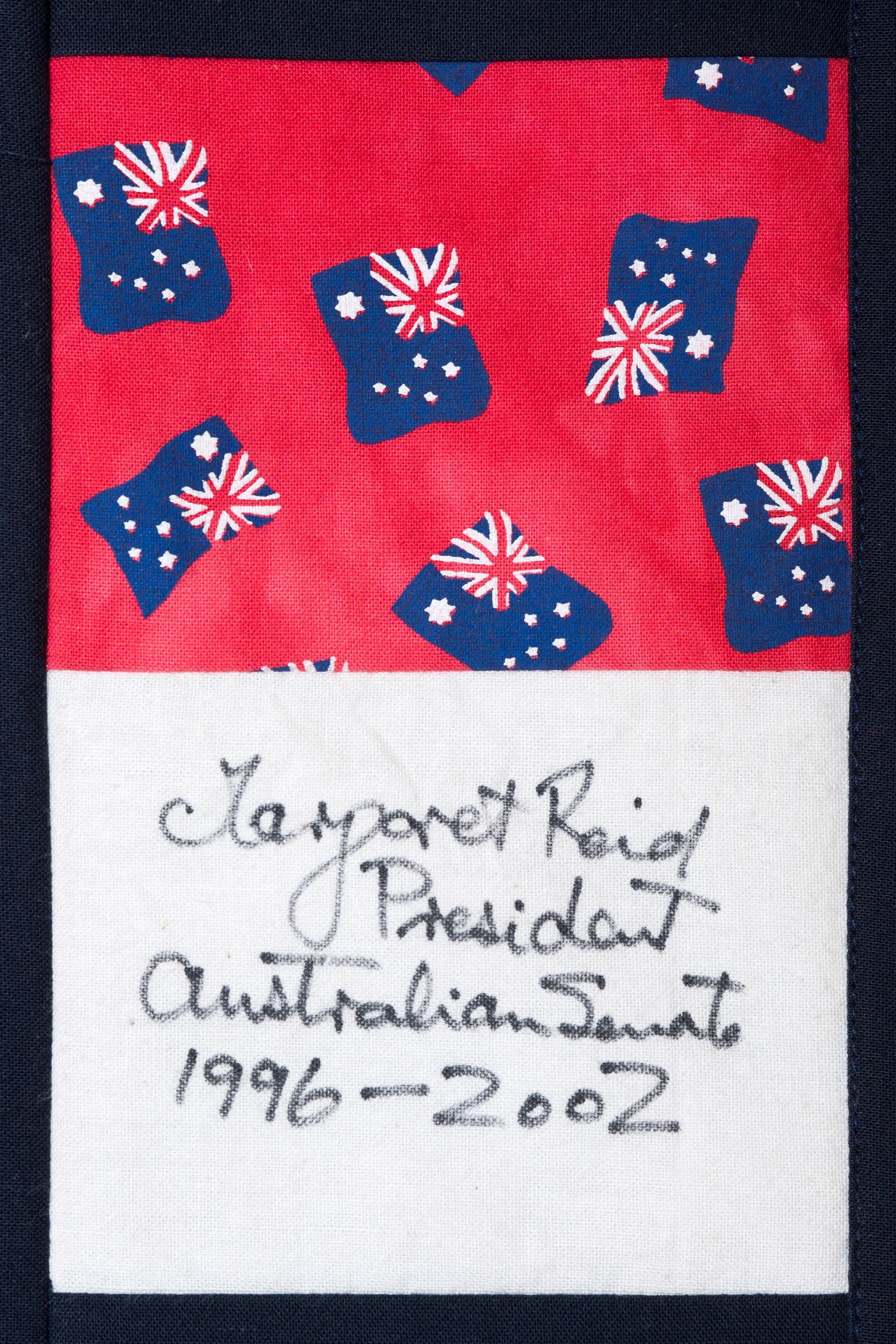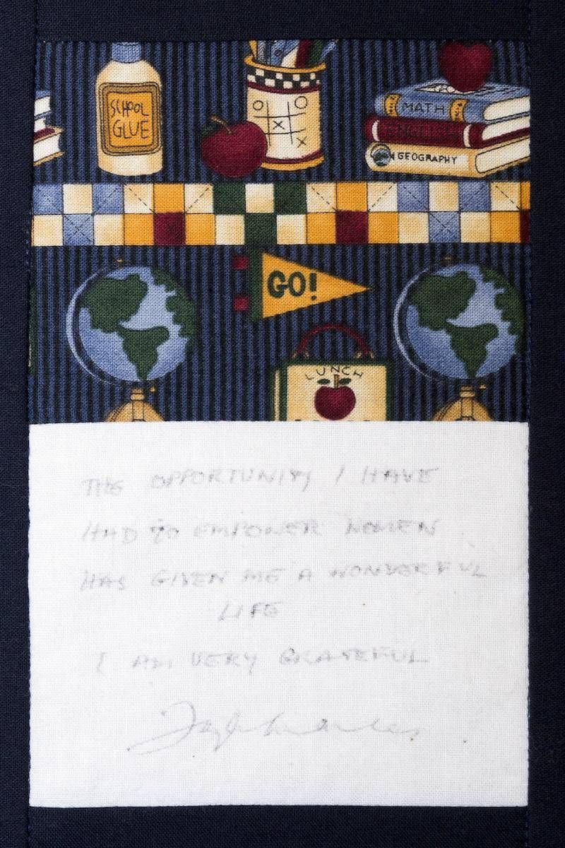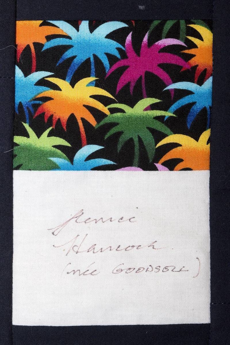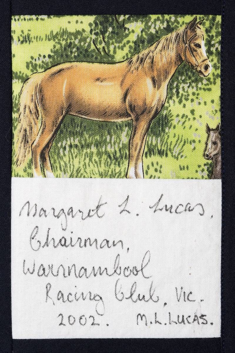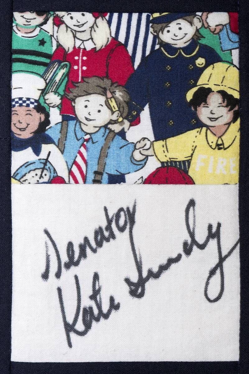 The calico rectangles are signed by Australian women who have recorded firsts or significant achievements in their fields of endeavour. The alternate patches of patterned fabric were selected to illustrate the signatories profession or achievement.