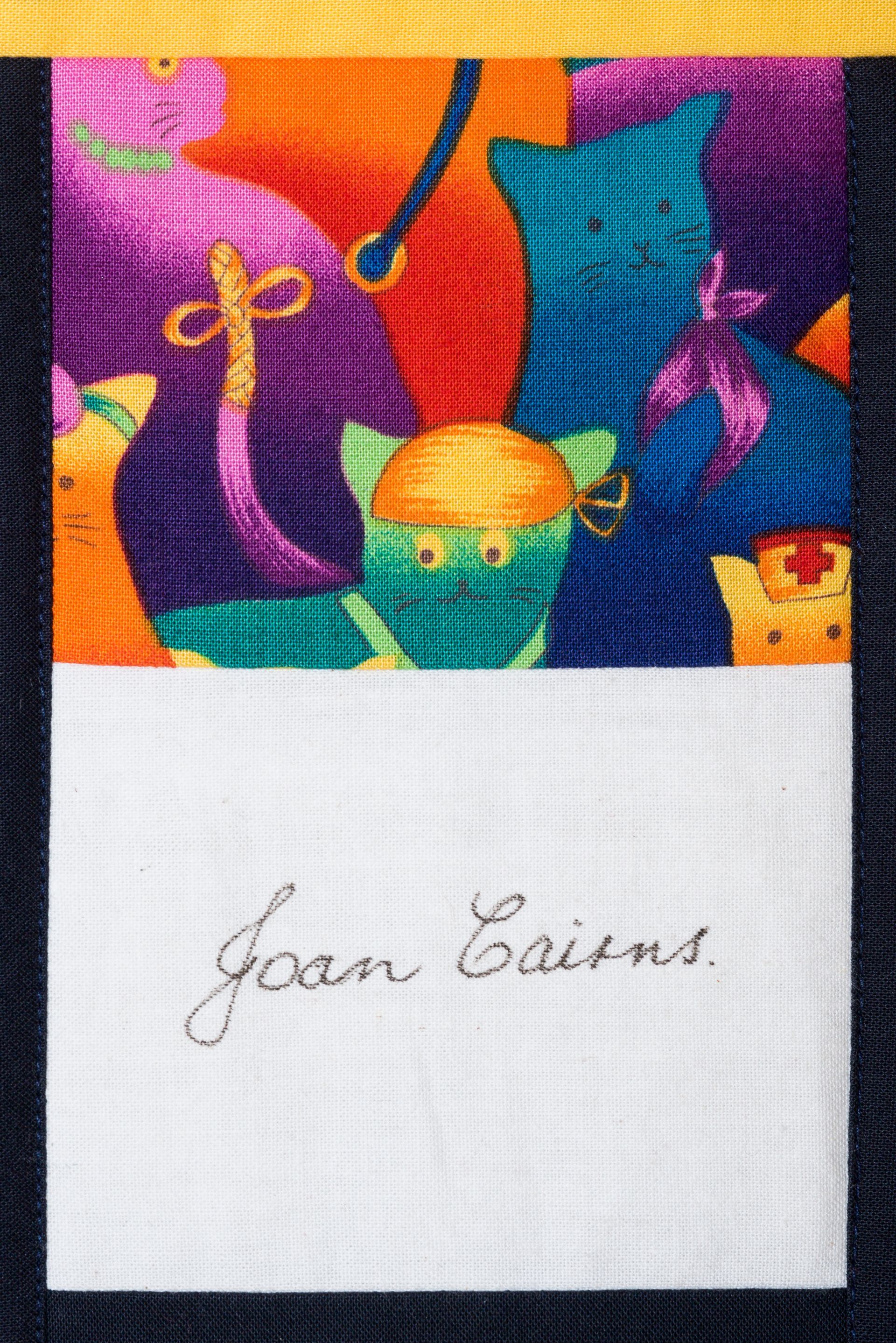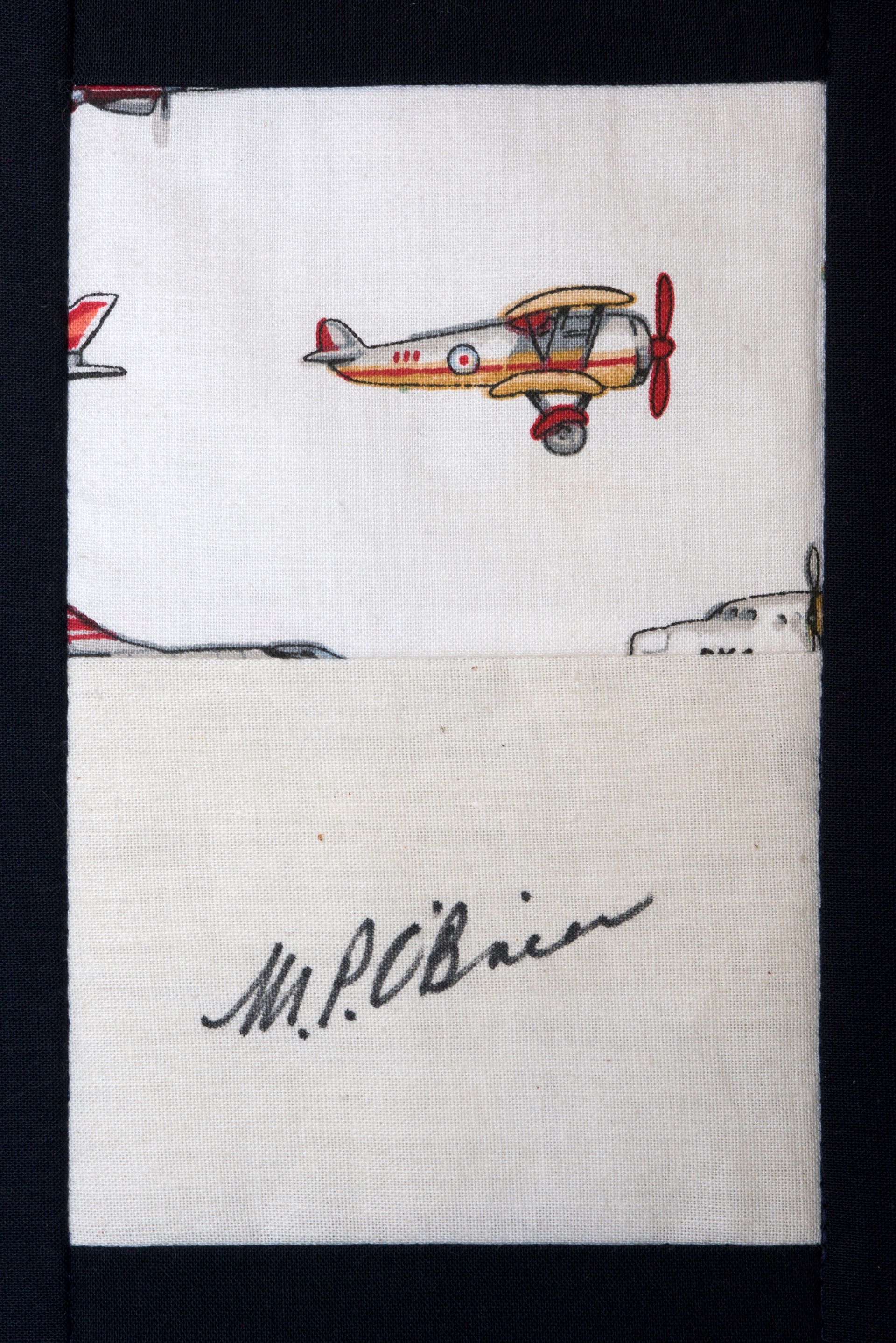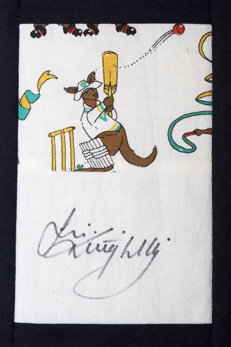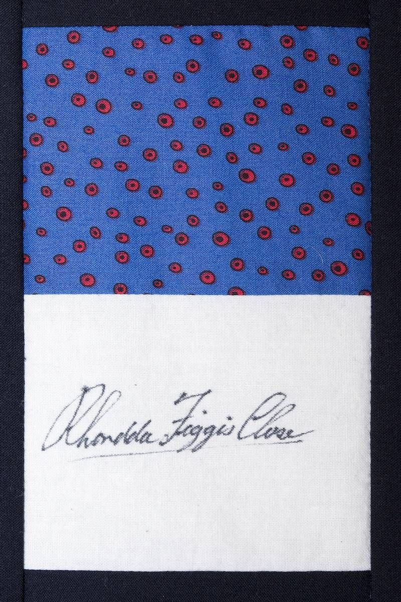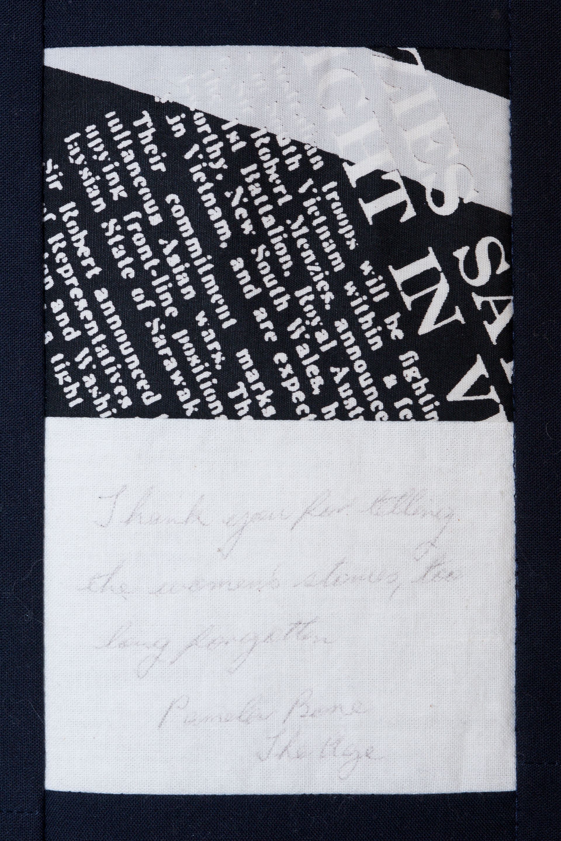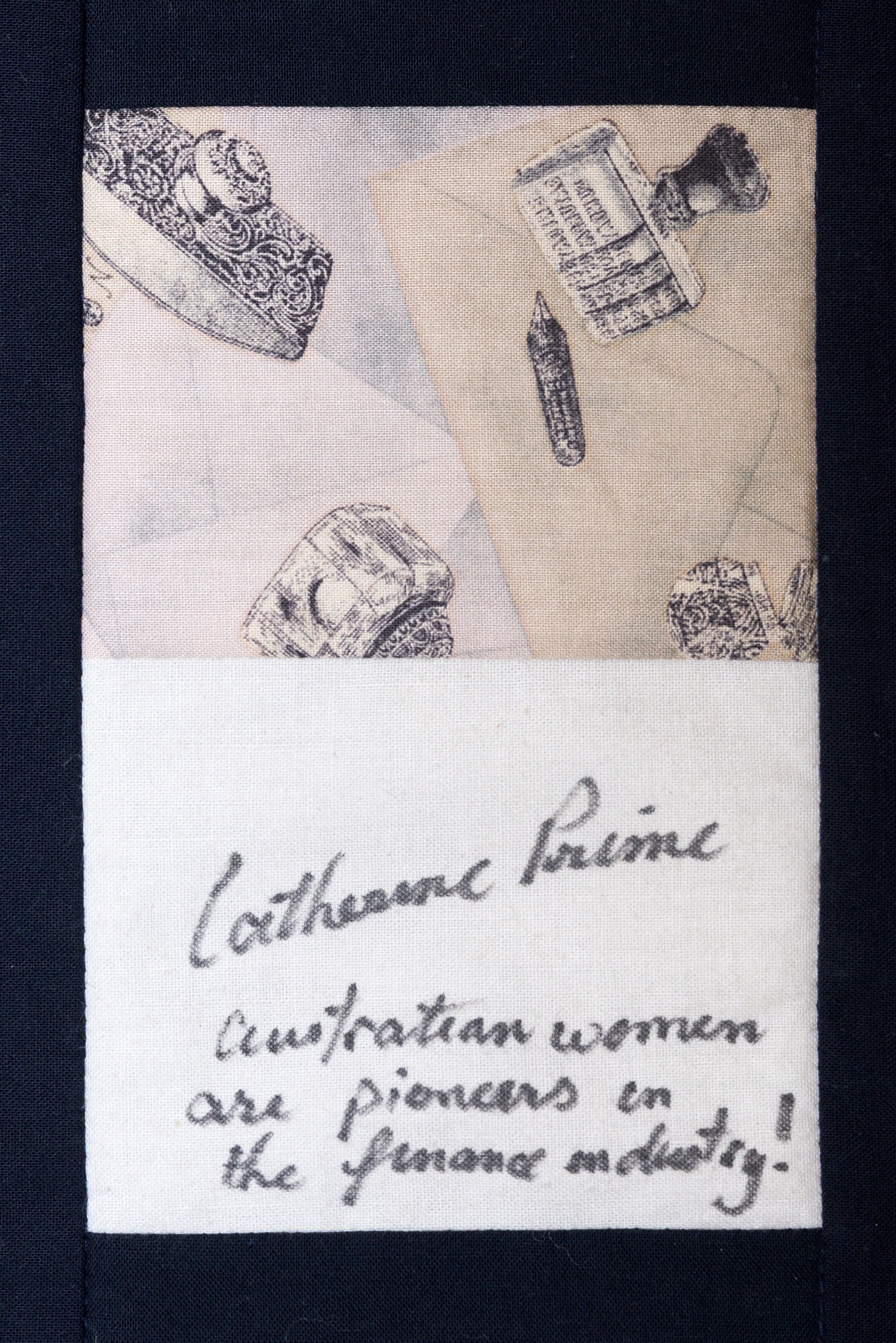 The calico rectangles are signed by Australian women who have recorded firsts or significant achievements in their fields of endeavour. The alternate patches of patterned fabric were selected to illustrate the signatories profession or achievement.