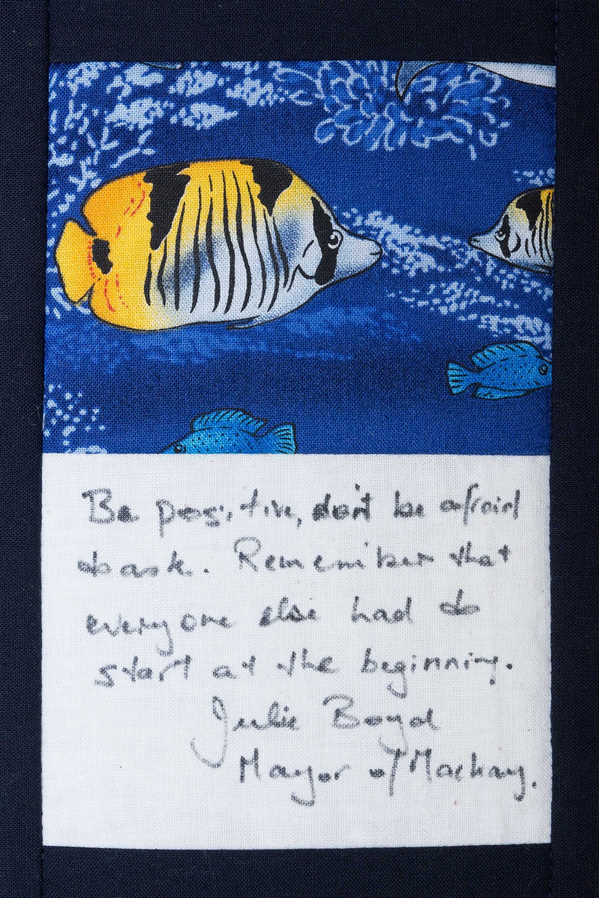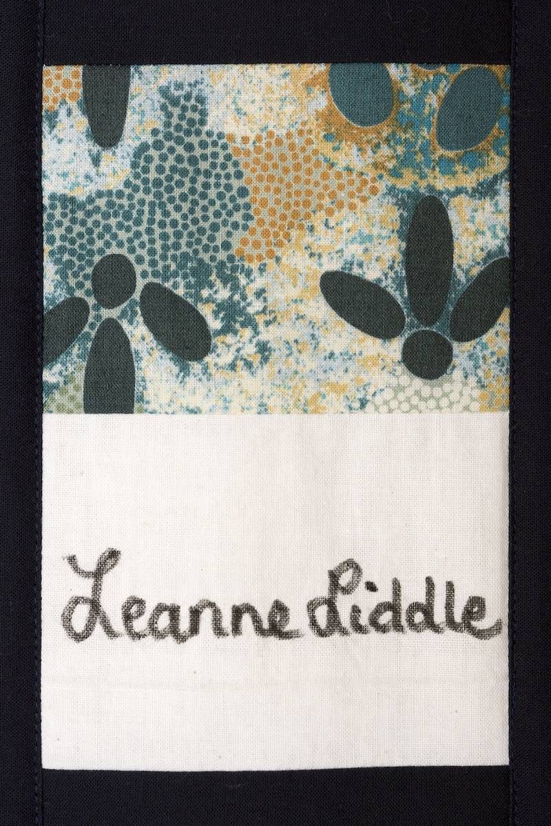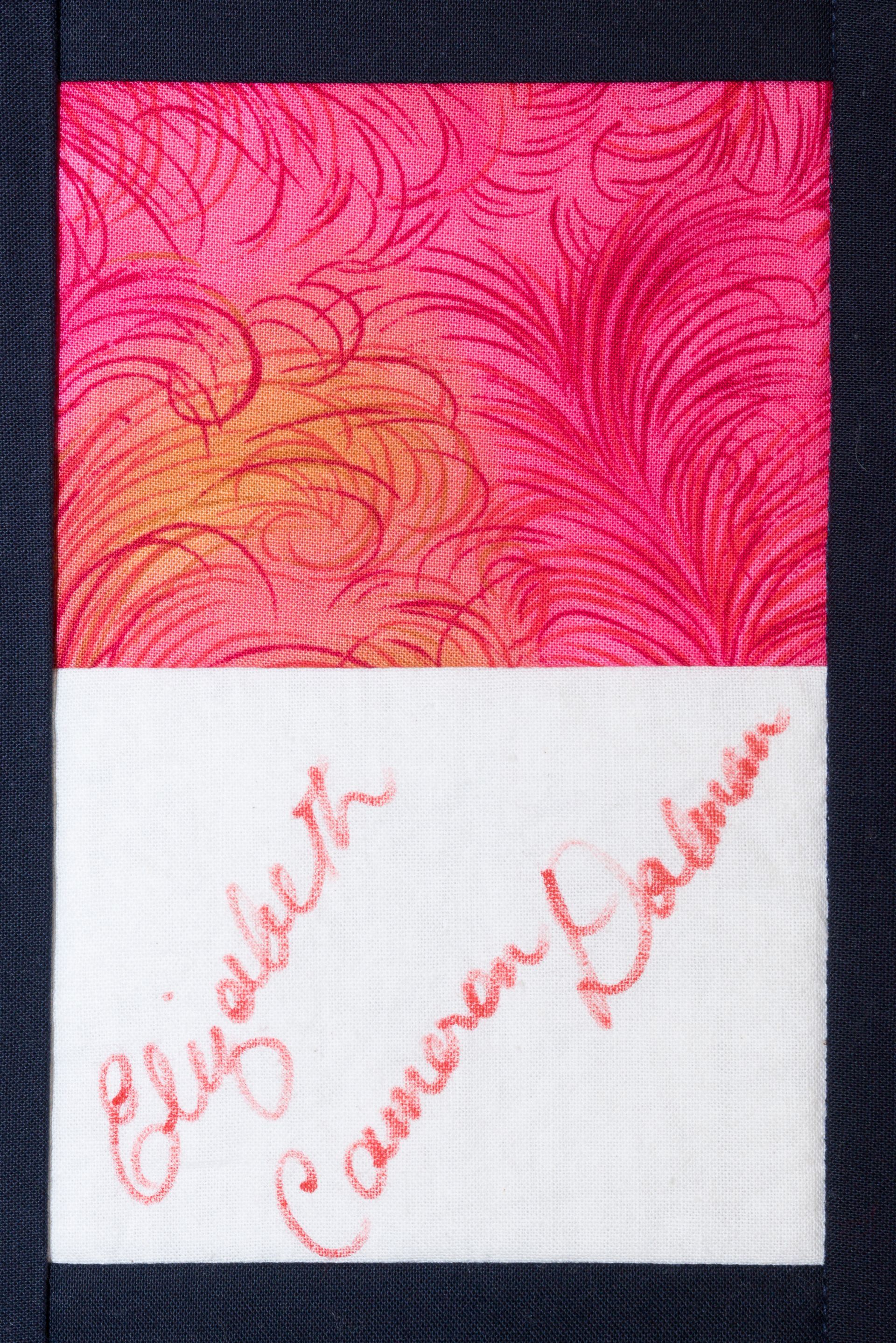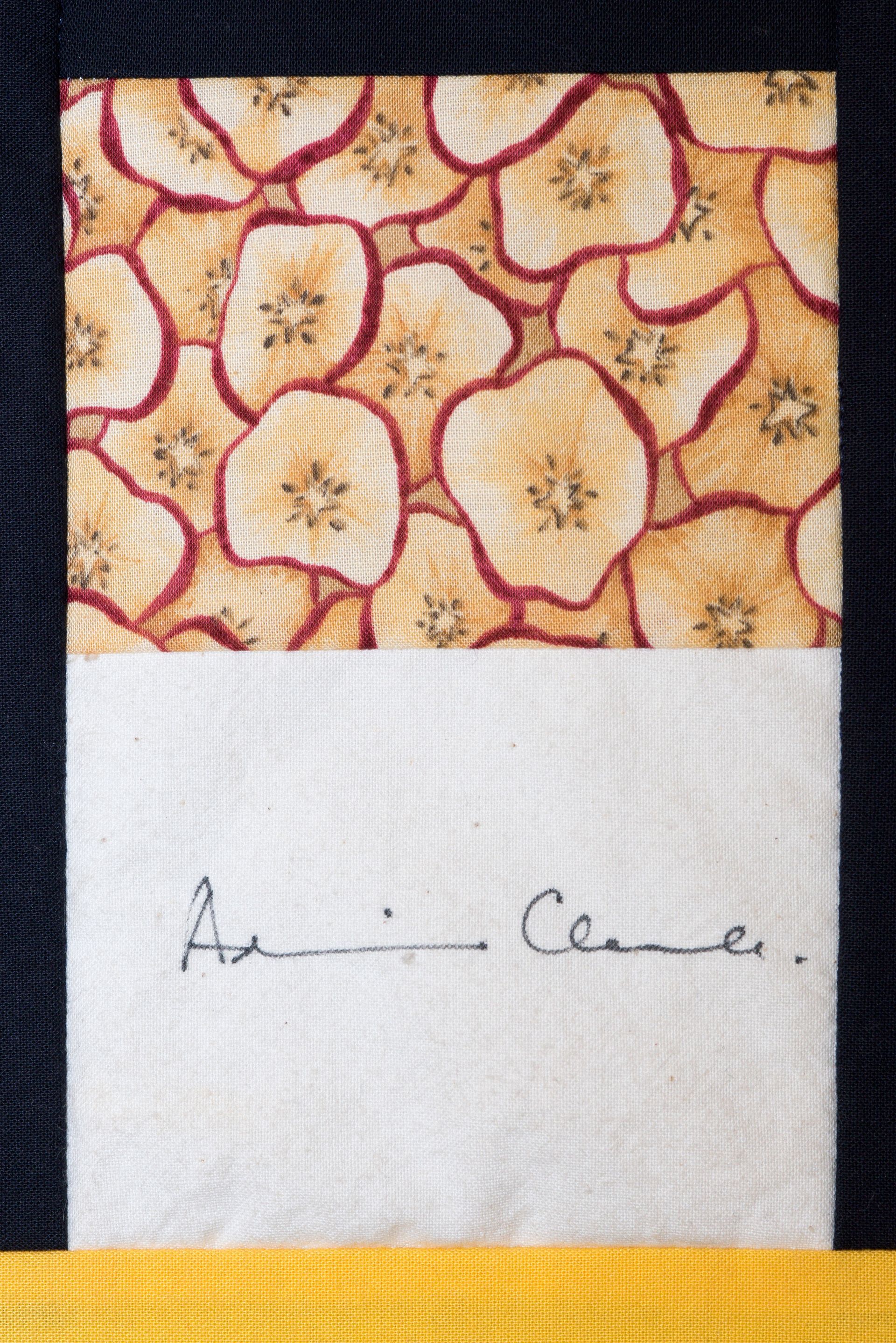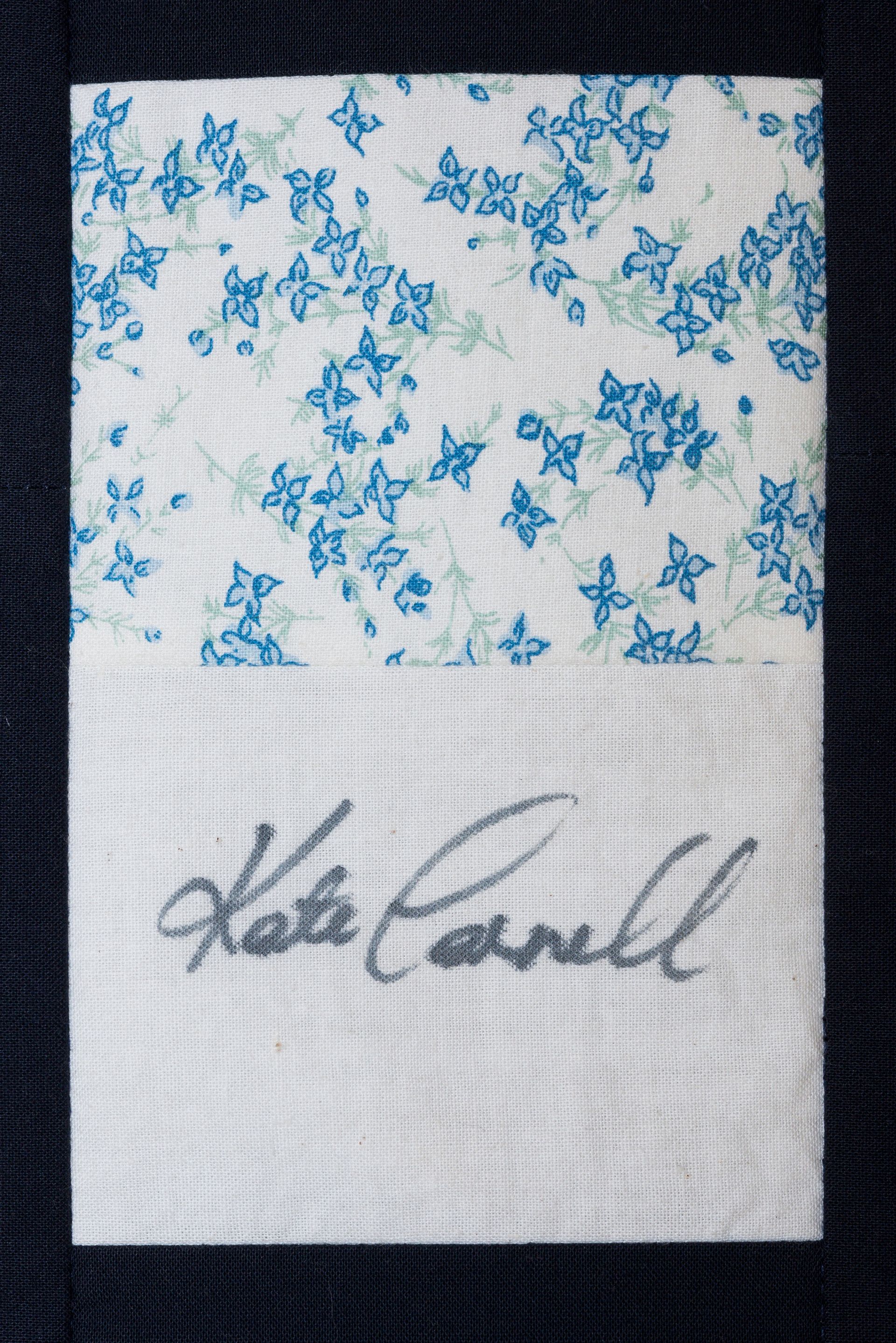 The calico rectangles are signed by Australian women who have recorded firsts or significant achievements in their fields of endeavour. The alternate patches of patterned fabric were selected to illustrate the signatories profession or achievement.
