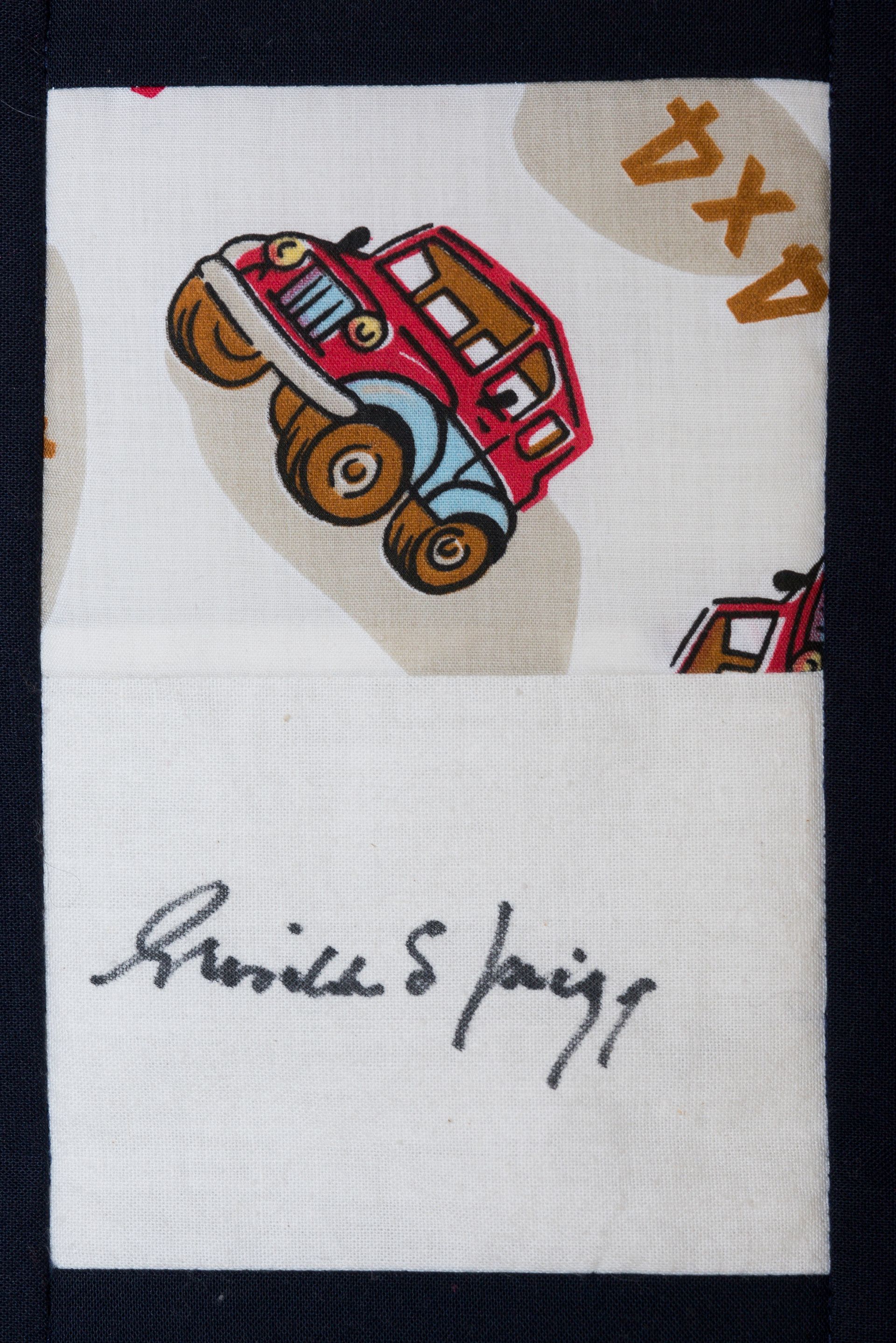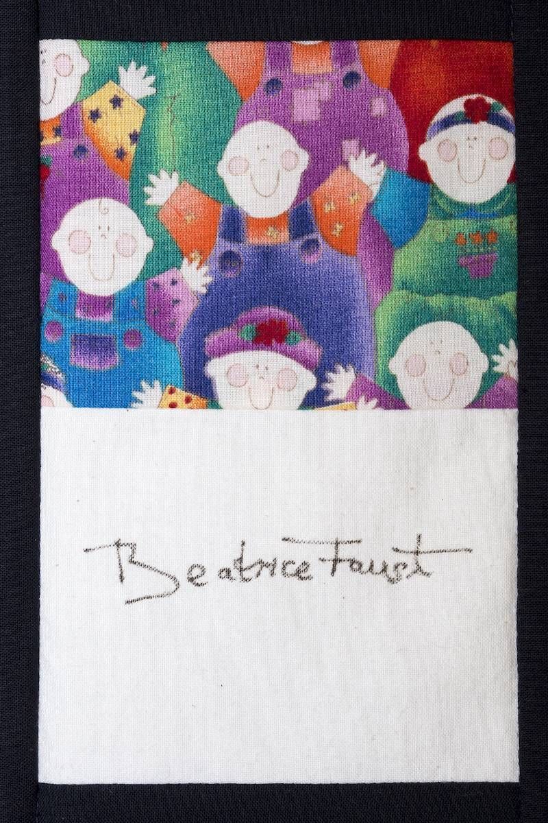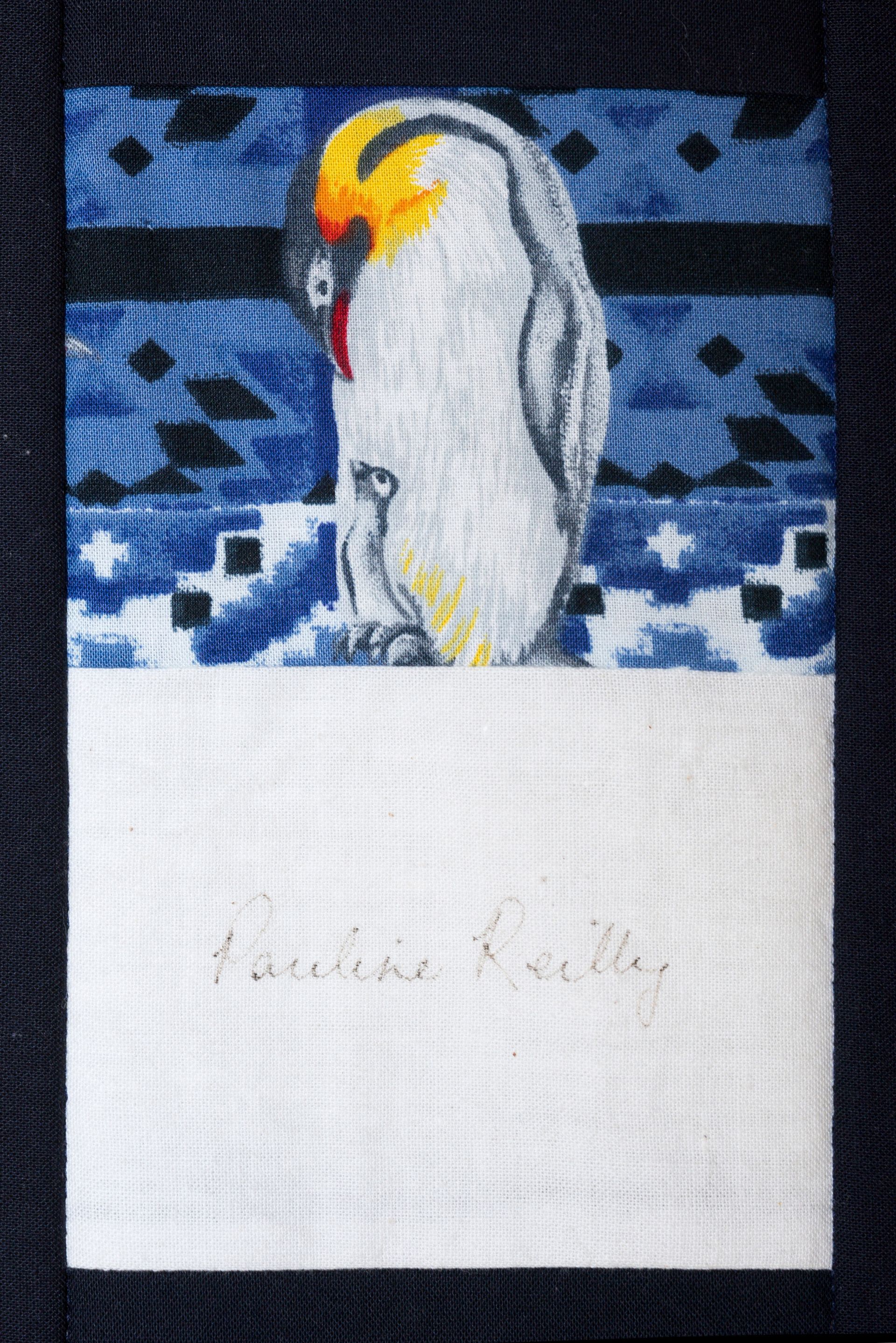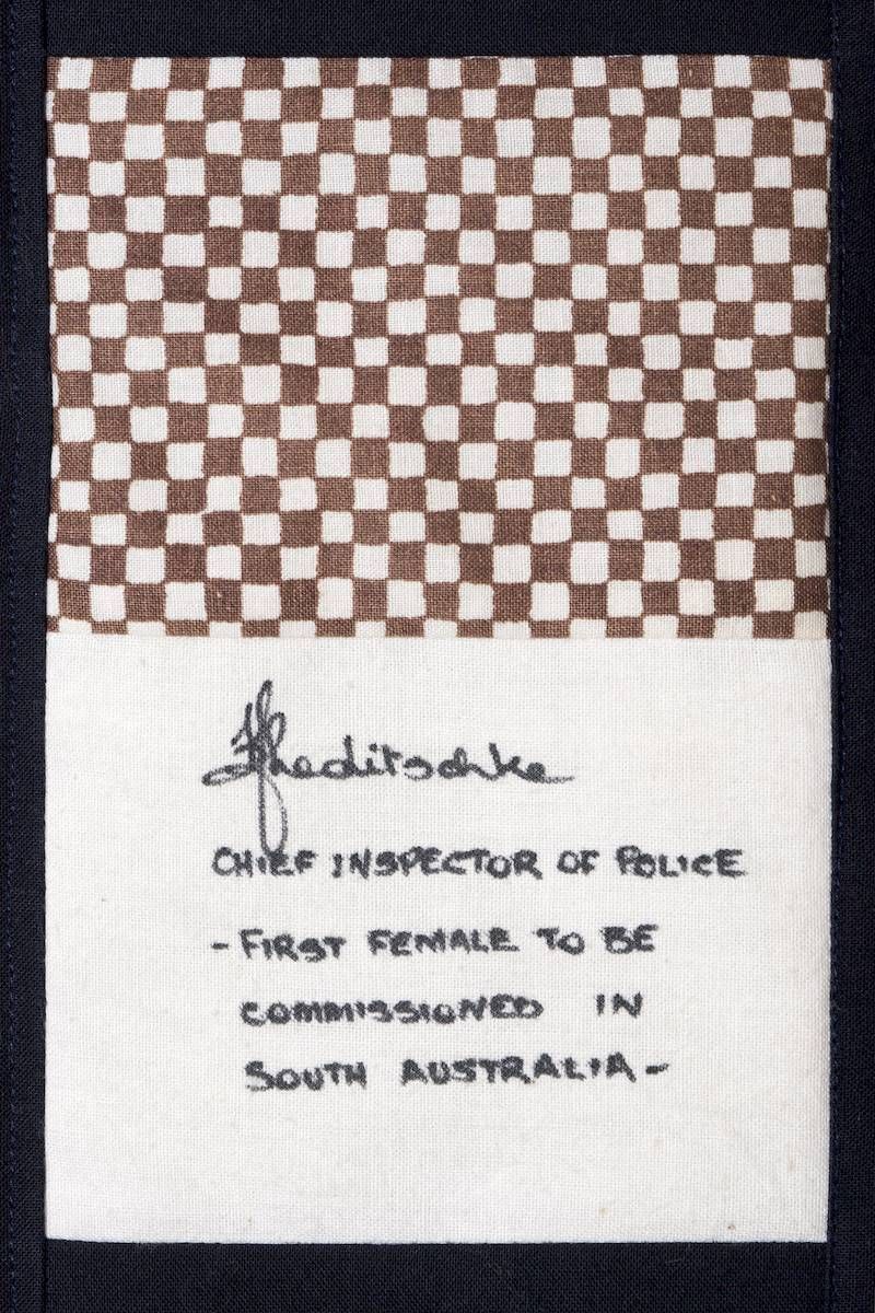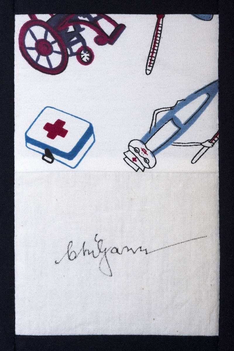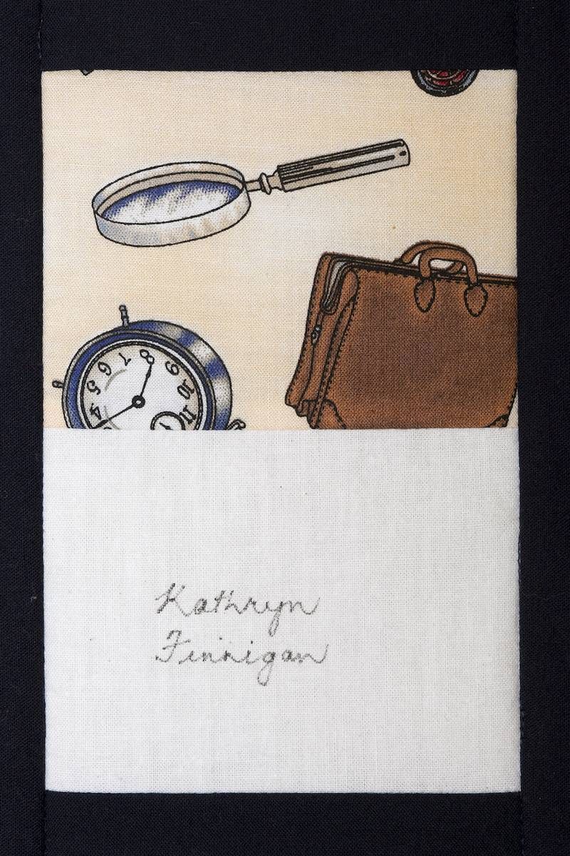 The calico rectangles are signed by Australian women who have recorded firsts or significant achievements in their fields of endeavour. The alternate patches of patterned fabric were selected to illustrate the signatories profession or achievement.