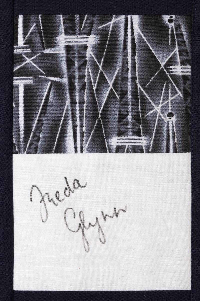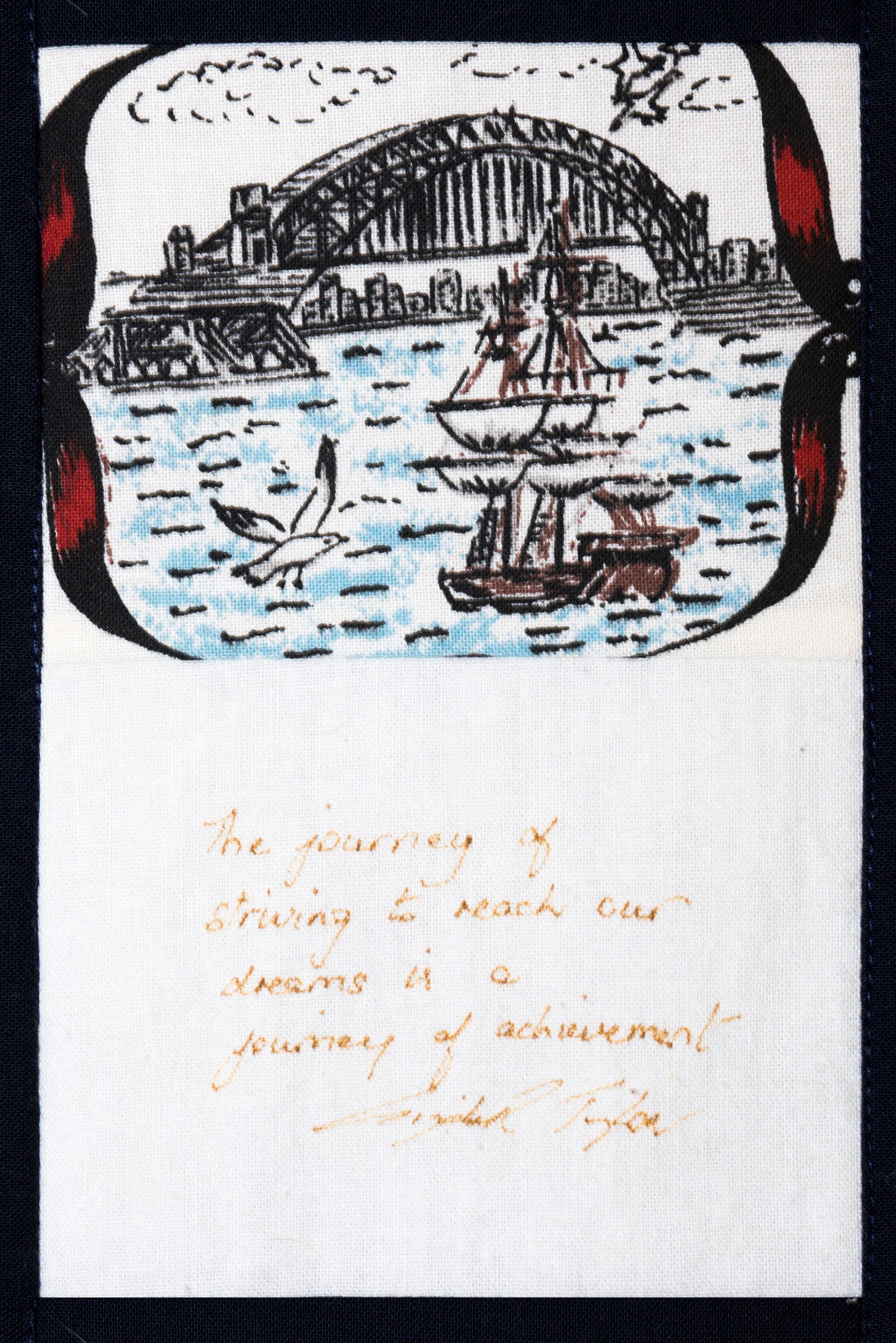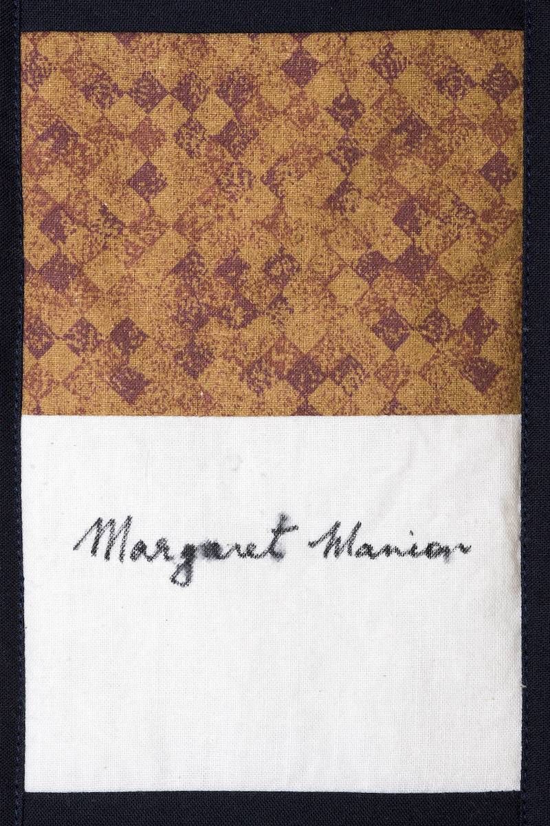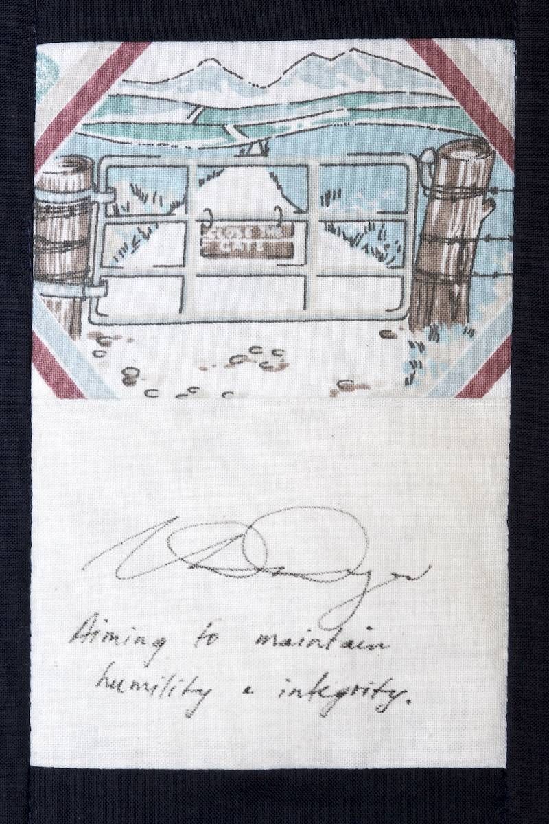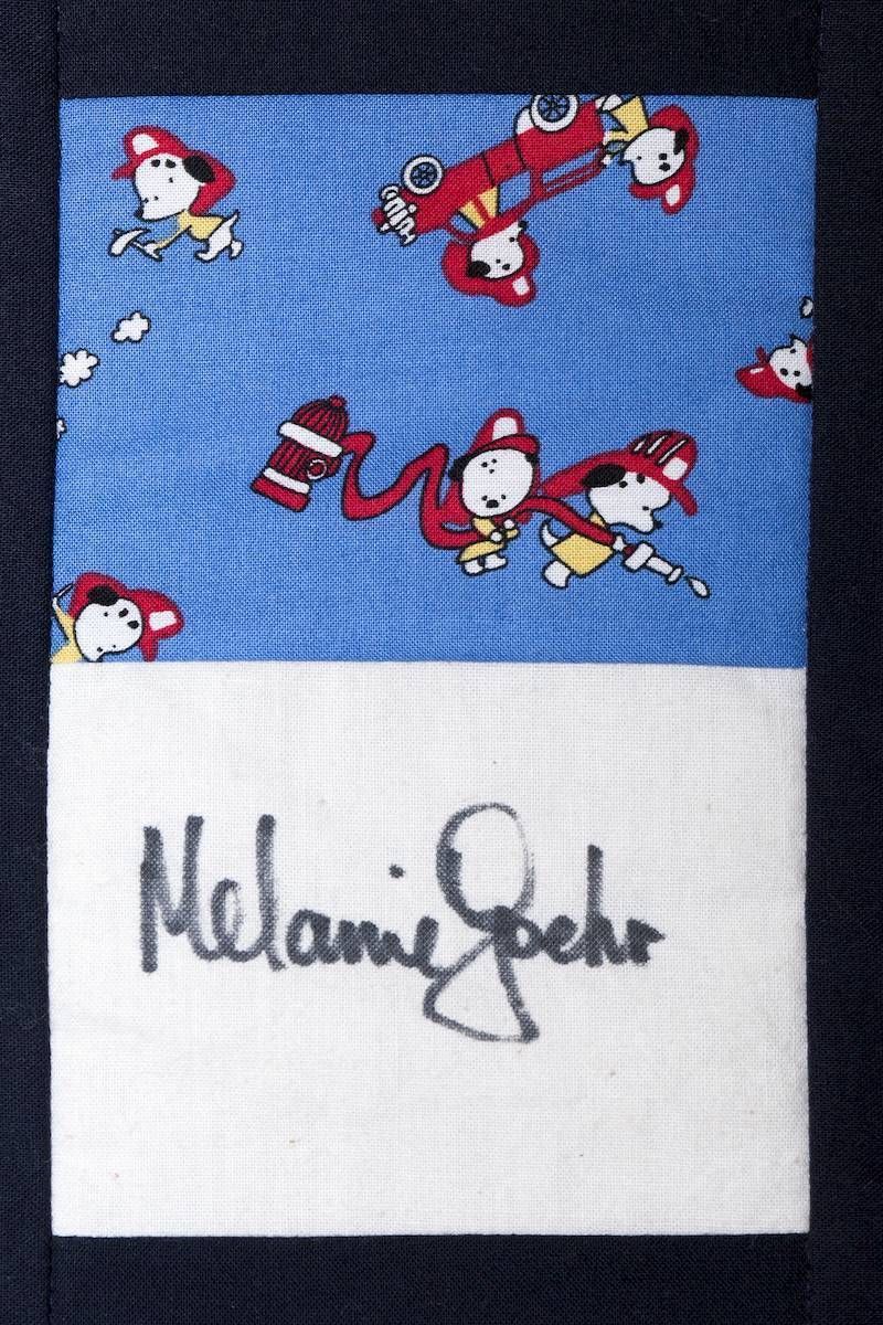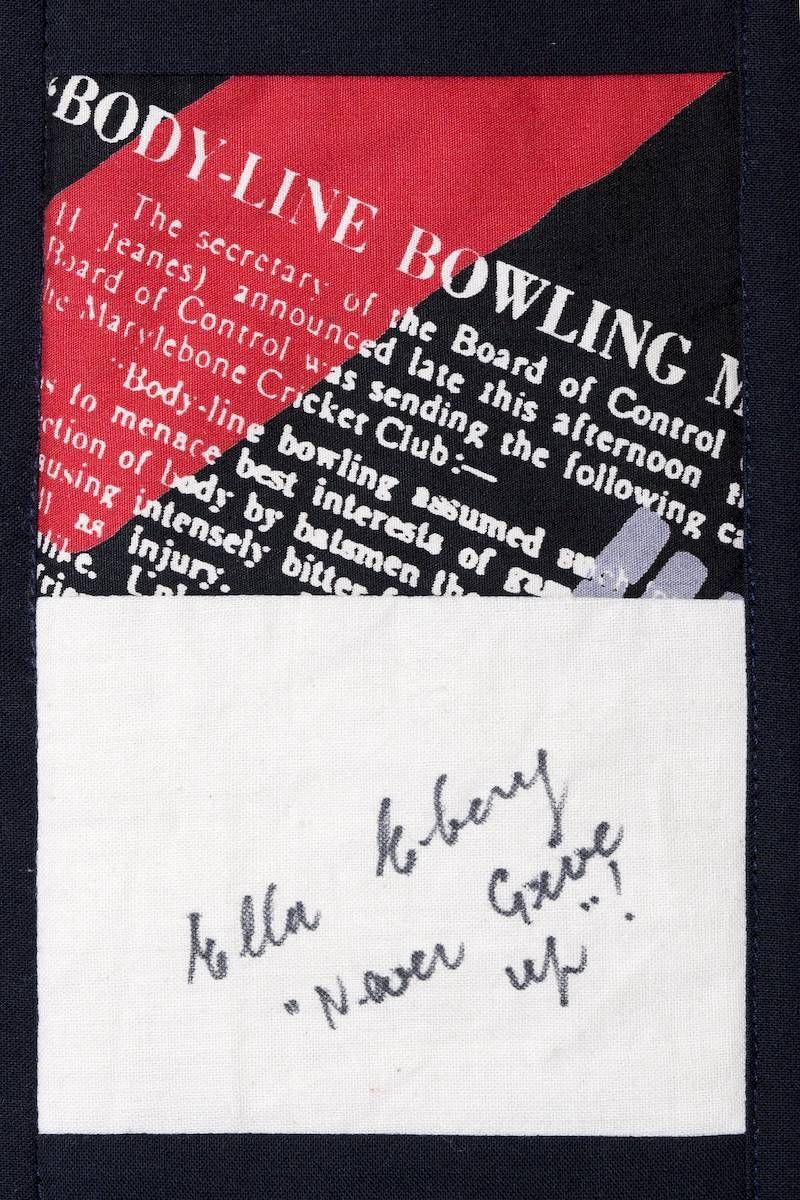 The calico rectangles are signed by Australian women who have recorded firsts or significant achievements in their fields of endeavour. The alternate patches of patterned fabric were selected to illustrate the signatories profession or achievement.