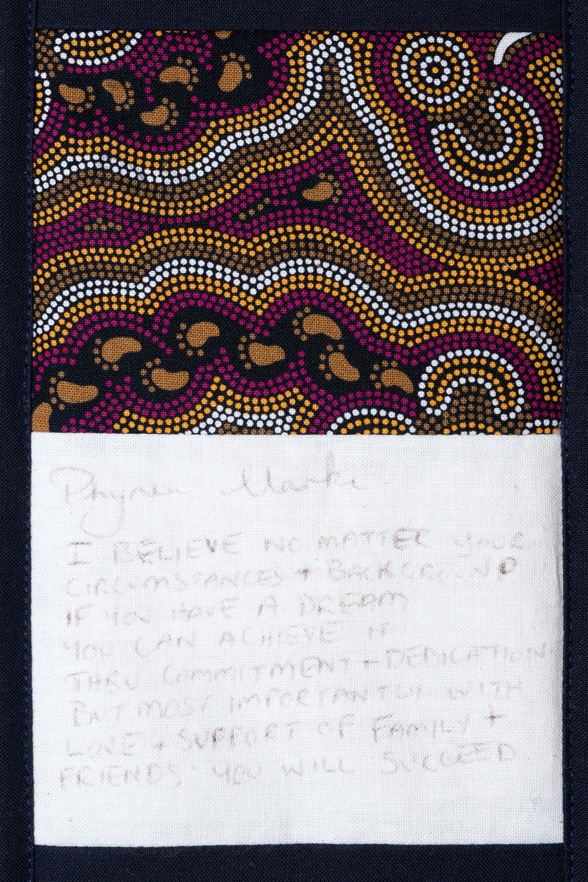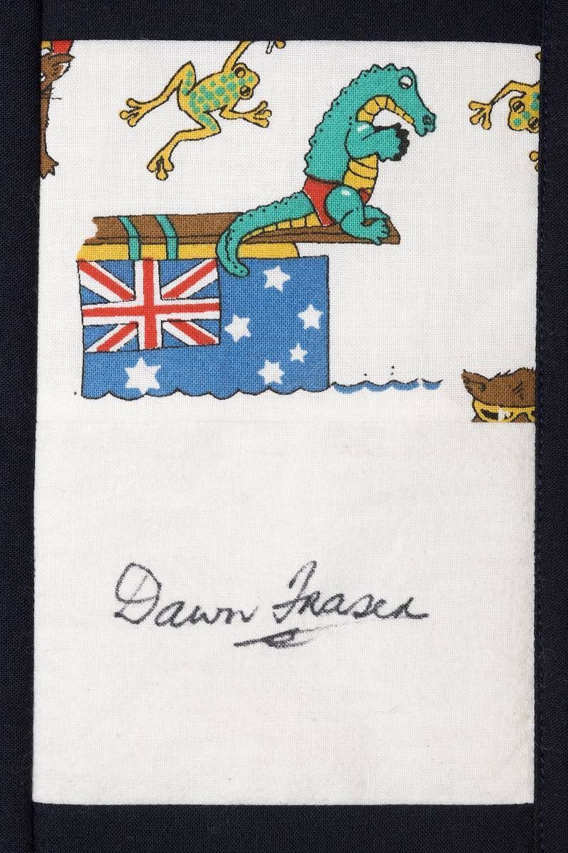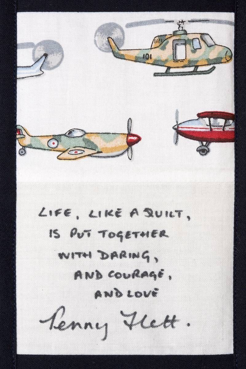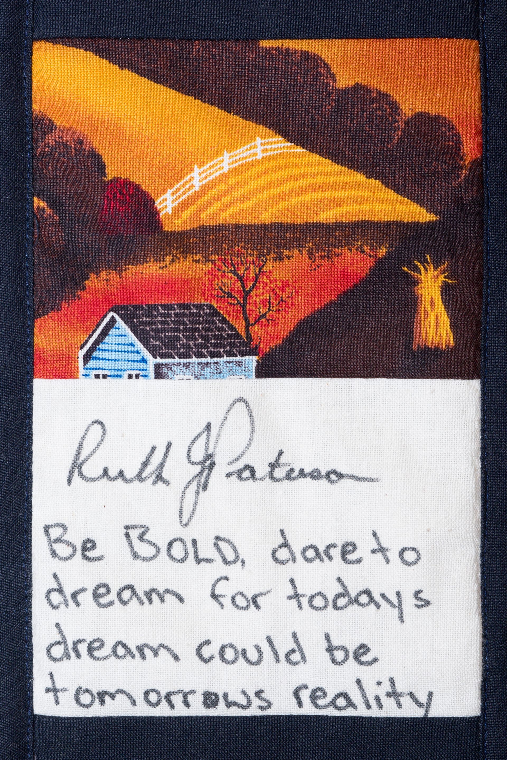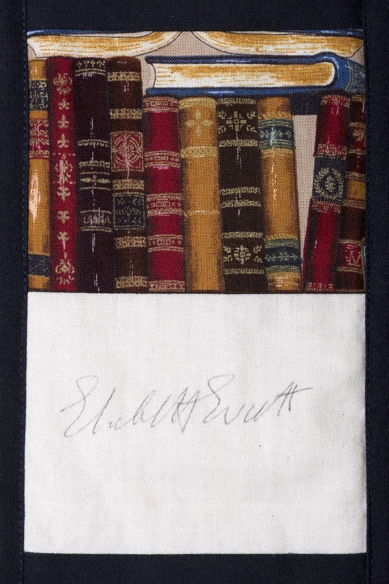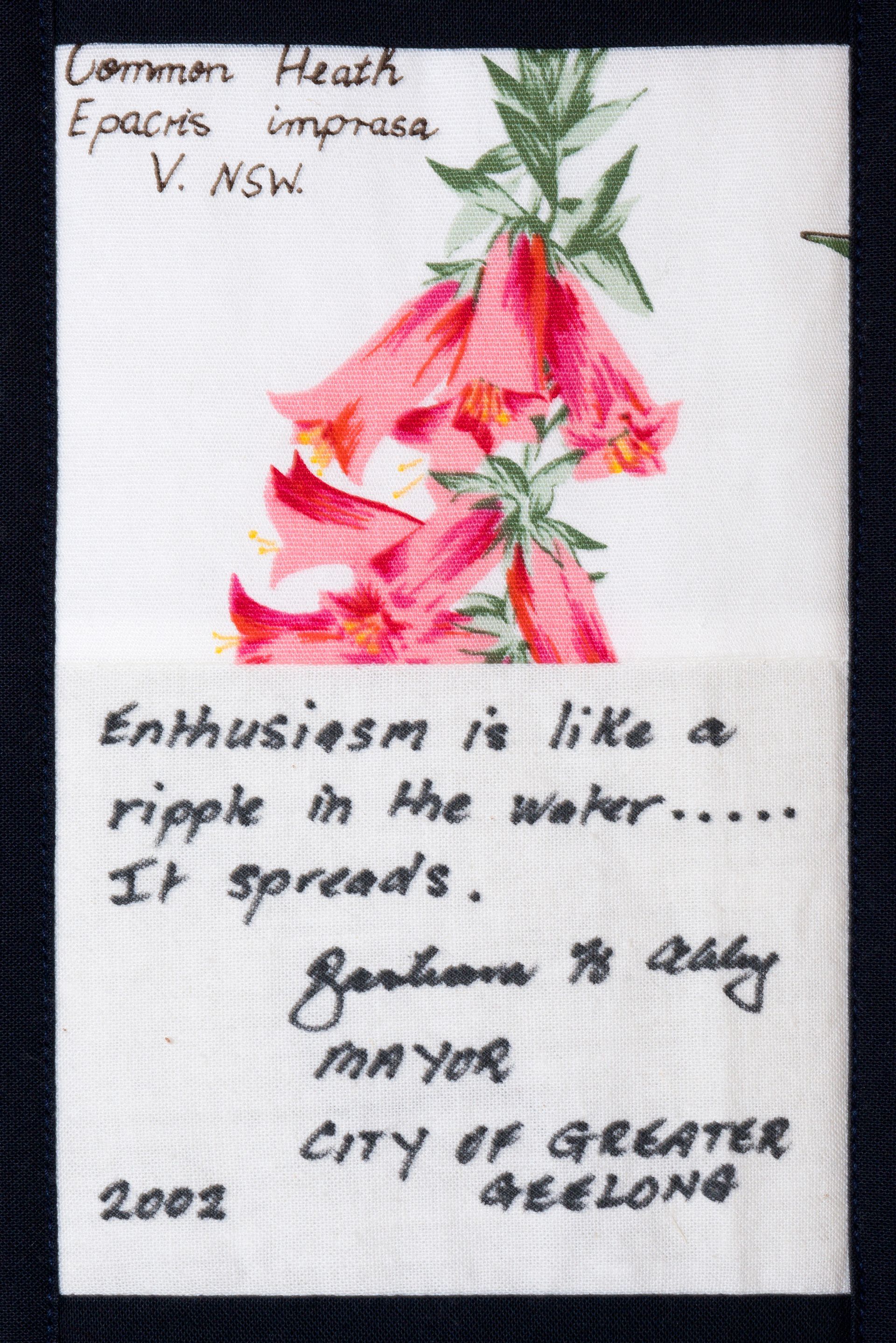 The calico rectangles are signed by Australian women who have recorded firsts or significant achievements in their fields of endeavour. The alternate patches of patterned fabric were selected to illustrate the signatories profession or achievement.