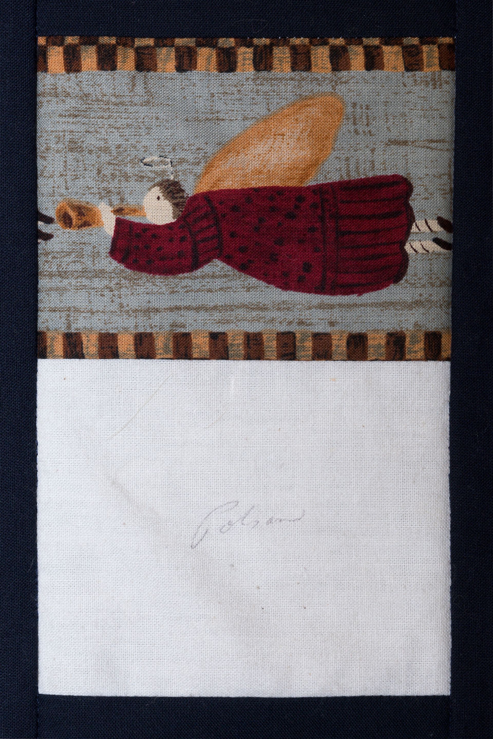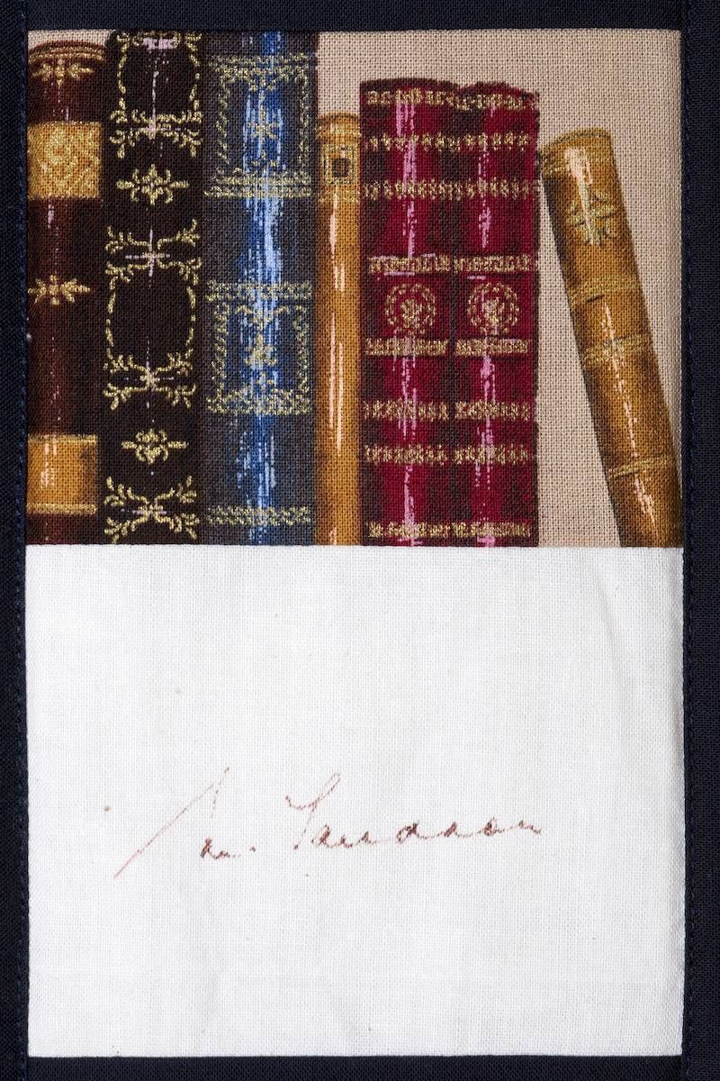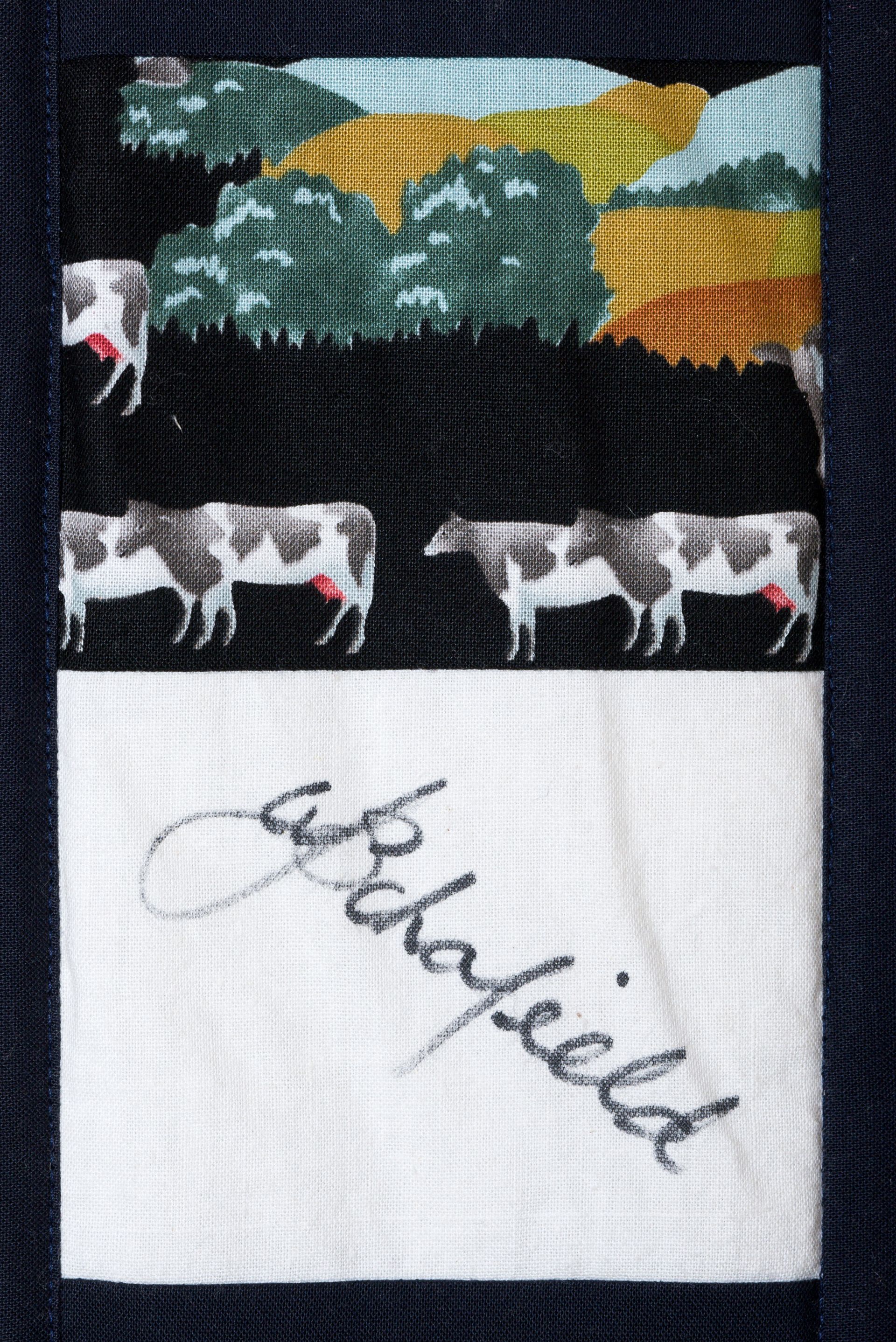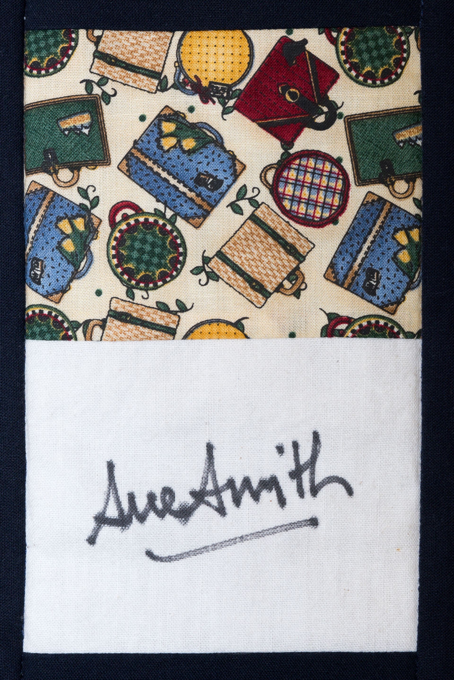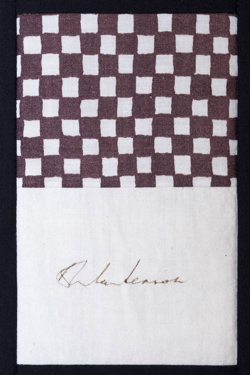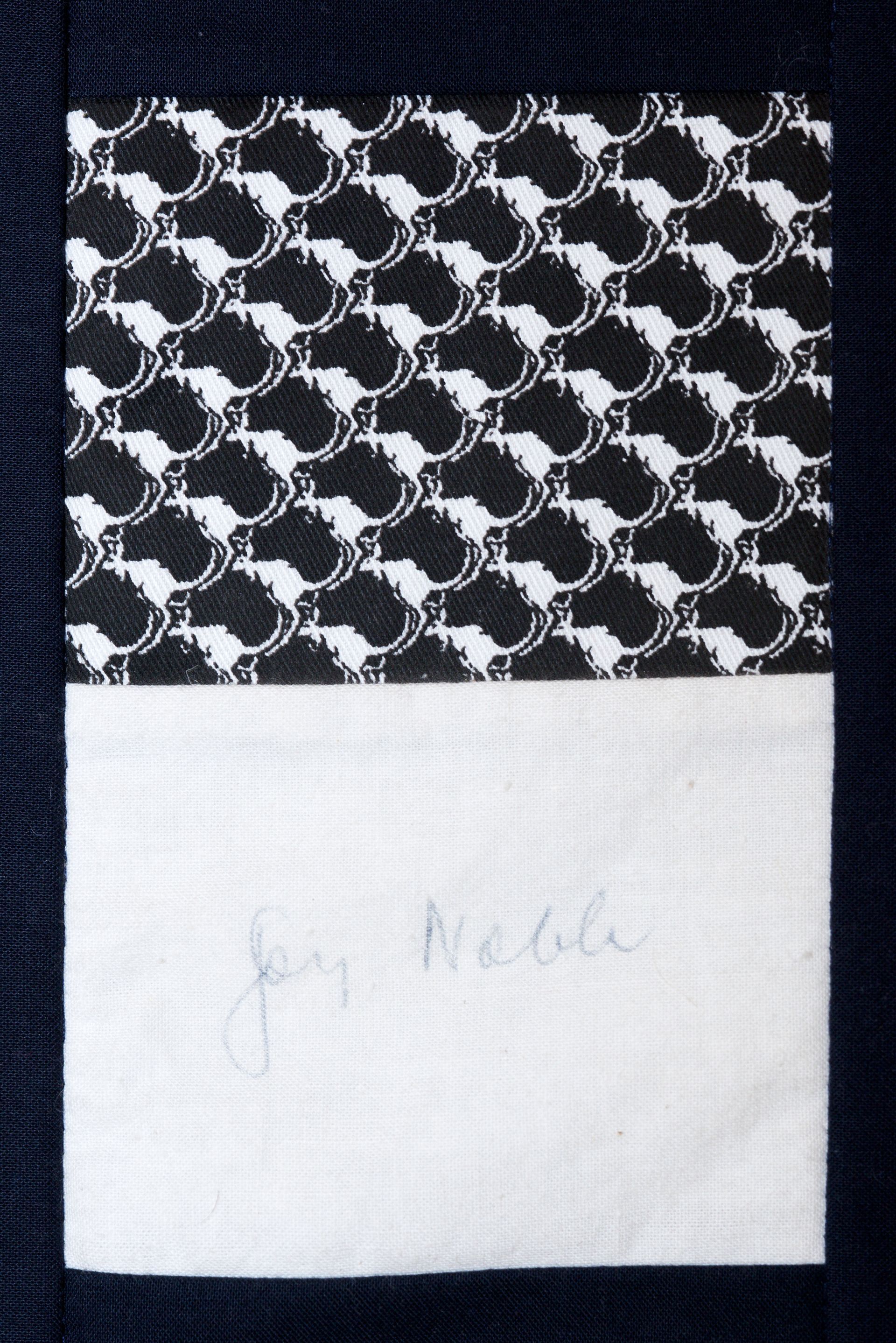 The calico rectangles are signed by Australian women who have recorded firsts or significant achievements in their fields of endeavour. The alternate patches of patterned fabric were selected to illustrate the signatories profession or achievement.