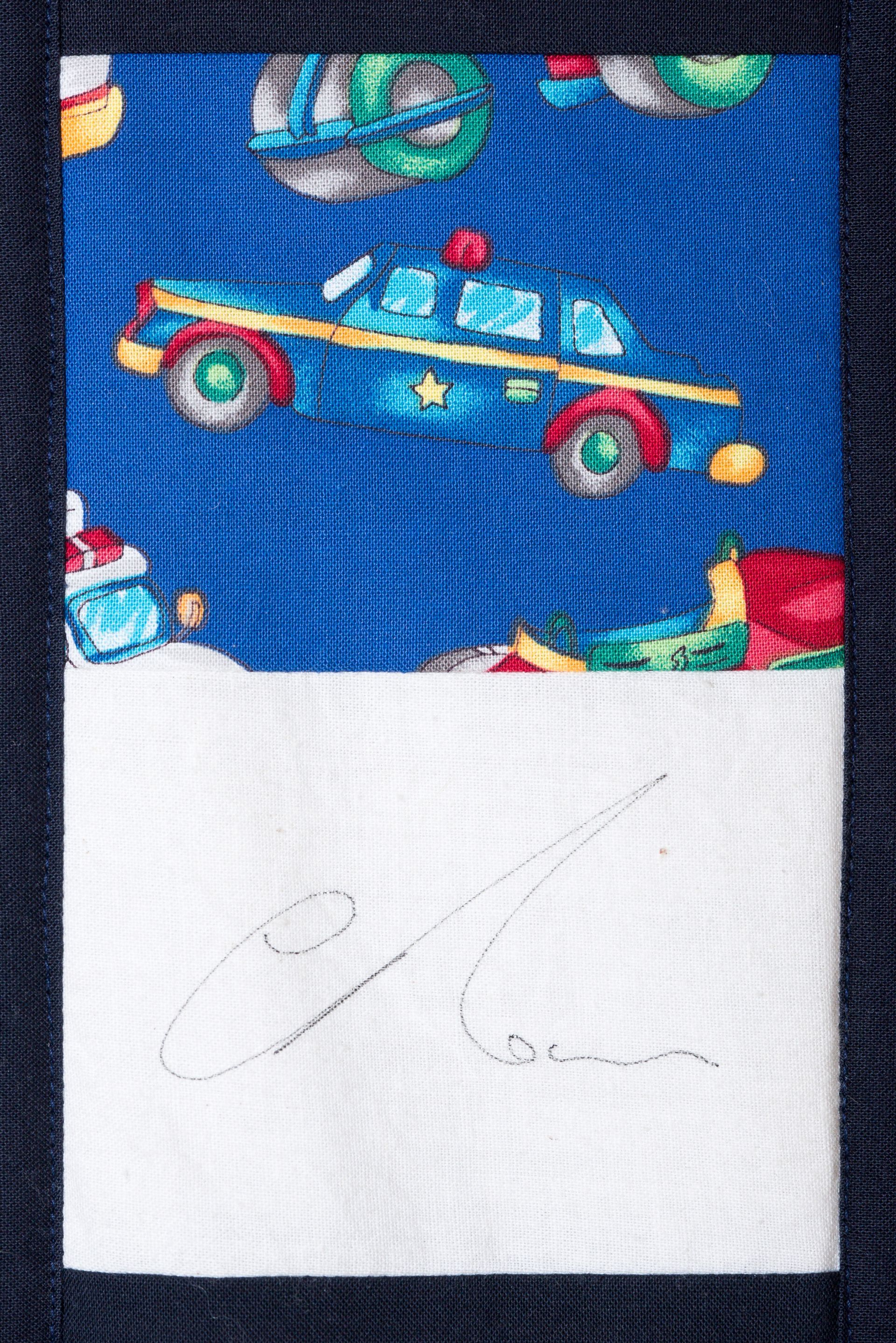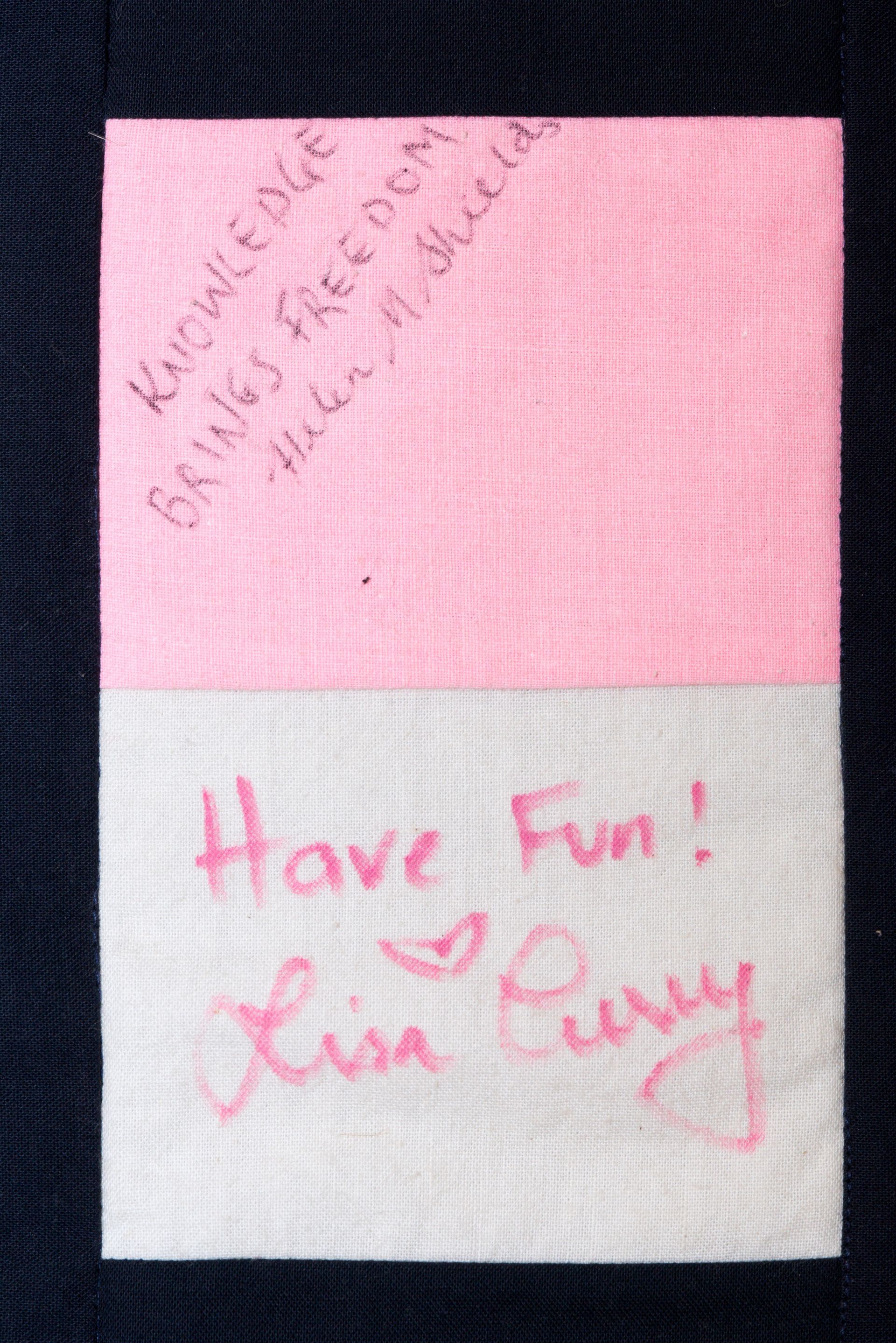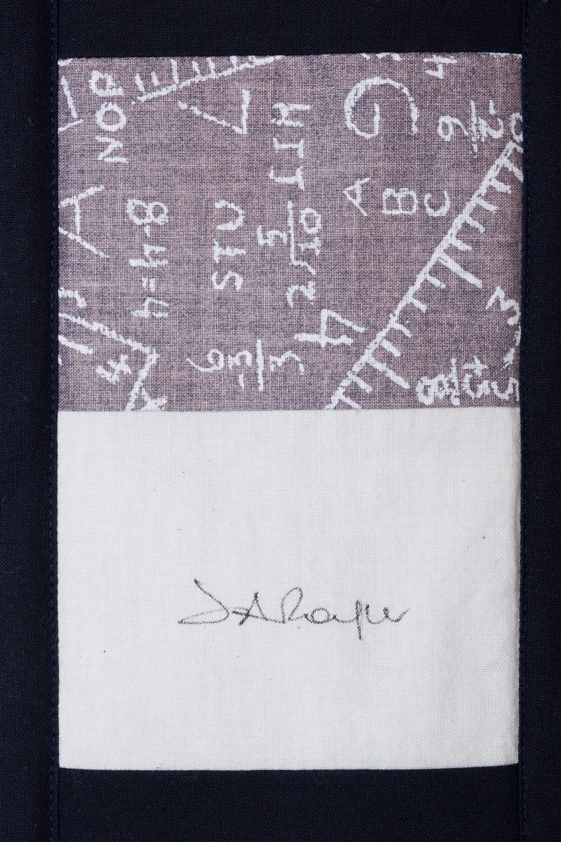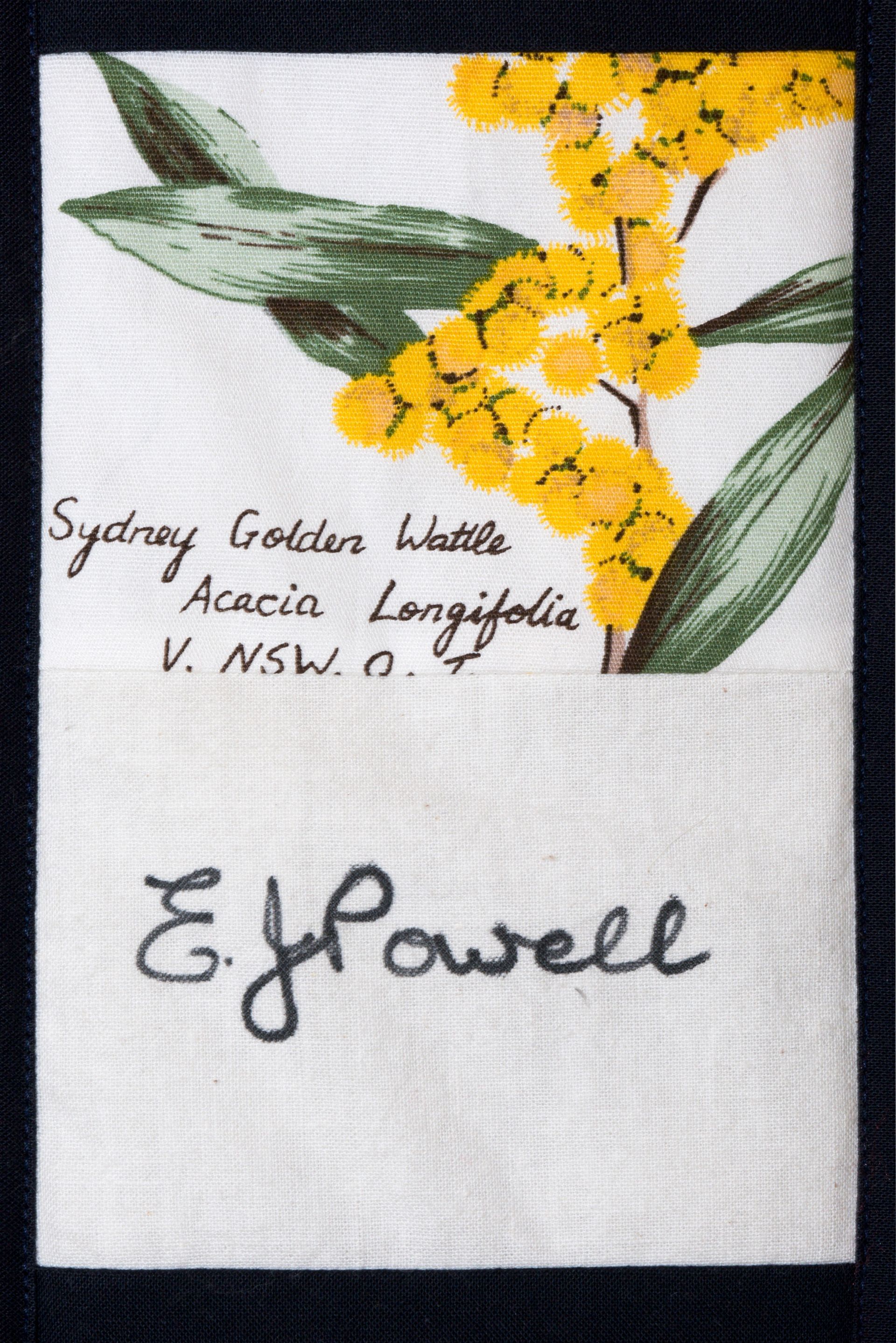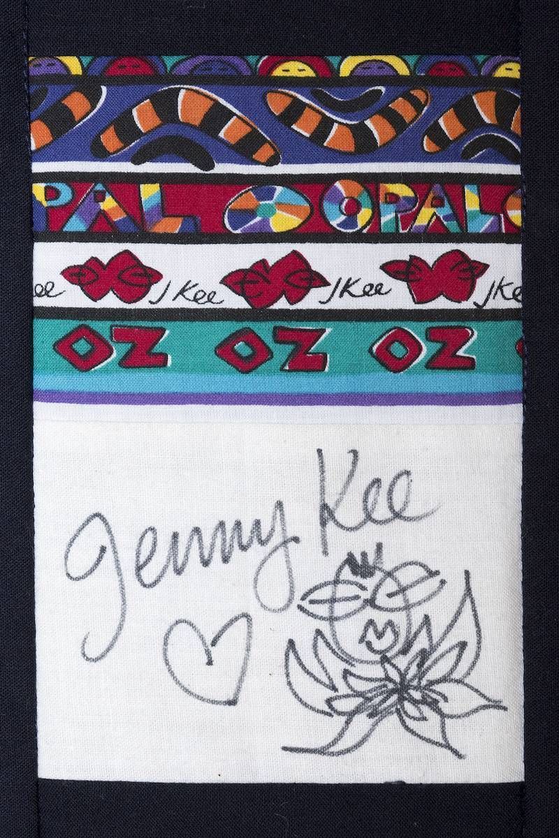 The calico rectangles are signed by Australian women who have recorded firsts or significant achievements in their fields of endeavour. The alternate patches of patterned fabric were selected to illustrate the signatories profession or achievement.