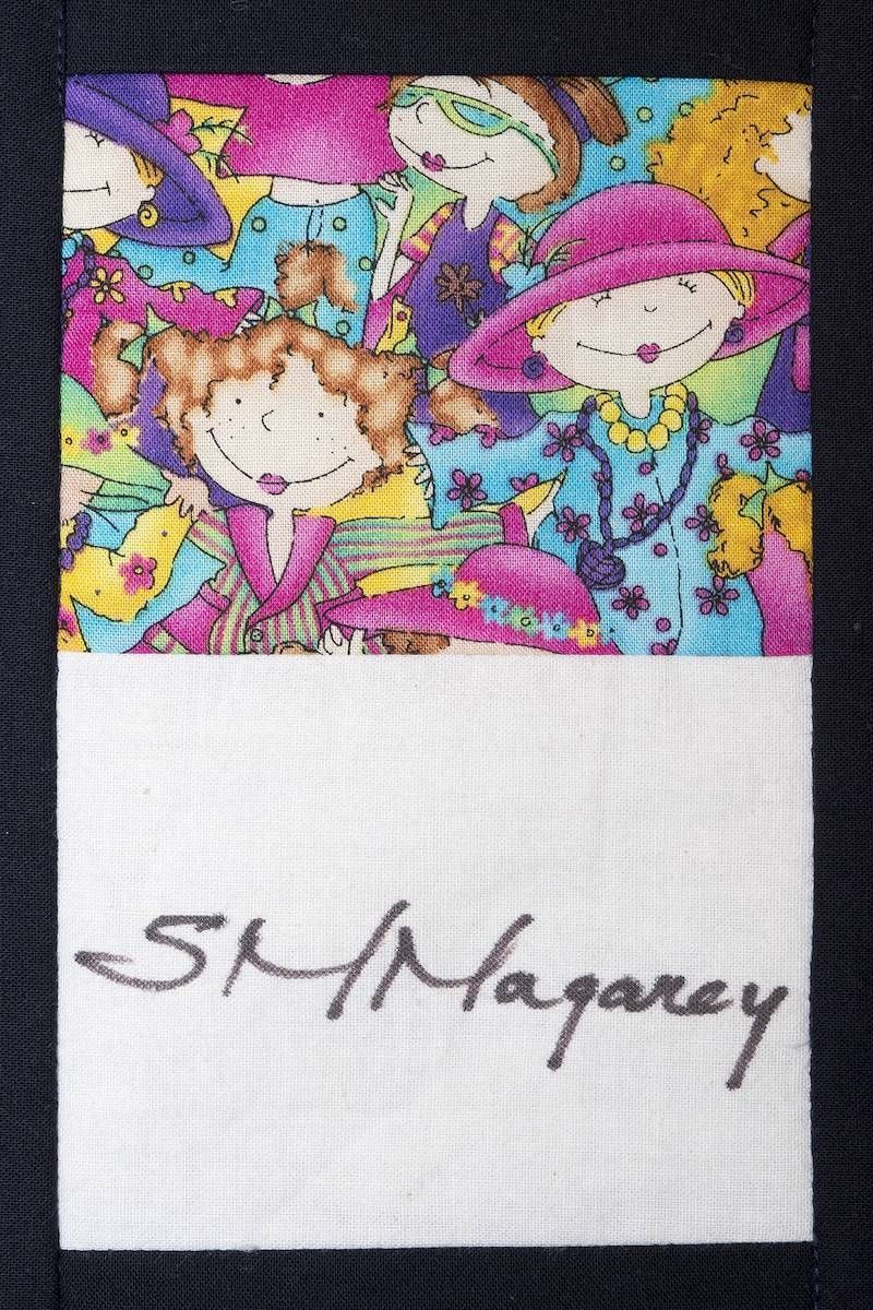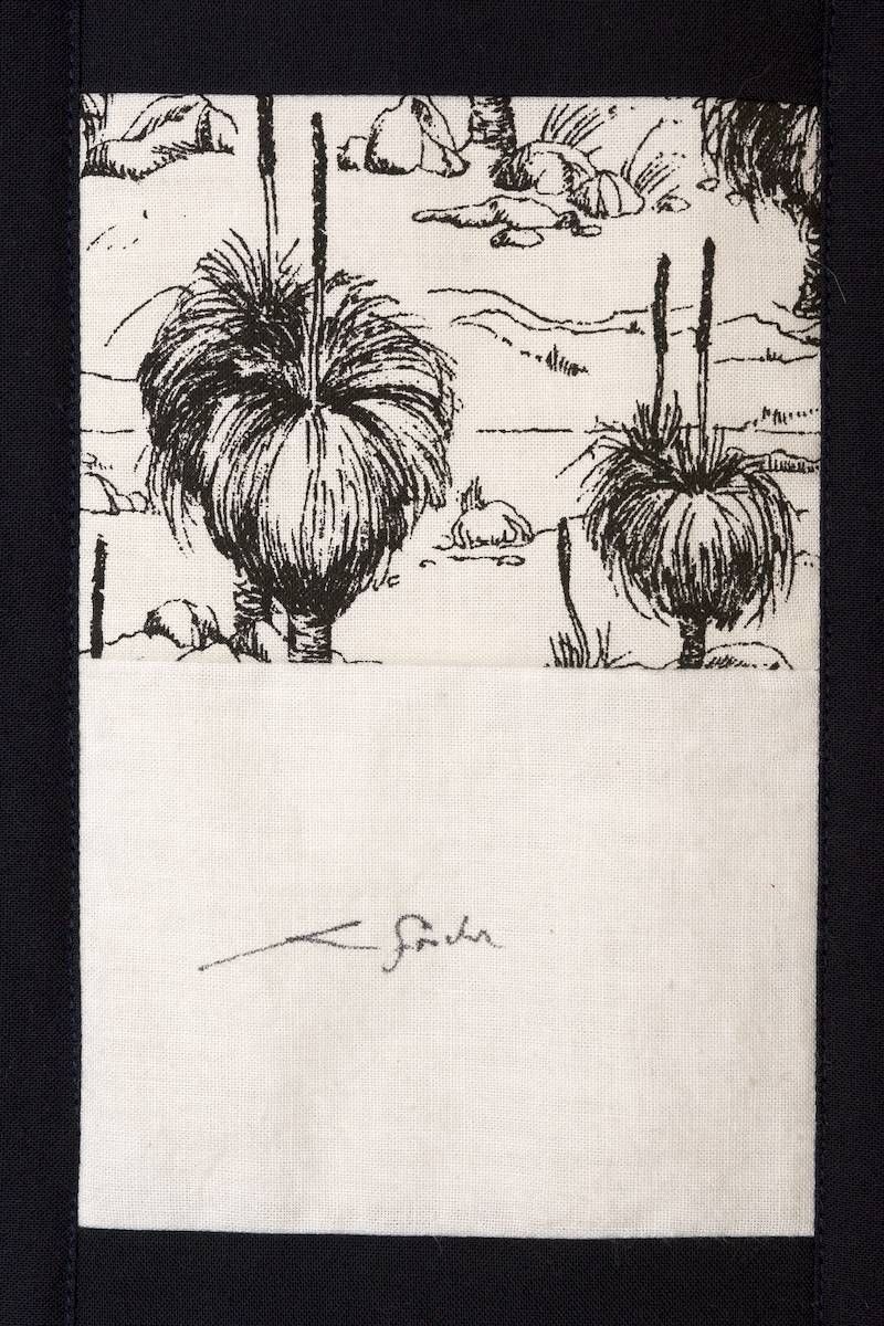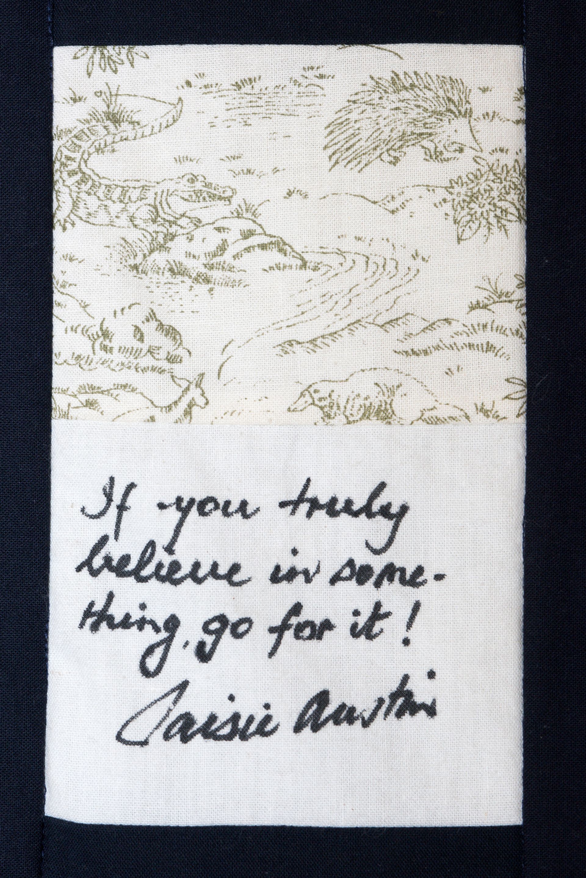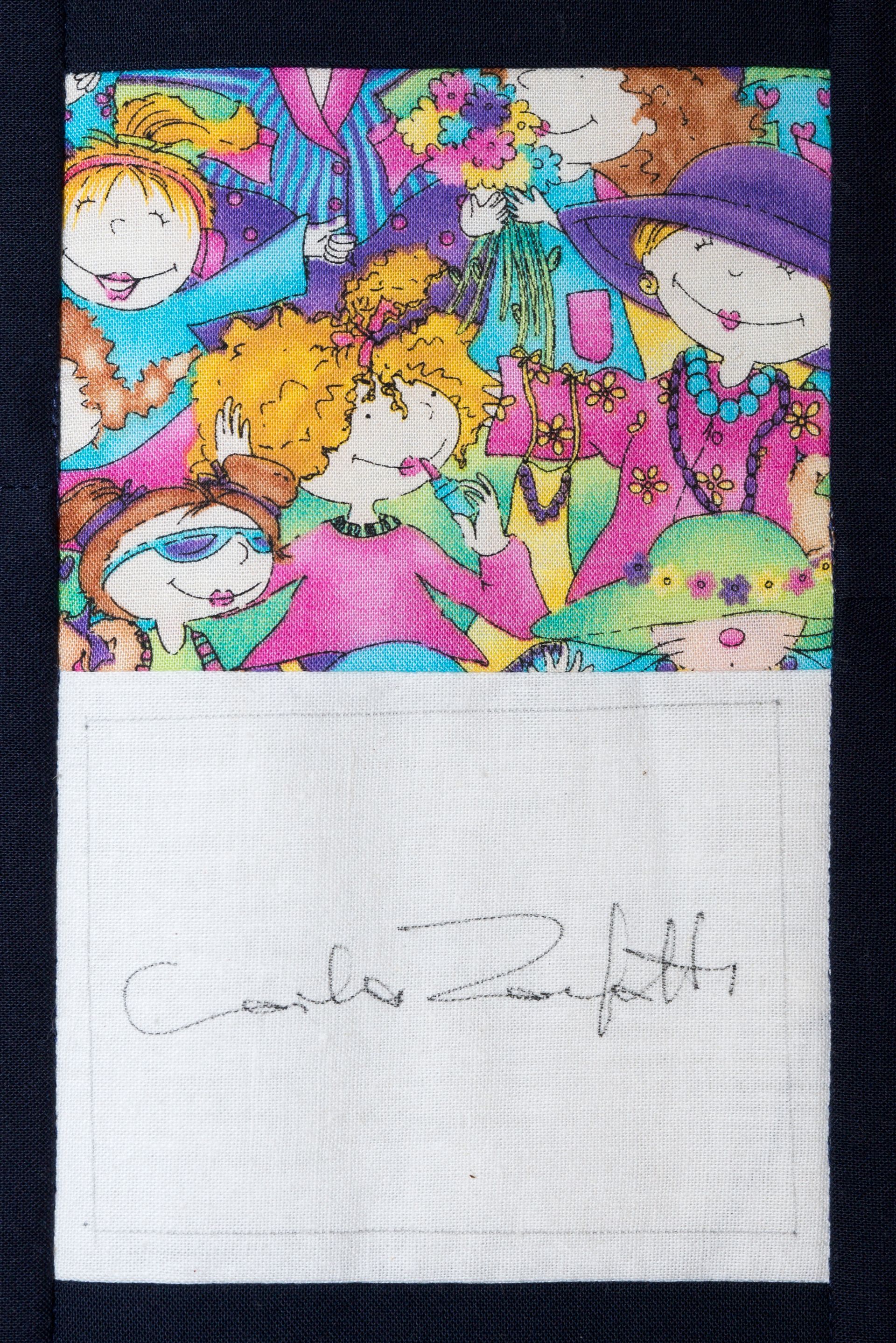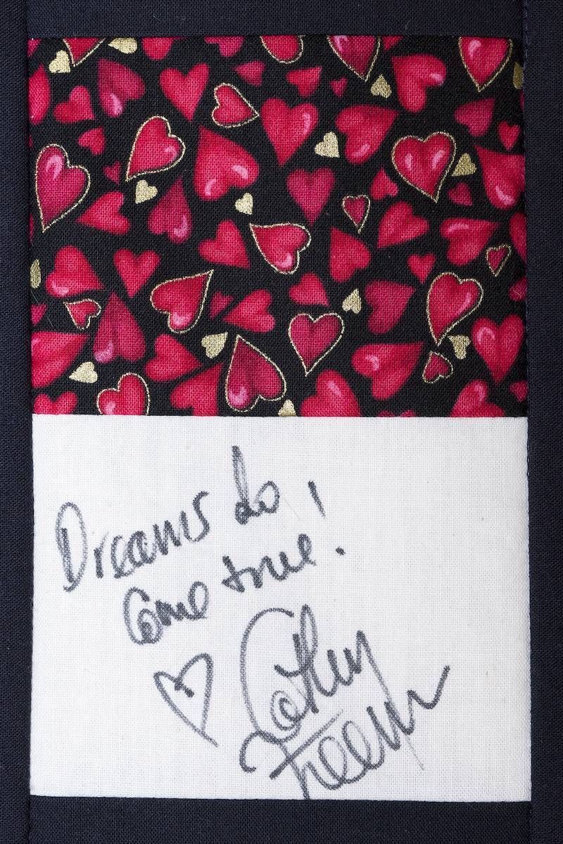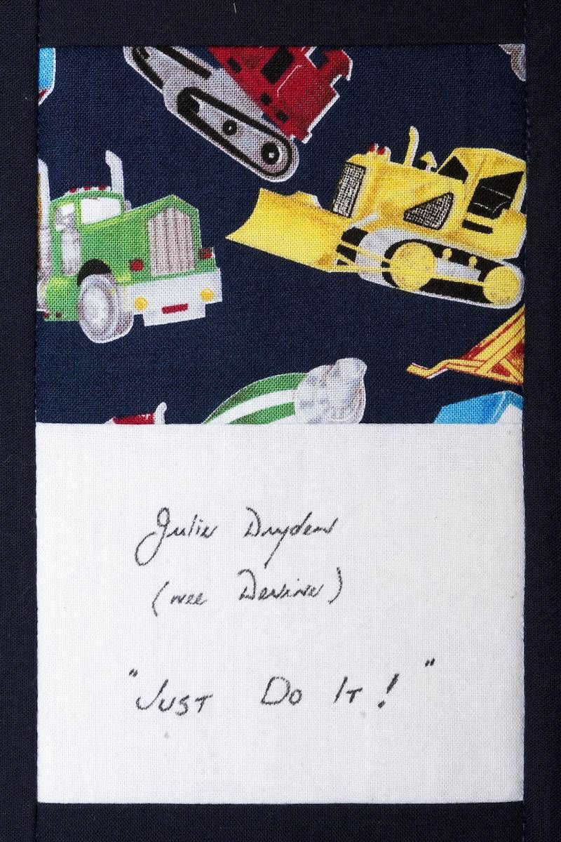 The calico rectangles are signed by Australian women who have recorded firsts or significant achievements in their fields of endeavour. The alternate patches of patterned fabric were selected to illustrate the signatories profession or achievement.