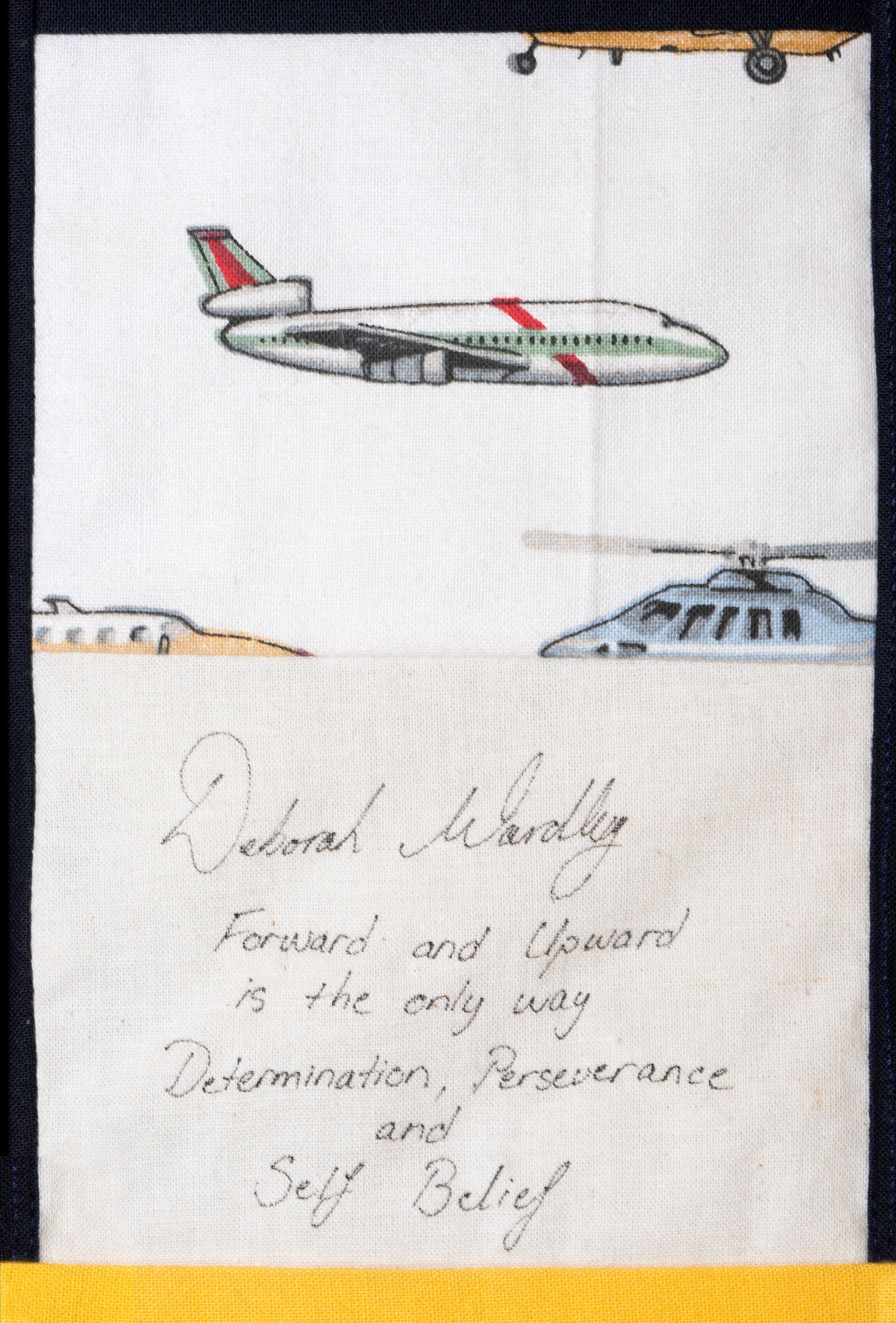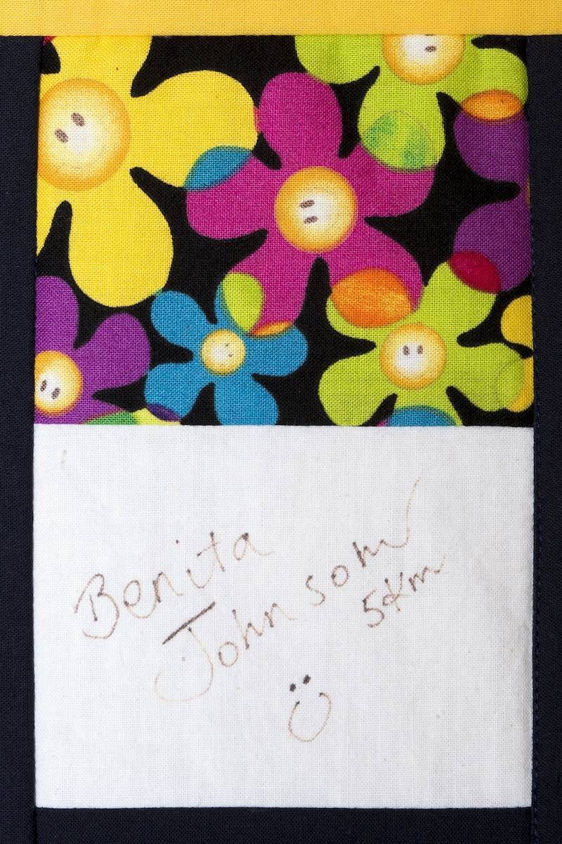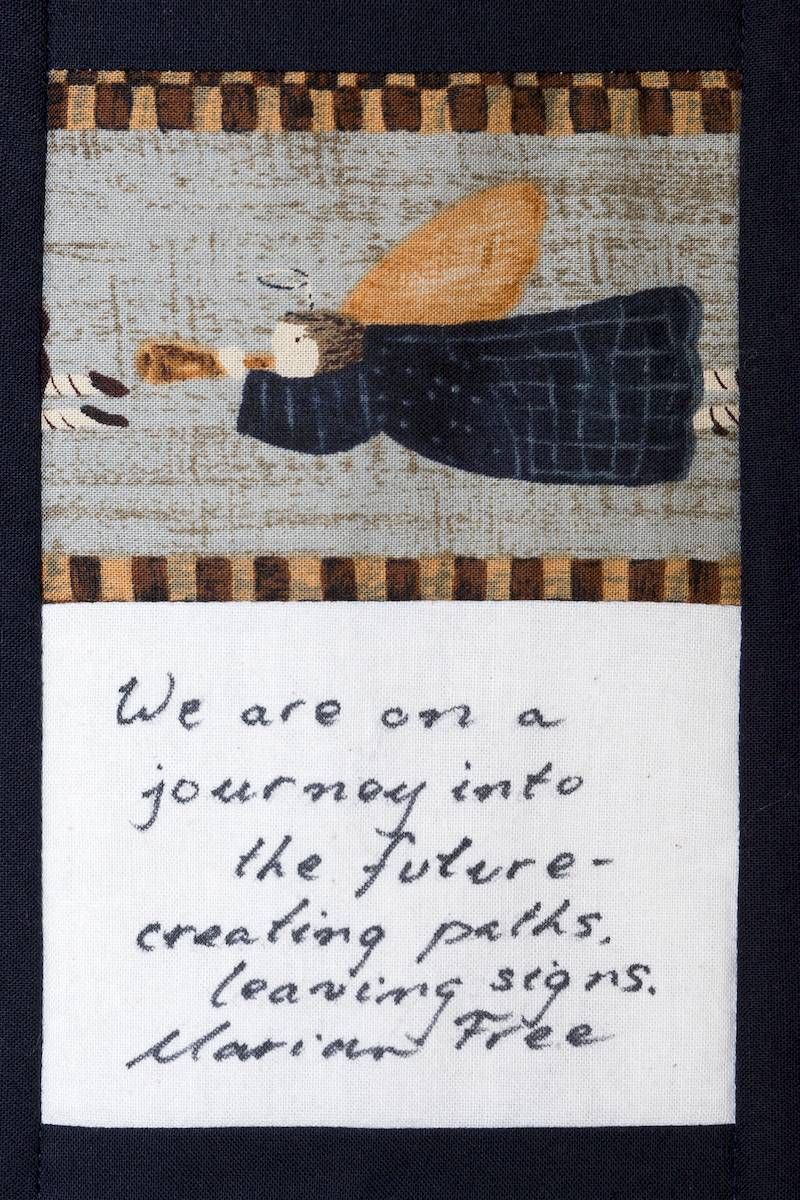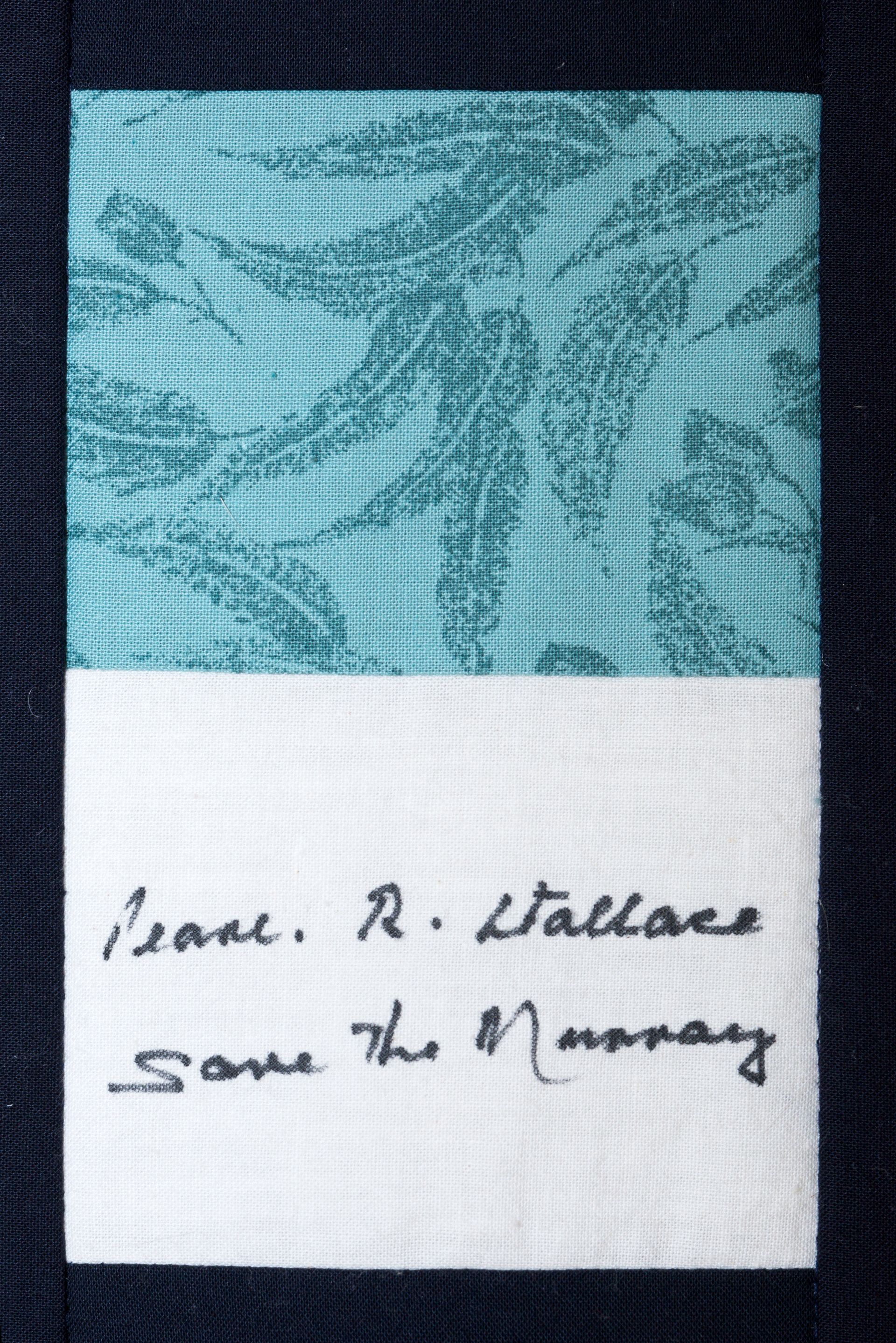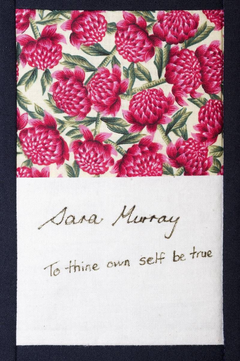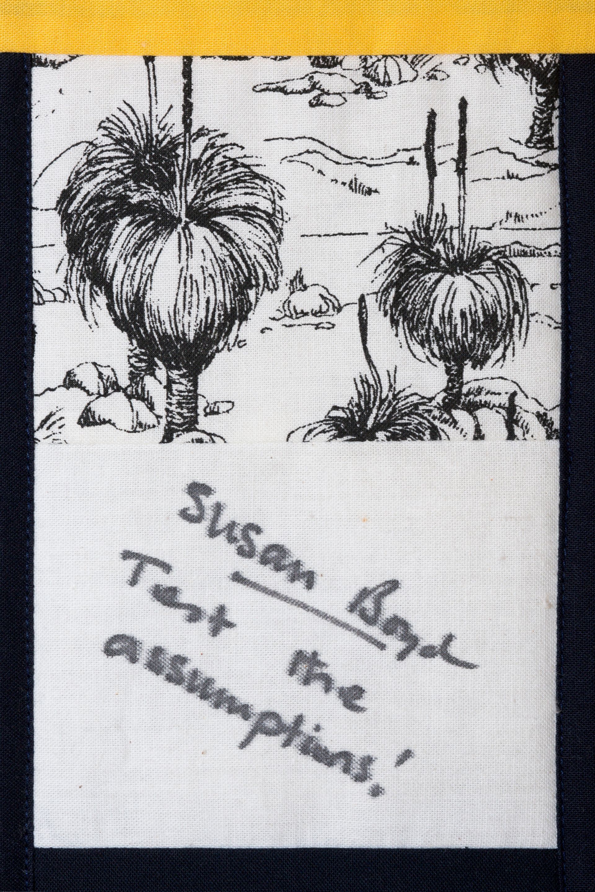 The calico rectangles are signed by Australian women who have recorded firsts or significant achievements in their fields of endeavour. The alternate patches of patterned fabric were selected to illustrate the signatories profession or achievement.