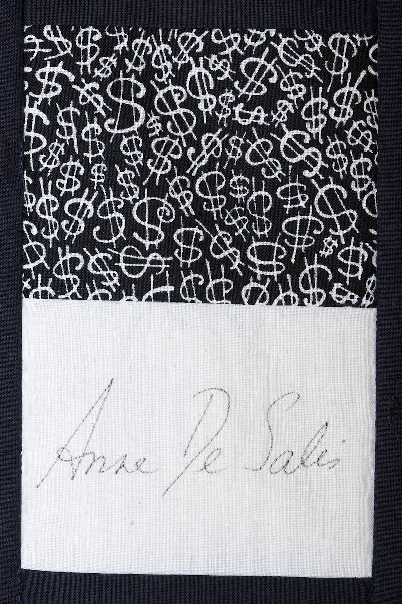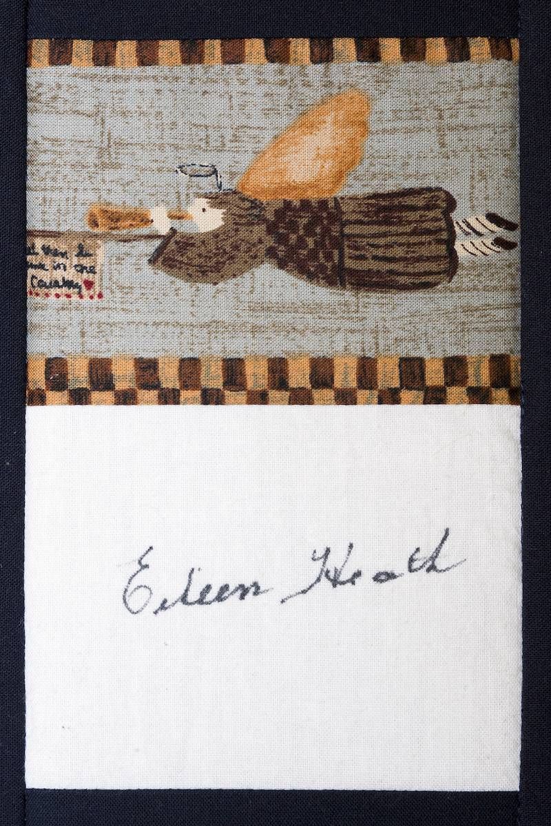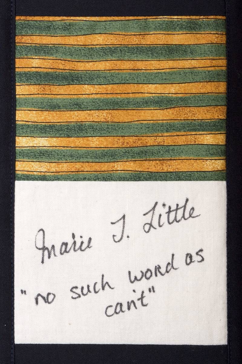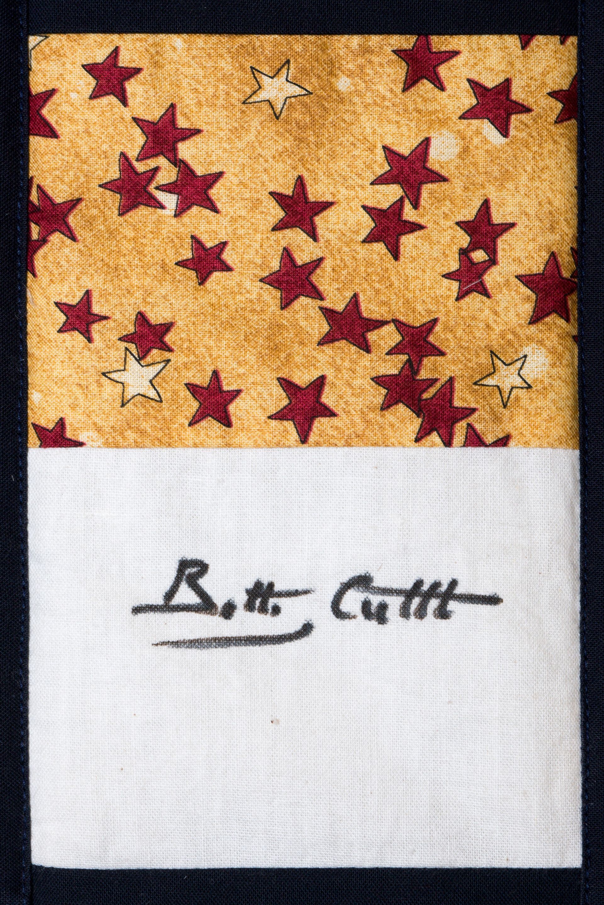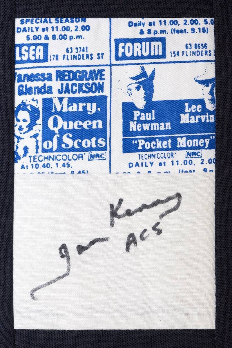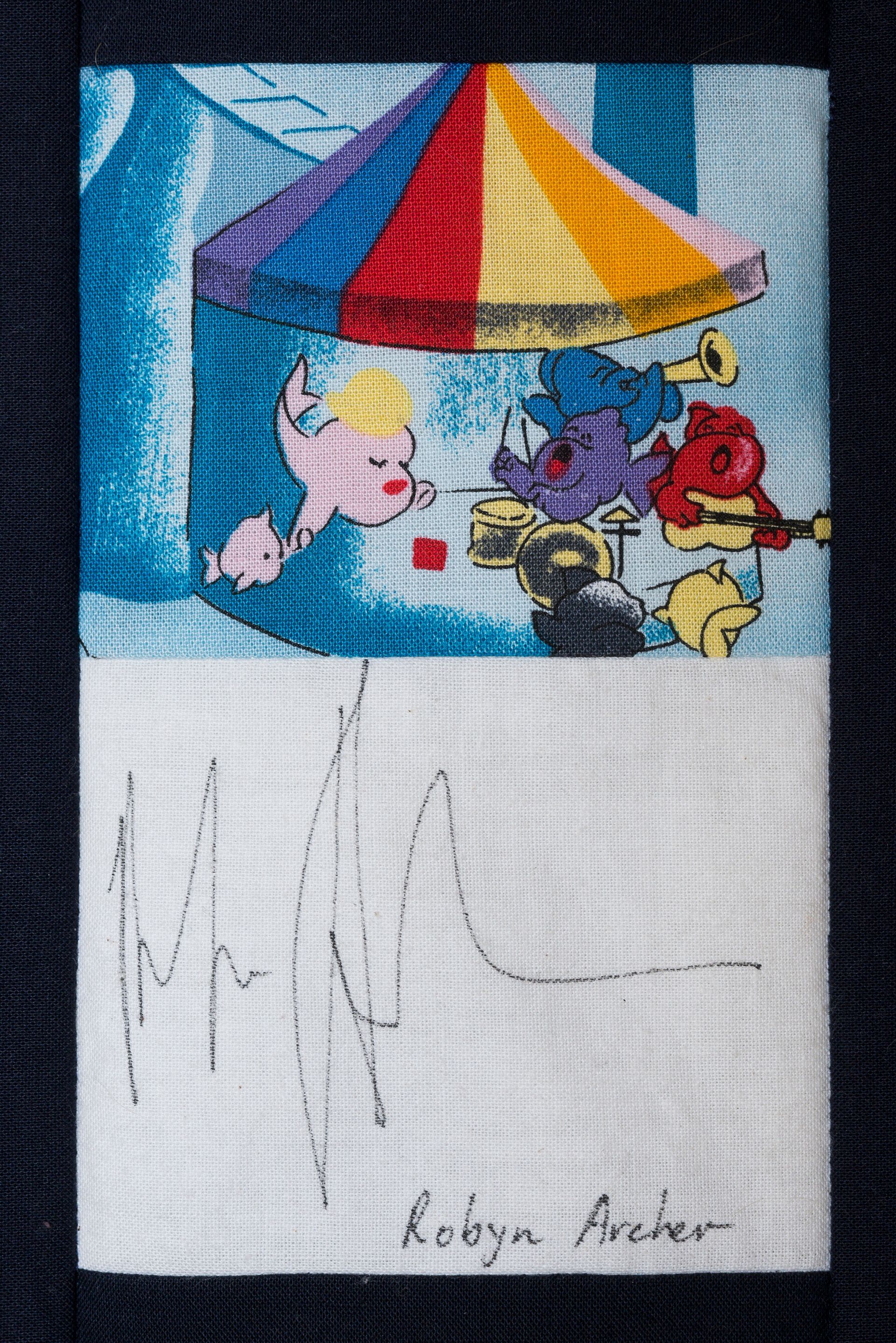 The calico rectangles are signed by Australian women who have recorded firsts or significant achievements in their fields of endeavour. The alternate patches of patterned fabric were selected to illustrate the signatories profession or achievement.