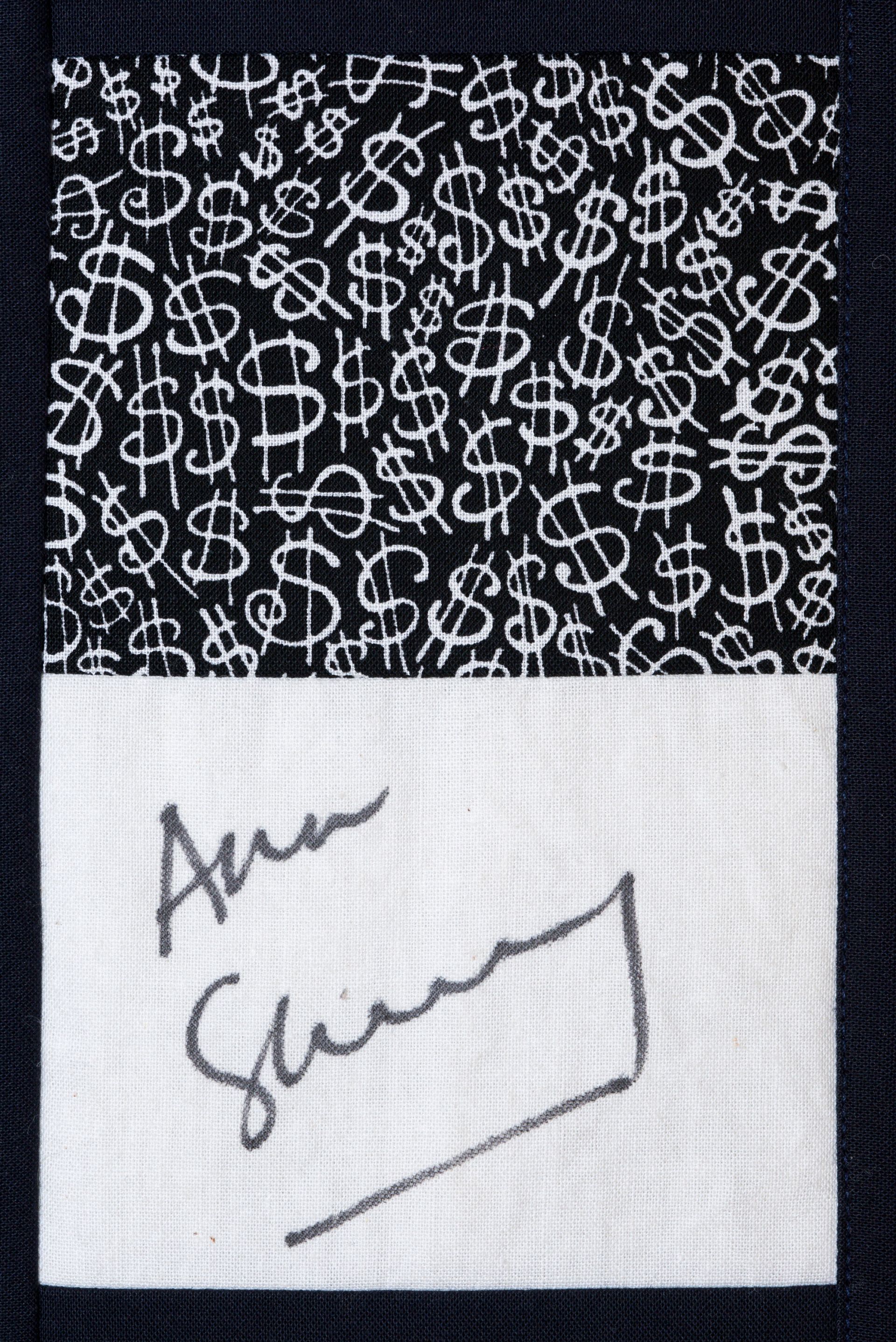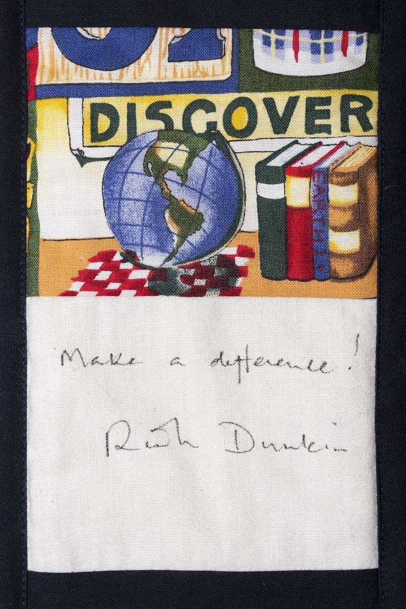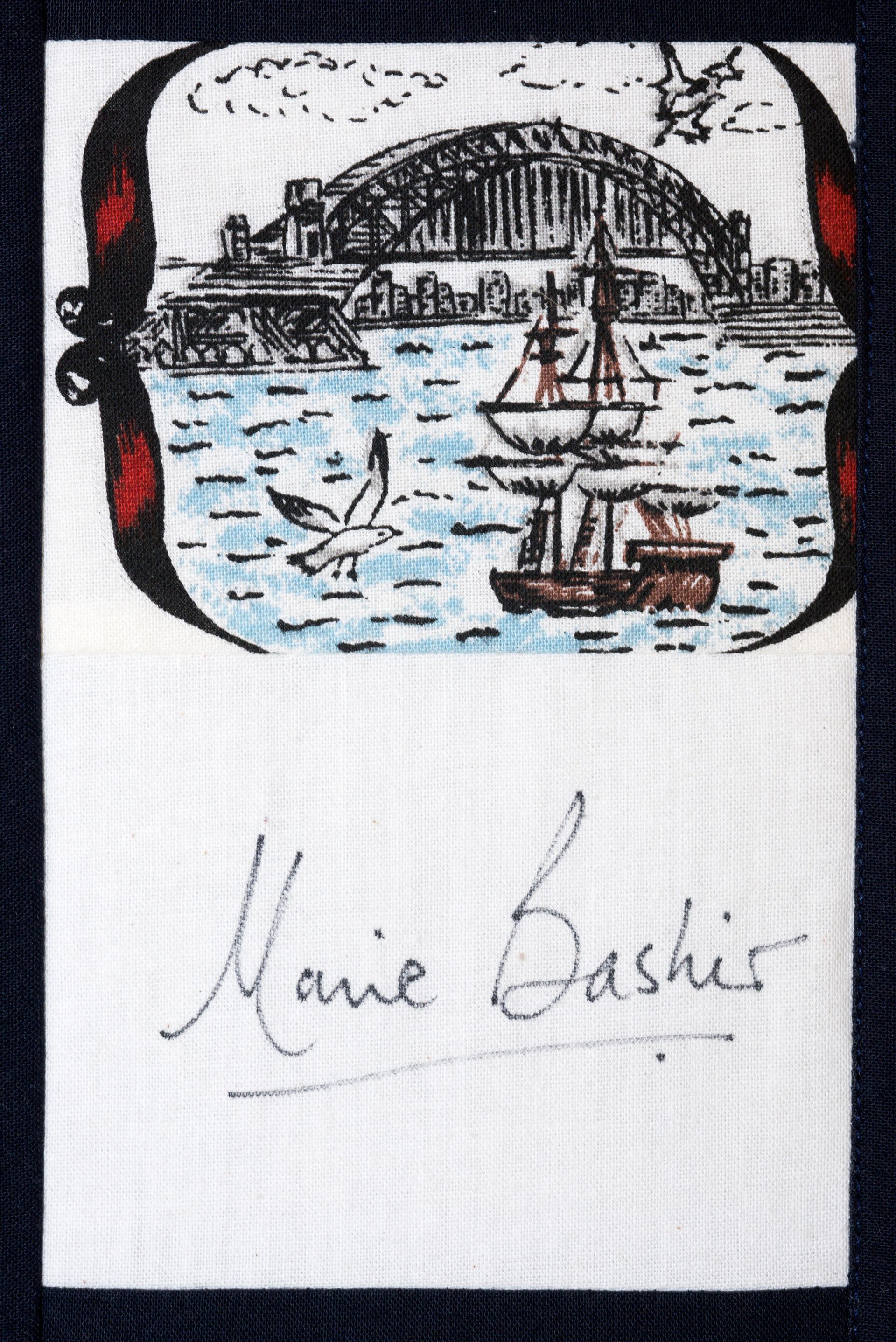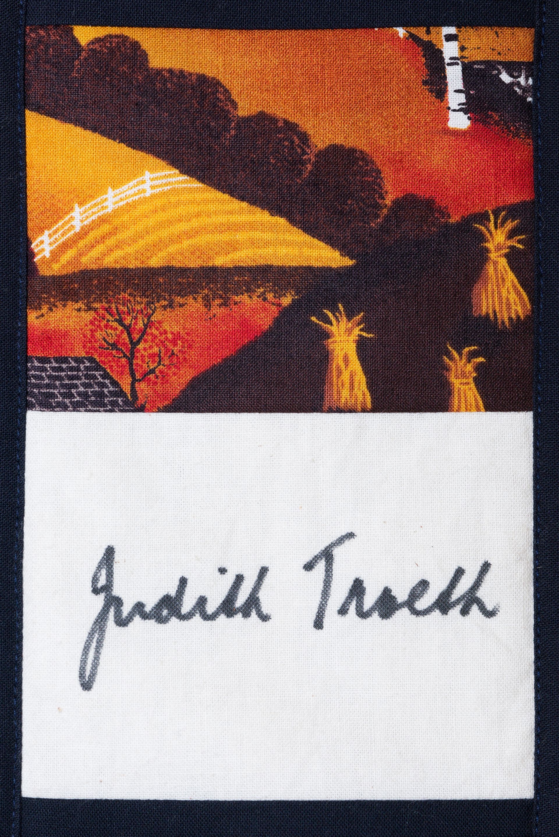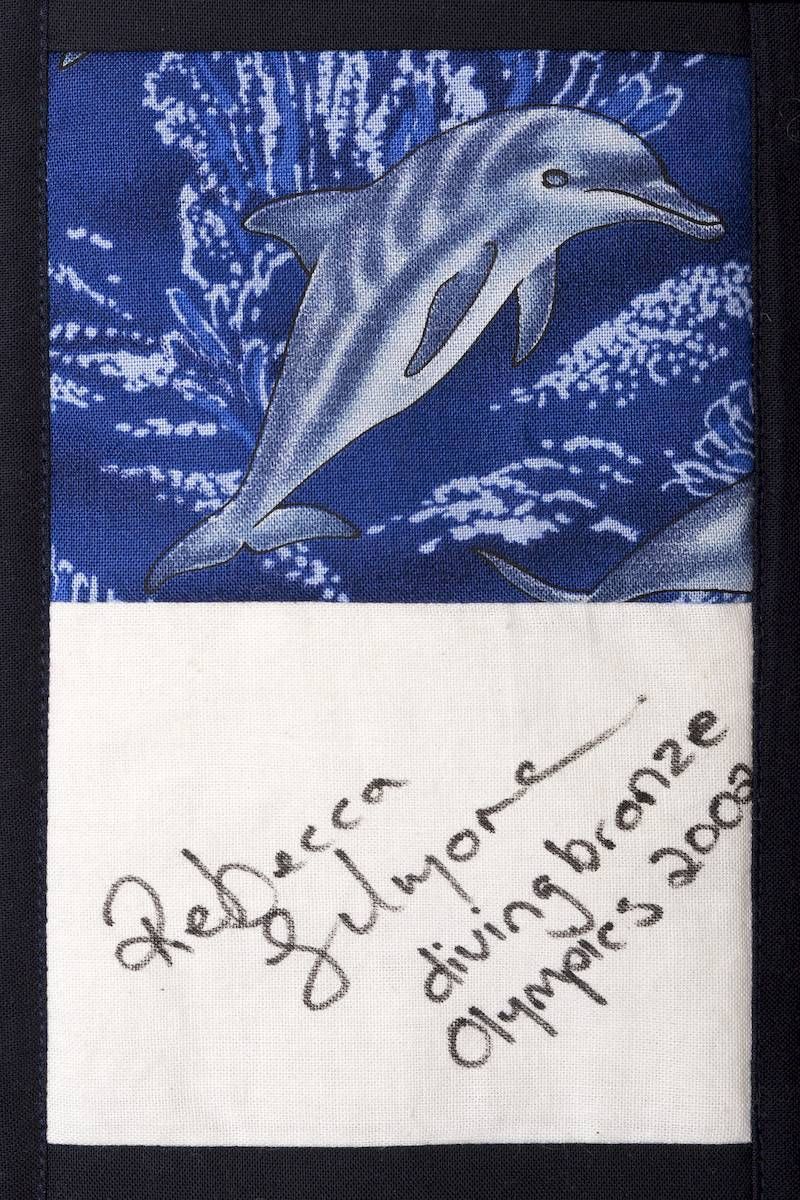 The calico rectangles are signed by Australian women who have recorded firsts or significant achievements in their fields of endeavour. The alternate patches of patterned fabric were selected to illustrate the signatories profession or achievement.