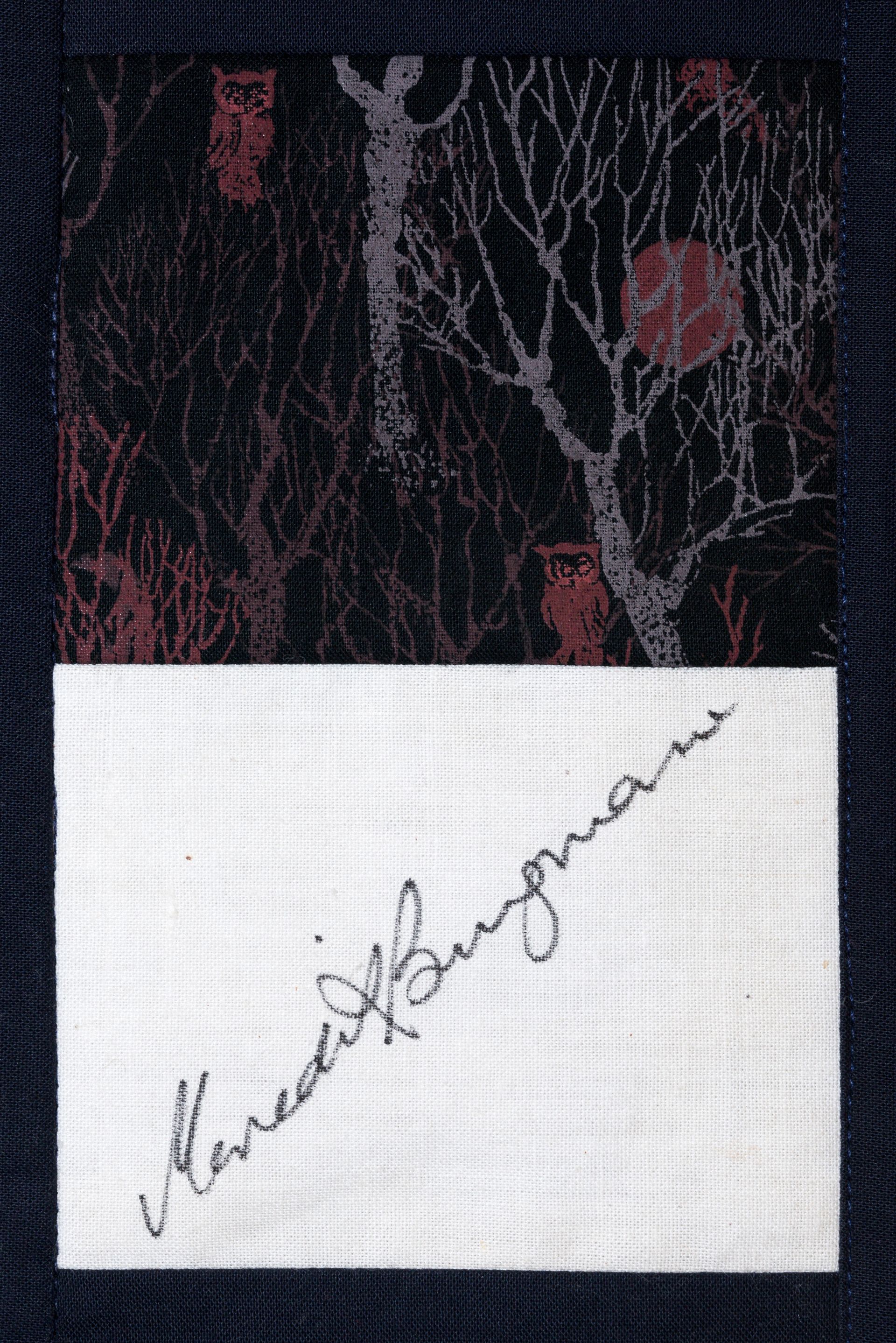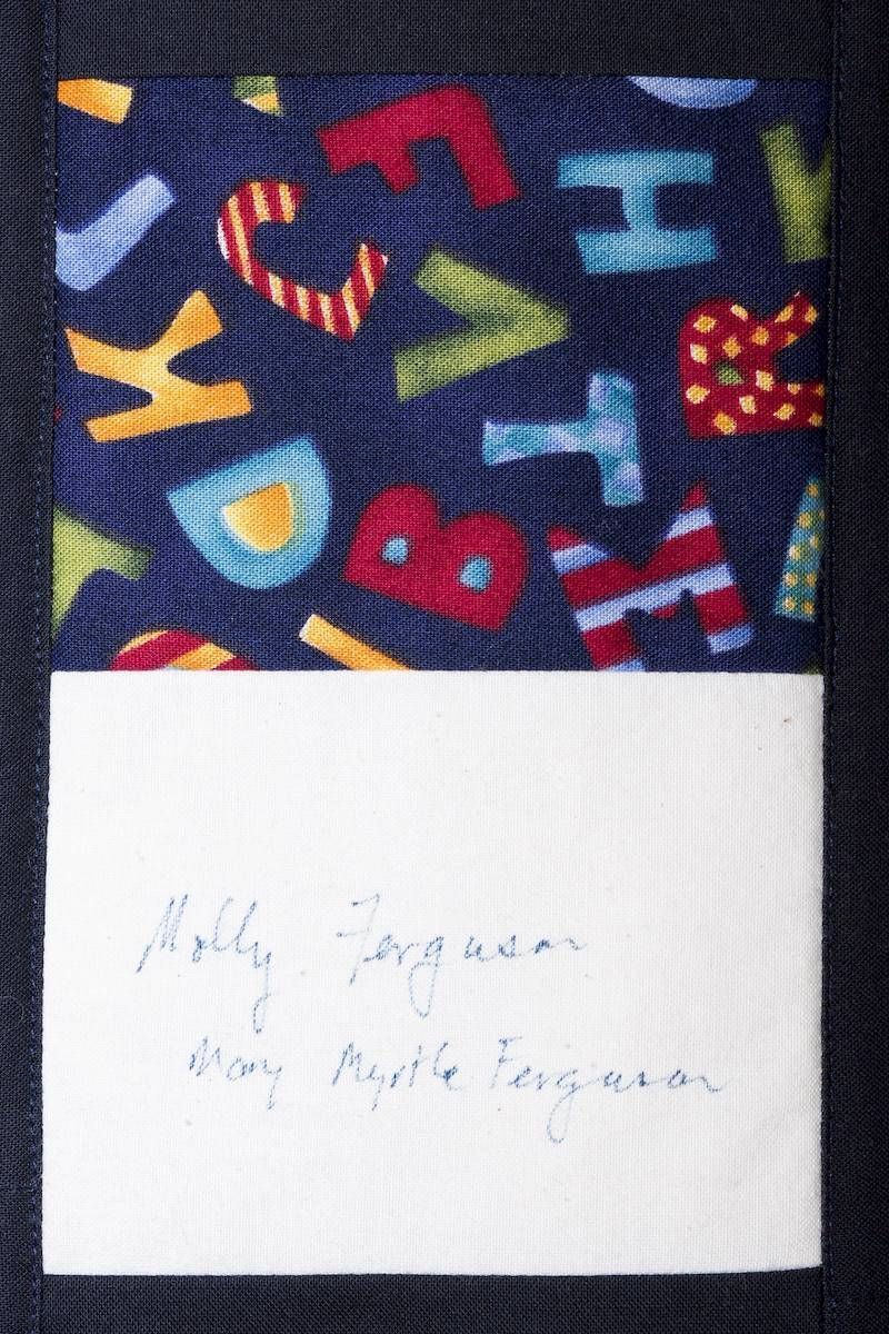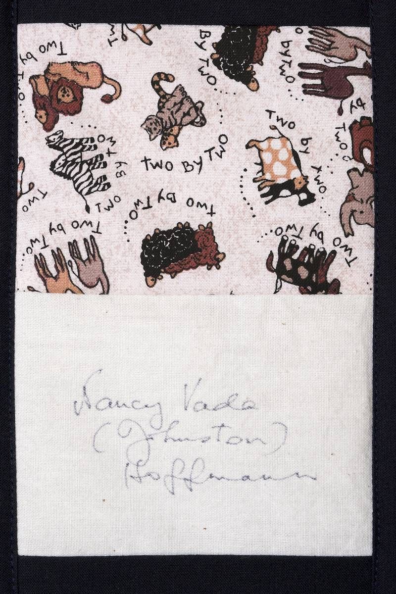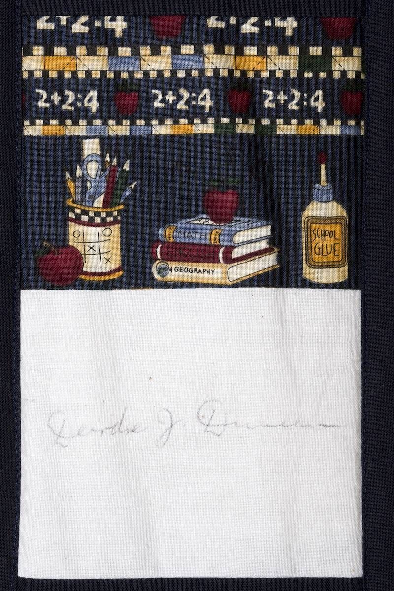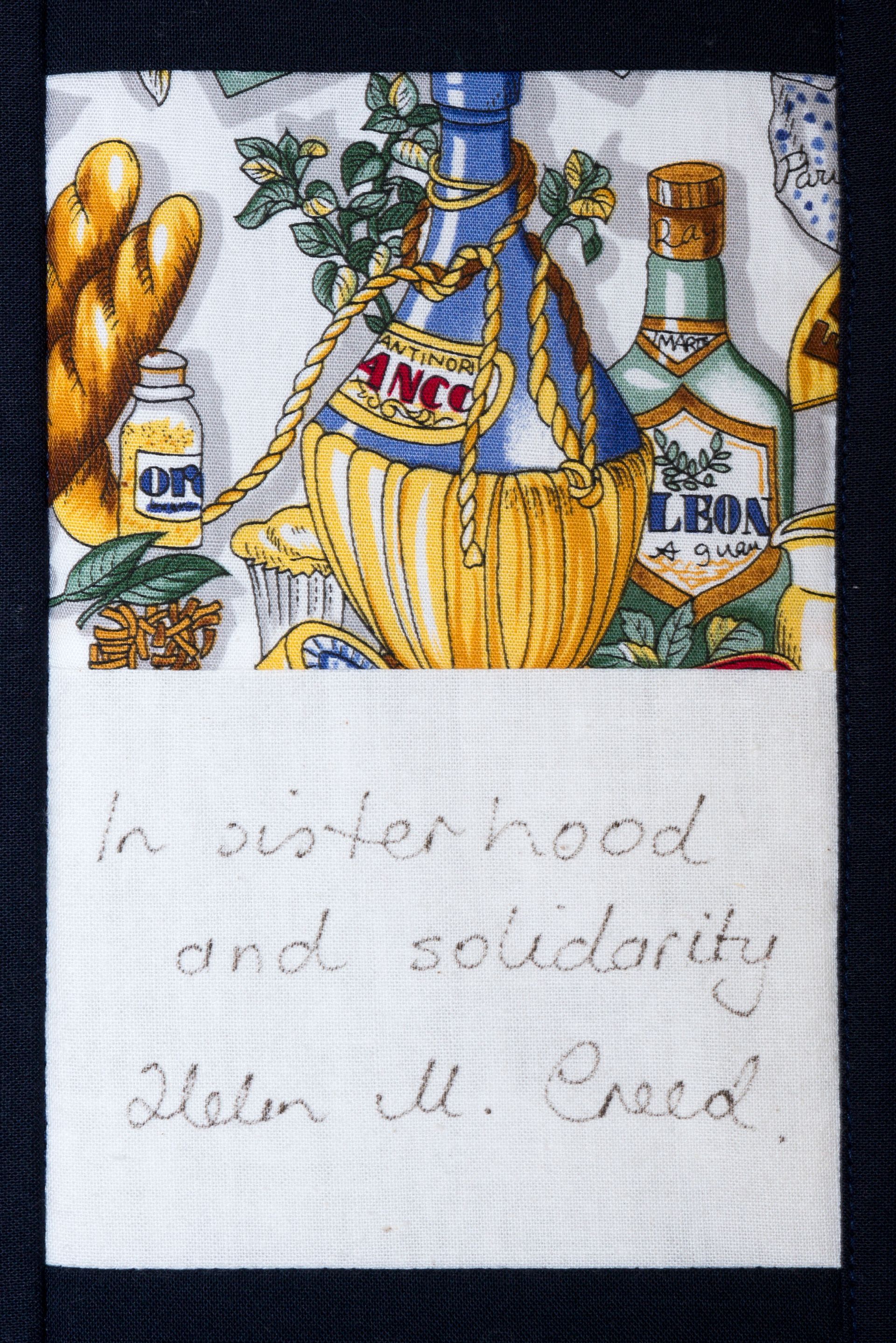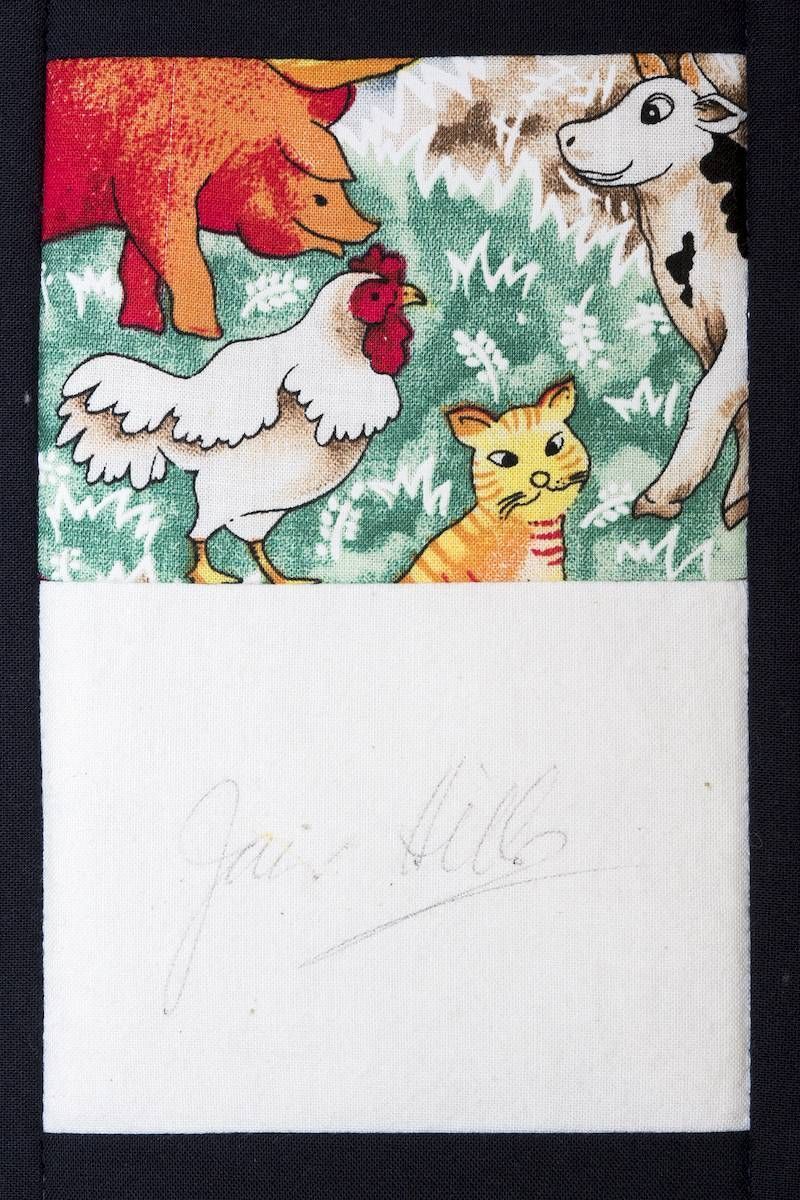 The calico rectangles are signed by Australian women who have recorded firsts or significant achievements in their fields of endeavour. The alternate patches of patterned fabric were selected to illustrate the signatories profession or achievement.