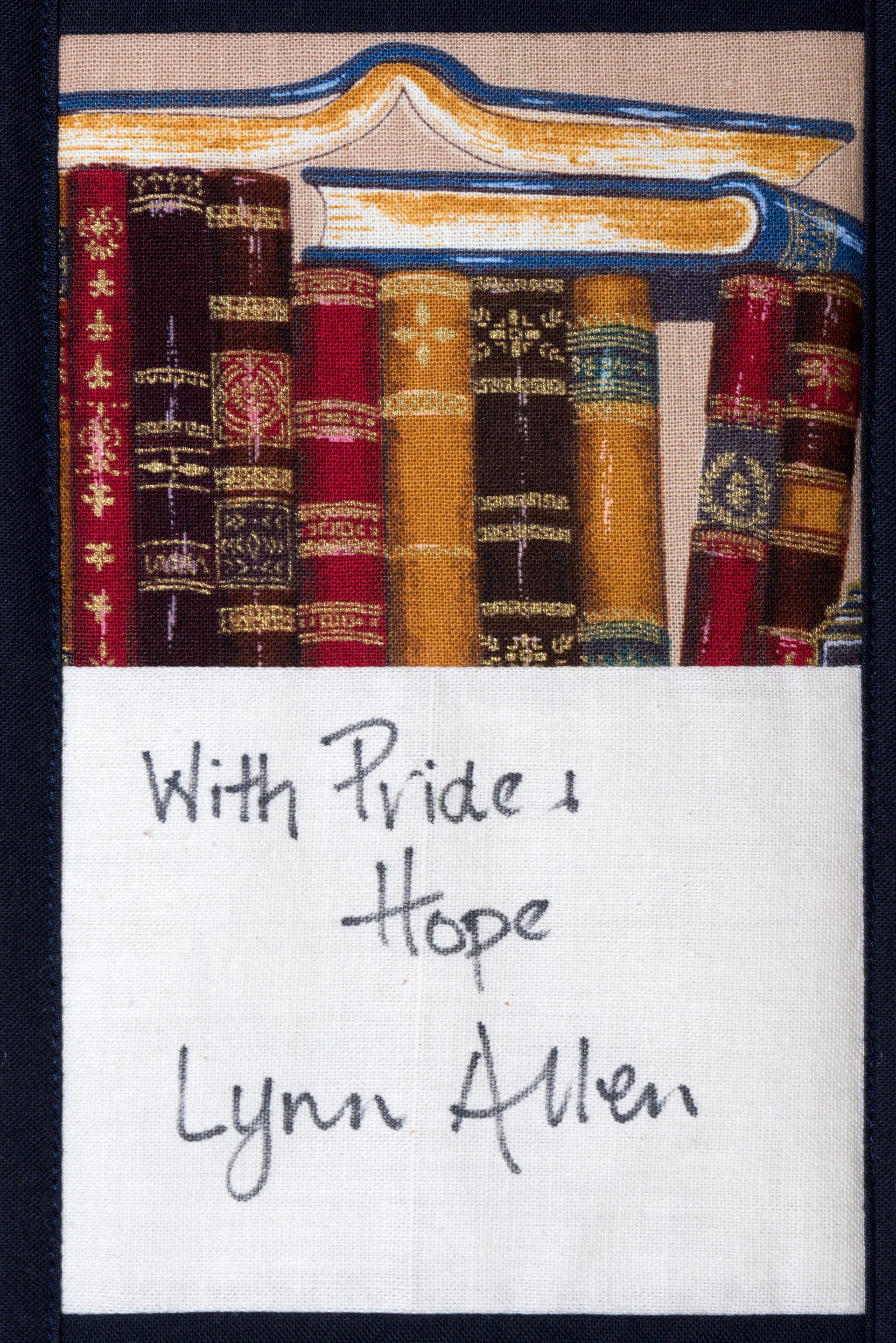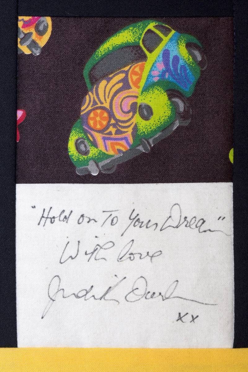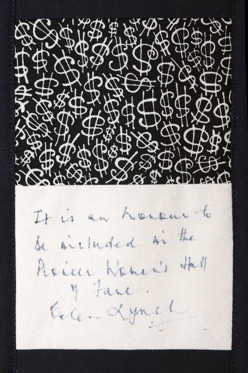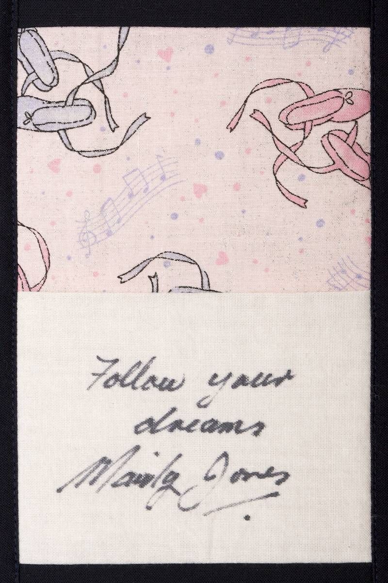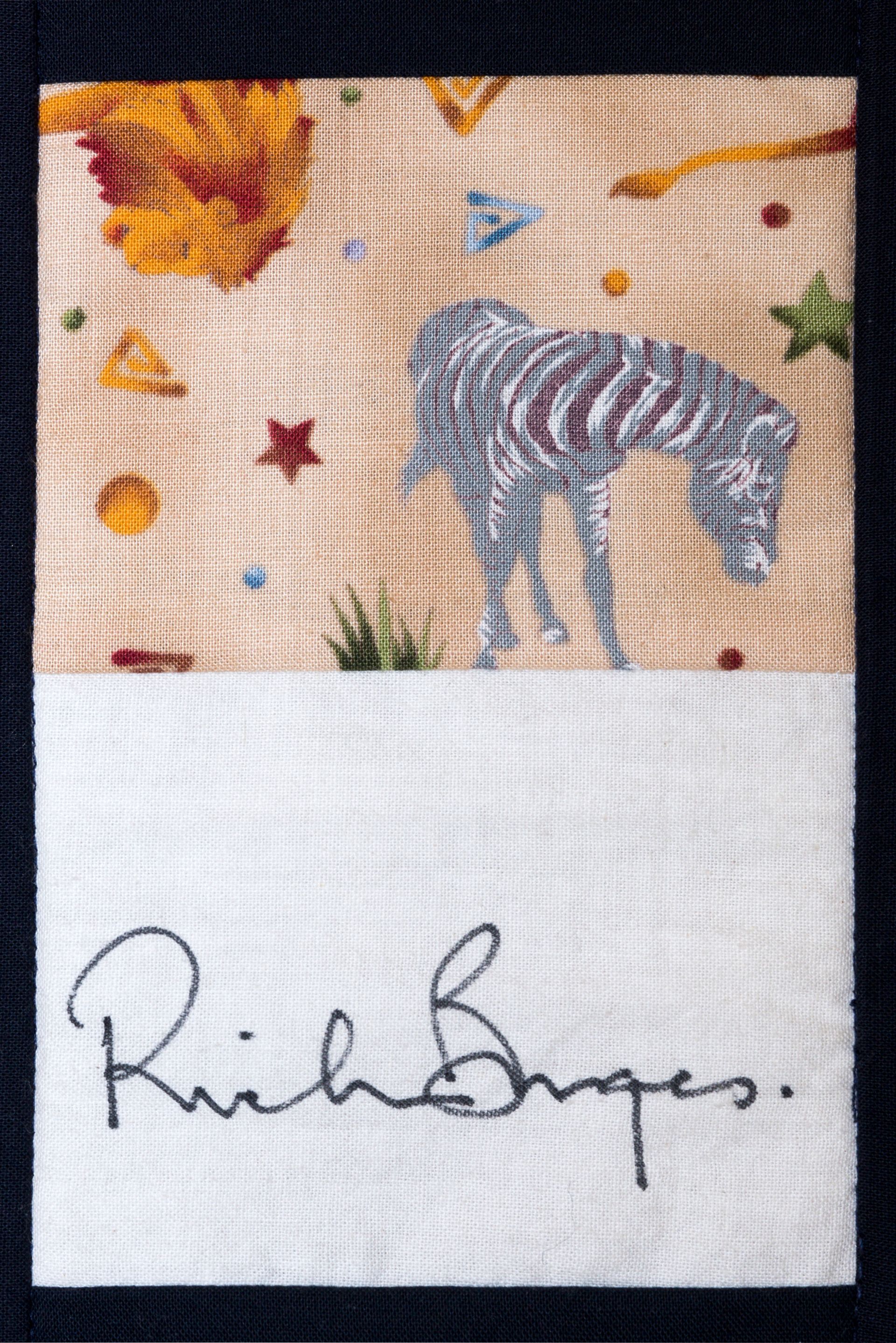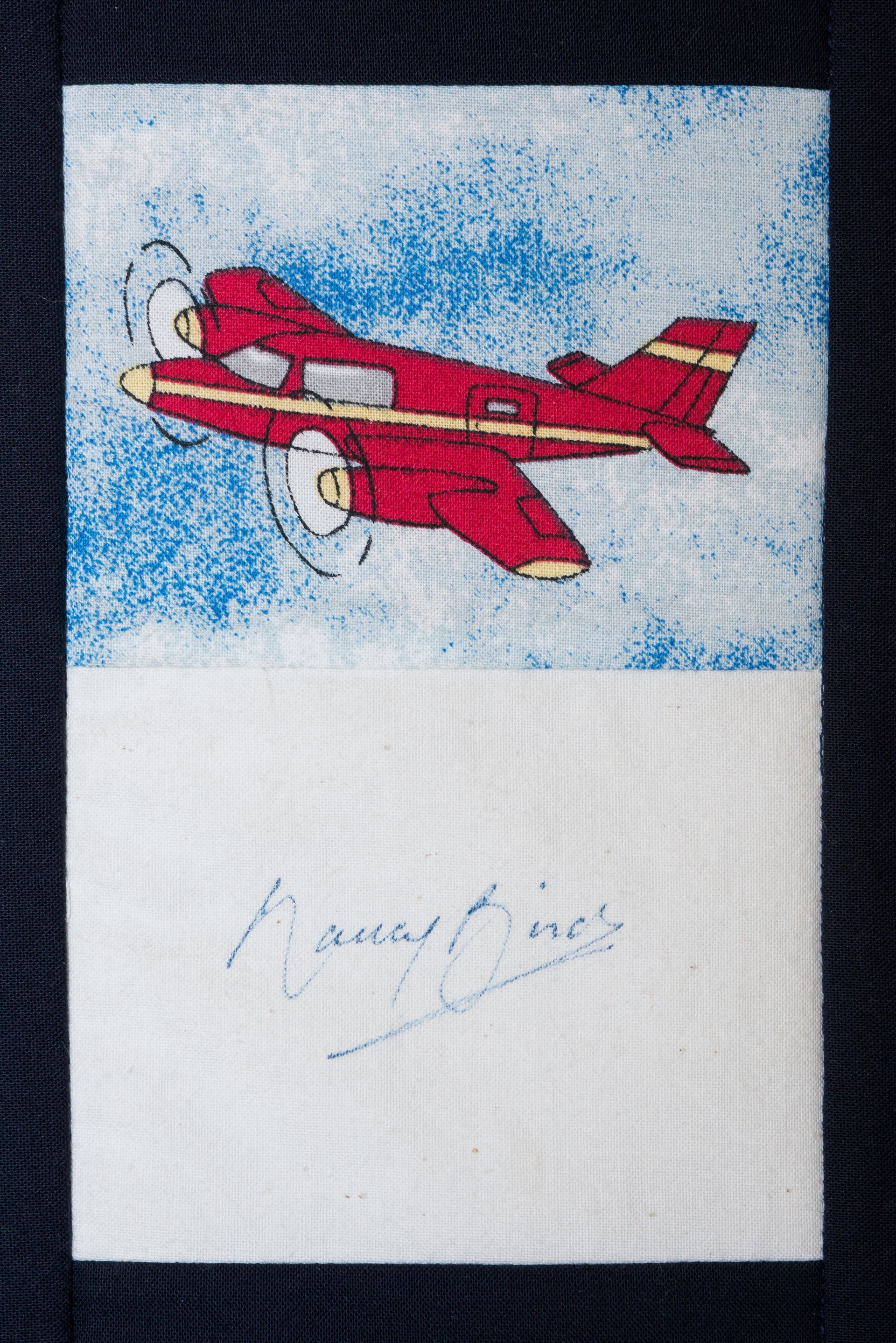 The calico rectangles are signed by Australian women who have recorded firsts or significant achievements in their fields of endeavour. The alternate patches of patterned fabric were selected to illustrate the signatories profession or achievement.
