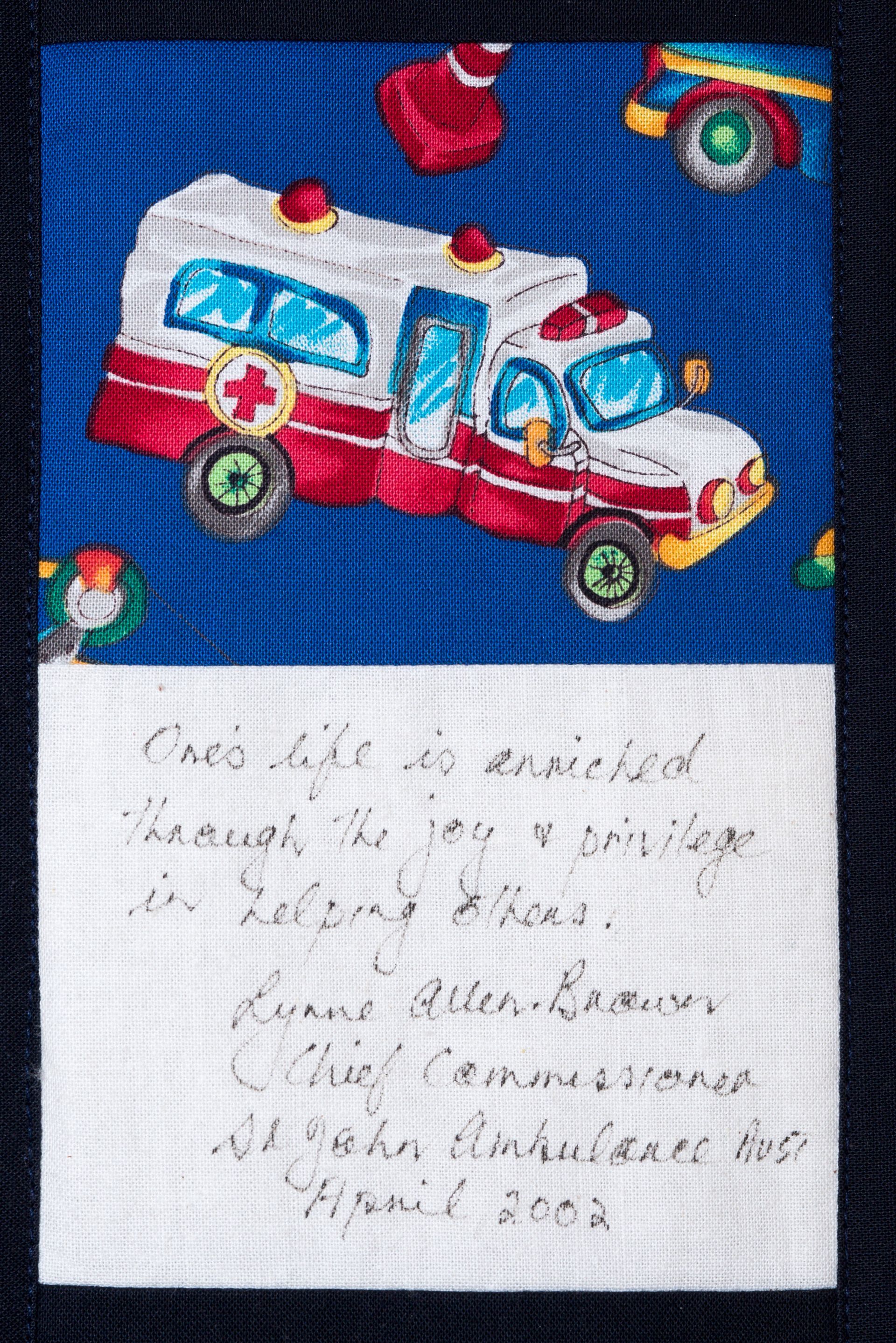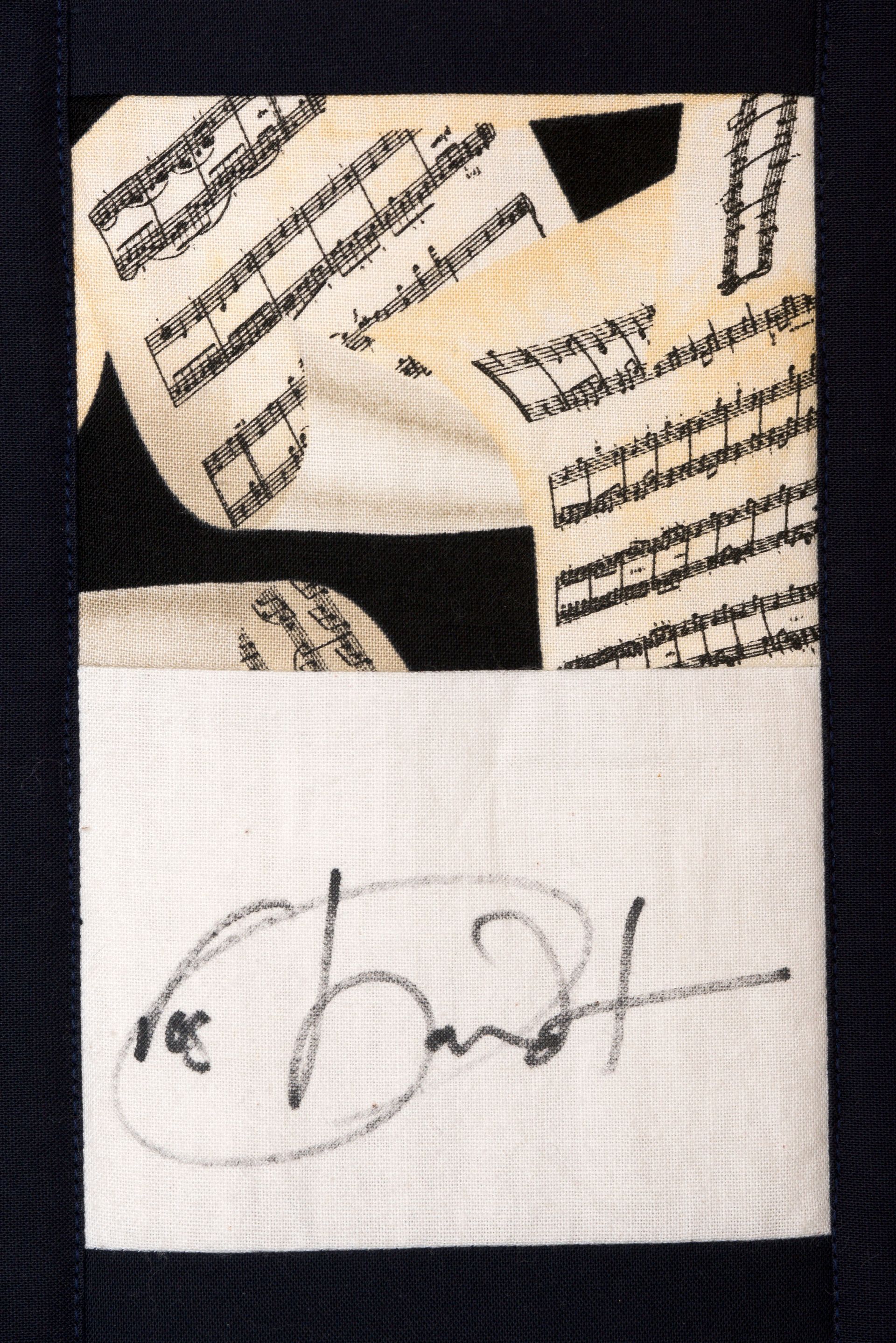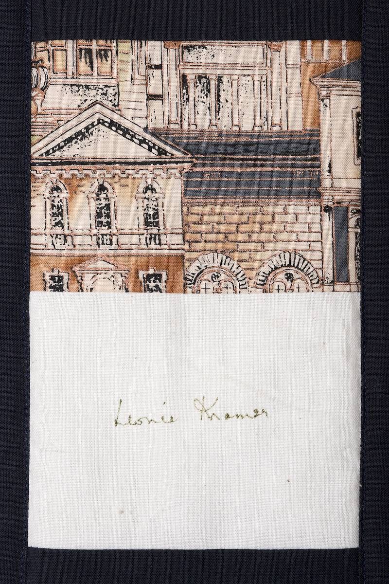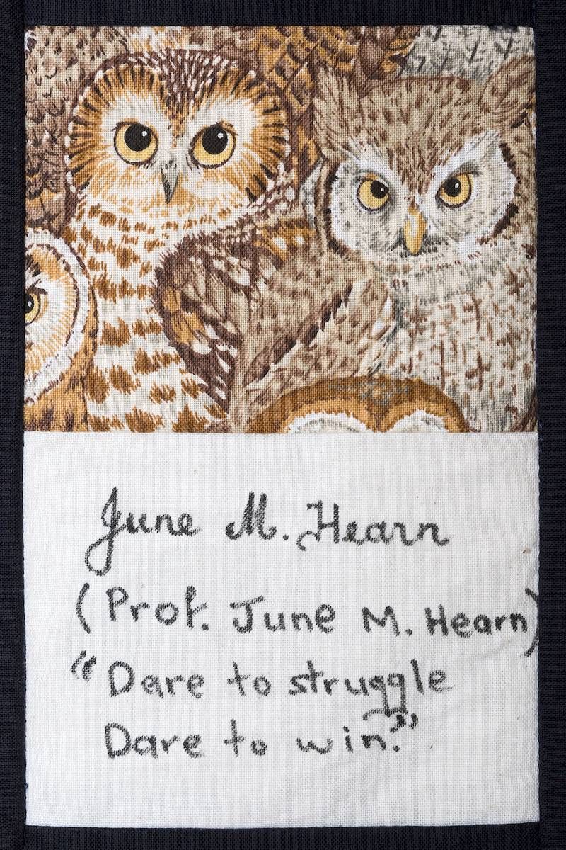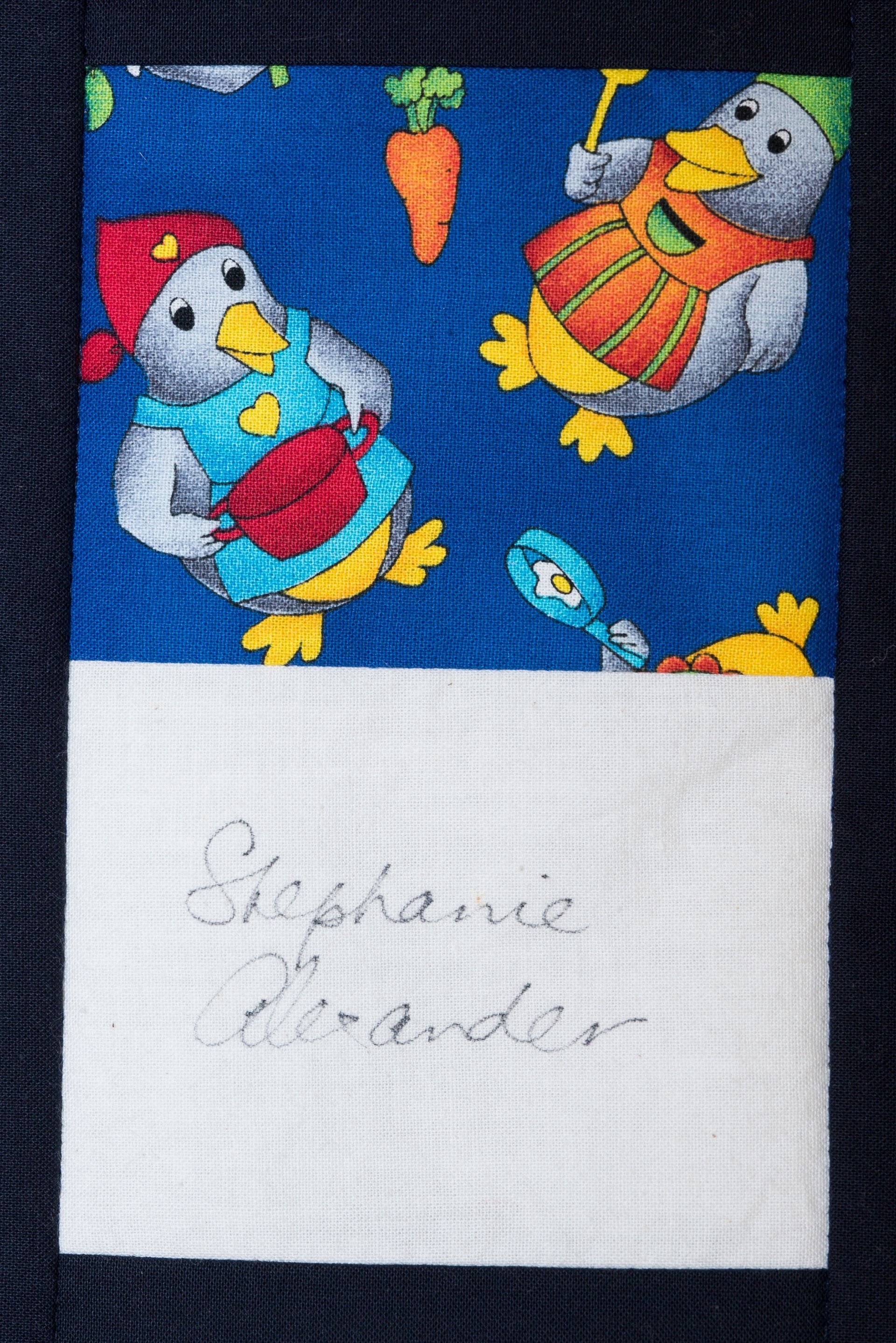 The calico rectangles are signed by Australian women who have recorded firsts or significant achievements in their fields of endeavour. The alternate patches of patterned fabric were selected to illustrate the signatories profession or achievement.